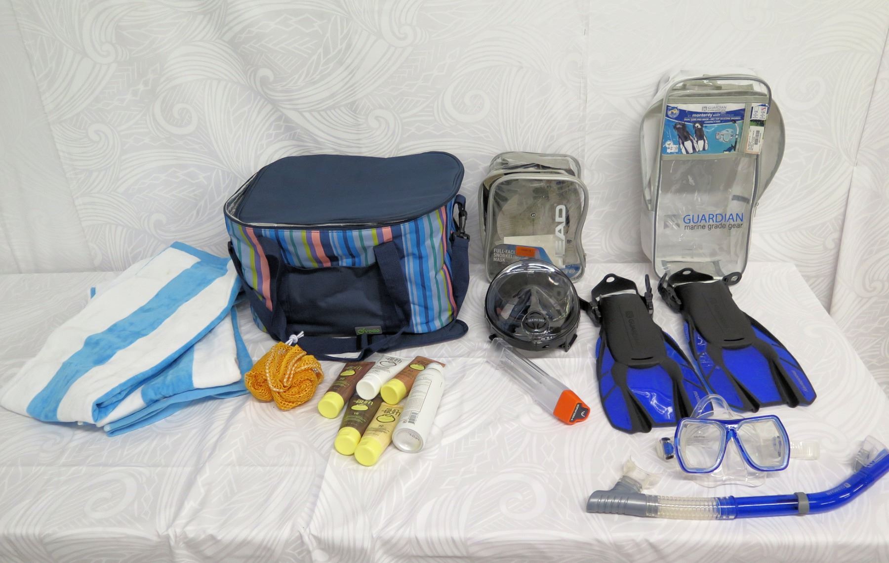 Beach Lot: Fins, Snorkels, Masks, Lotions, Towels, Cooler Bag, etc