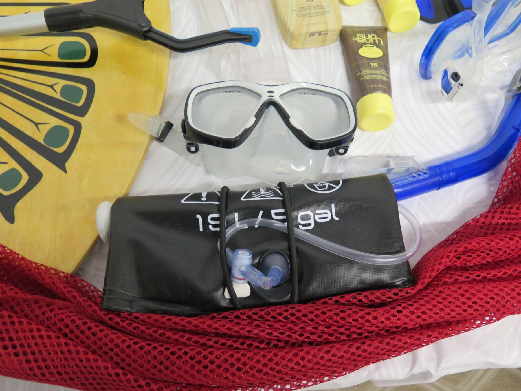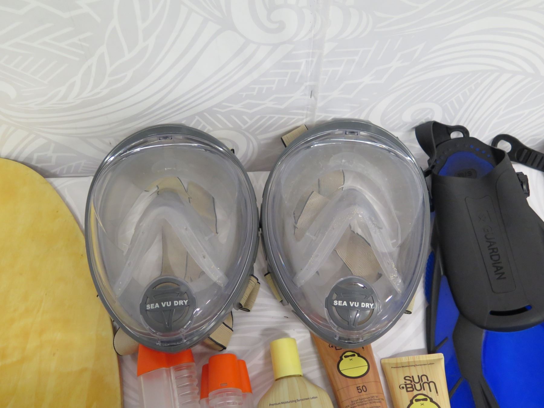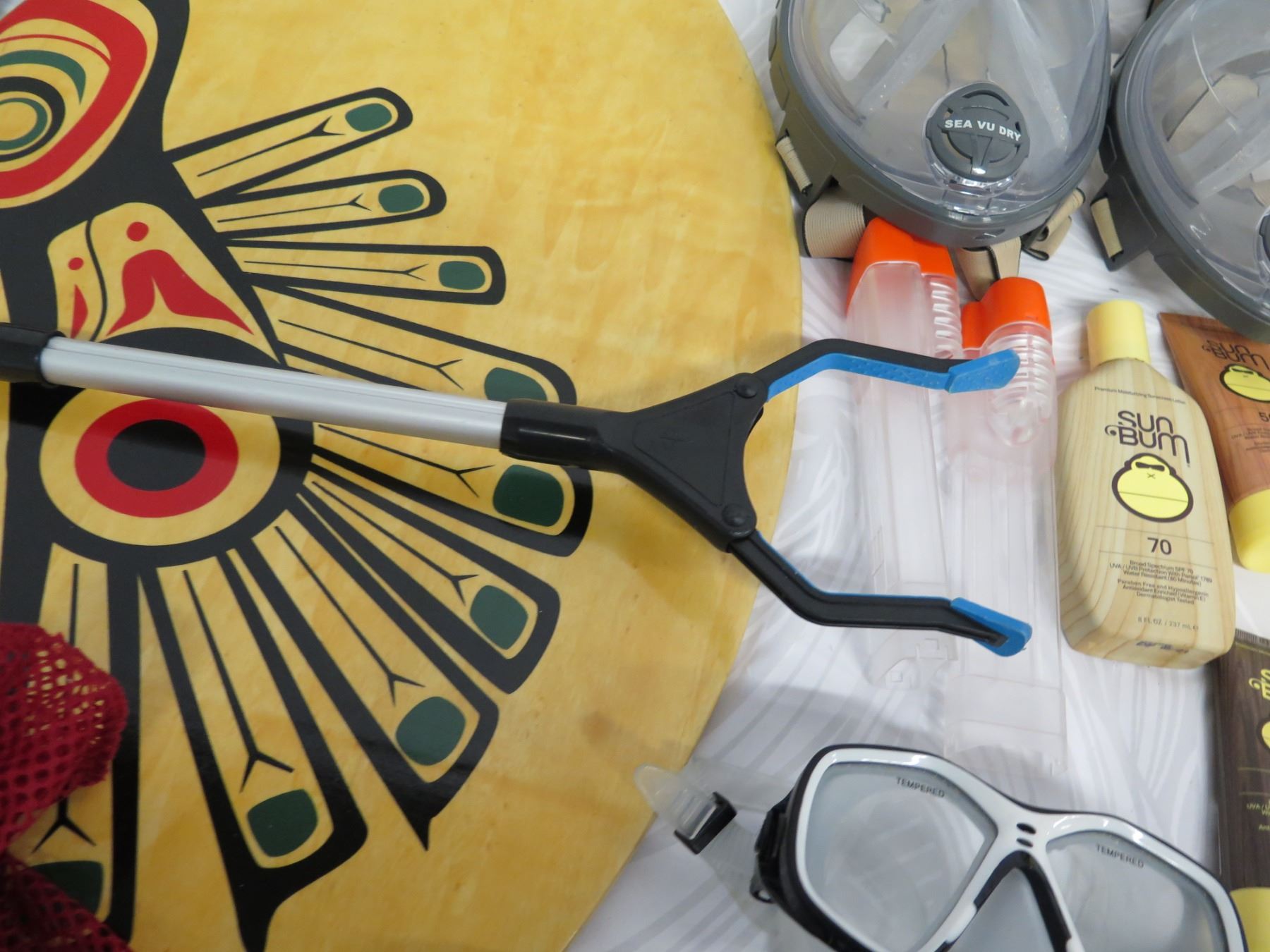 Beach Lot: Picker Tool, Skimboard, Snorkel, Fins, Masks, Lotions, Red Bag, etc