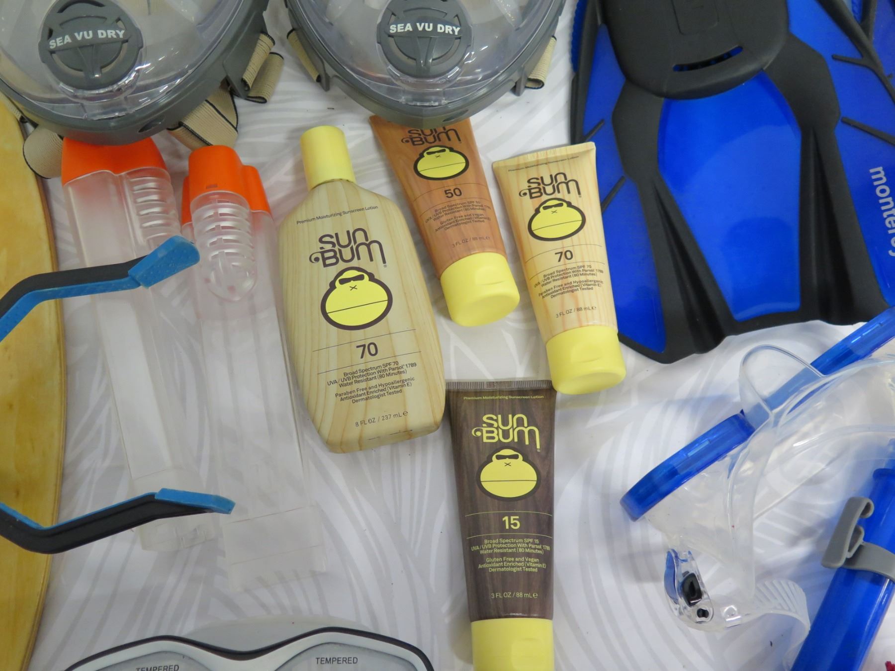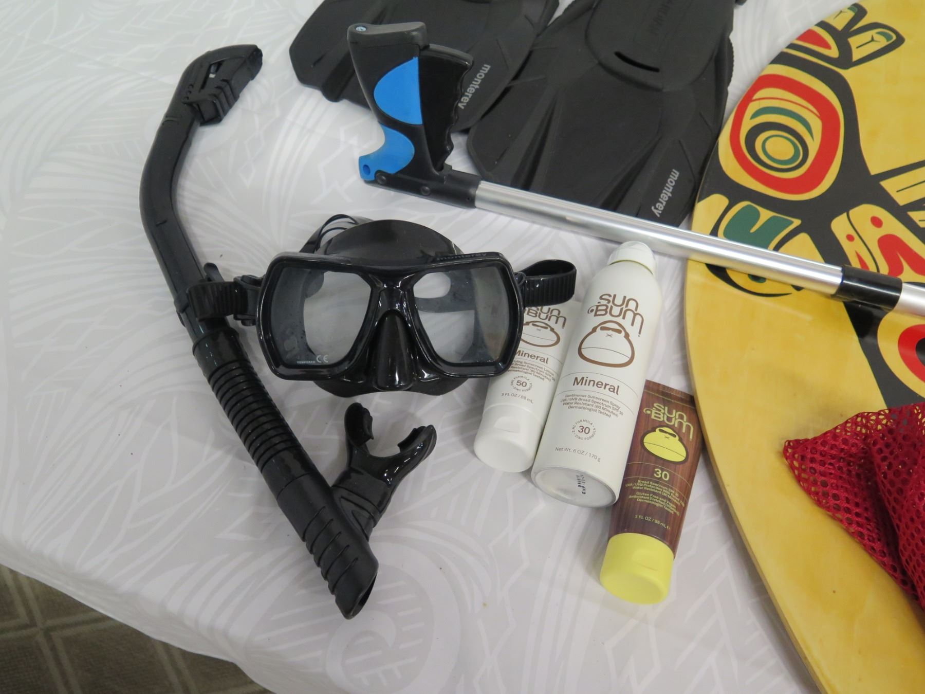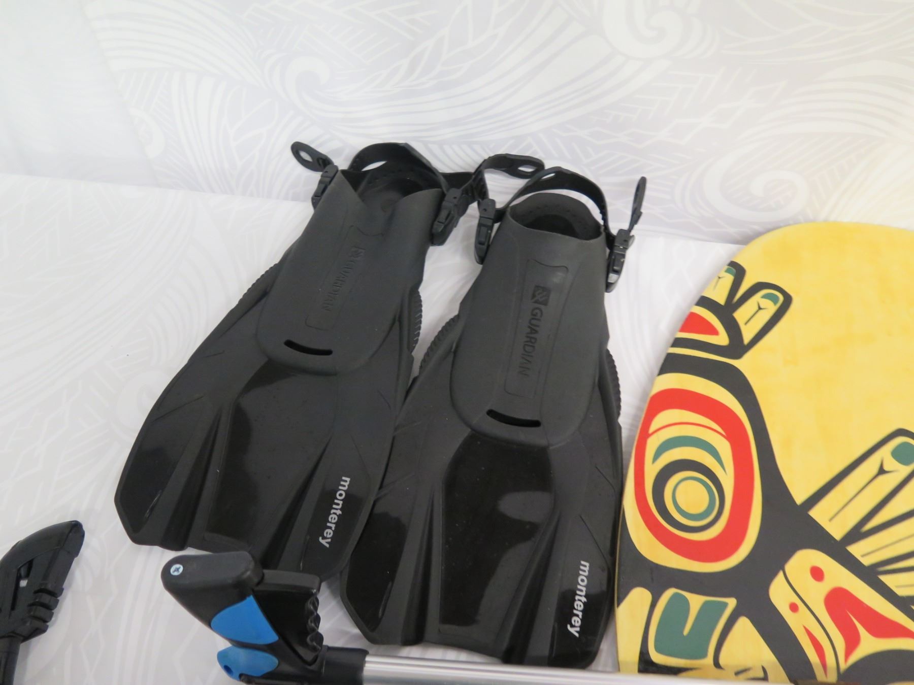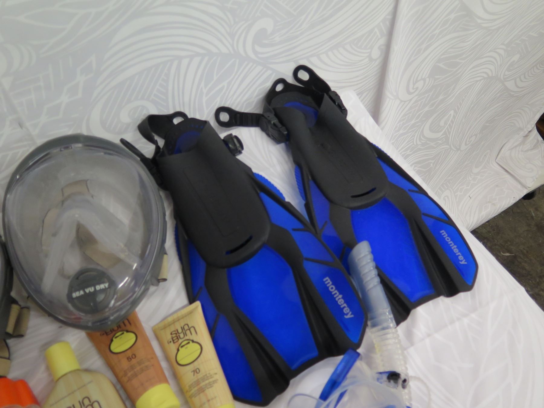 Beach Lot: Picker Tool, Skimboard, Snorkel, Fins, Masks, Lotions, Red Bag, etc