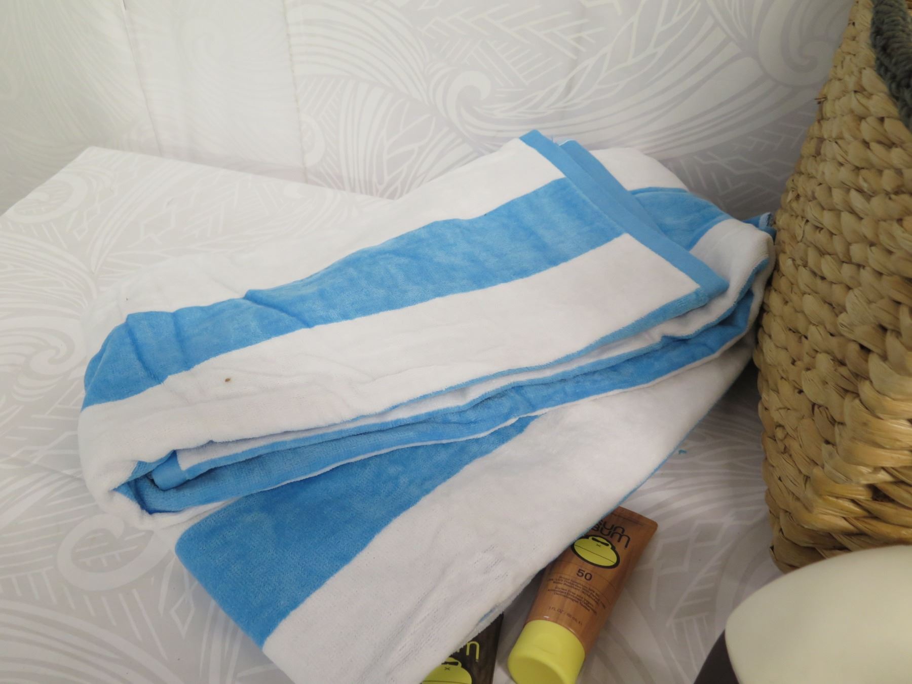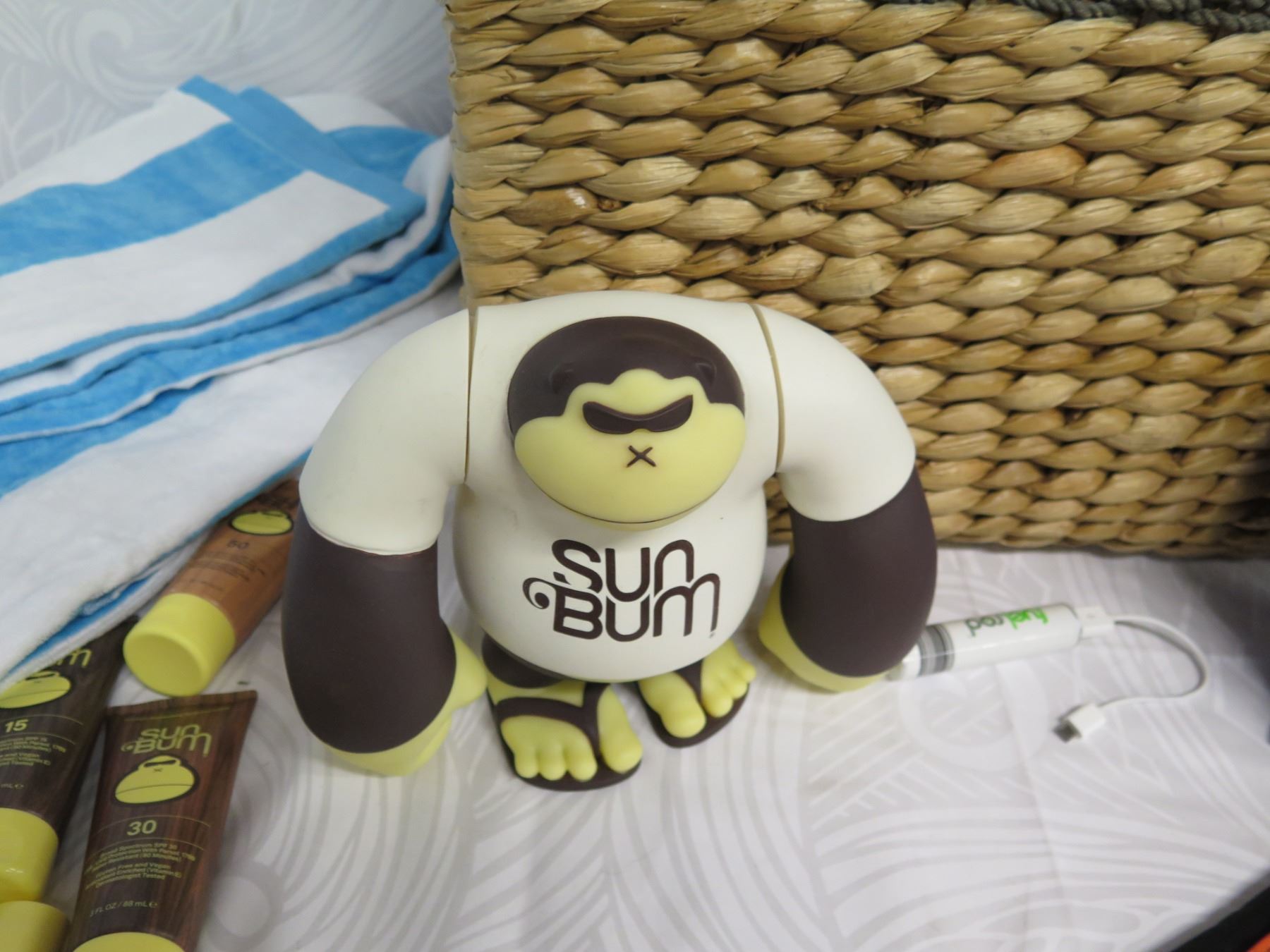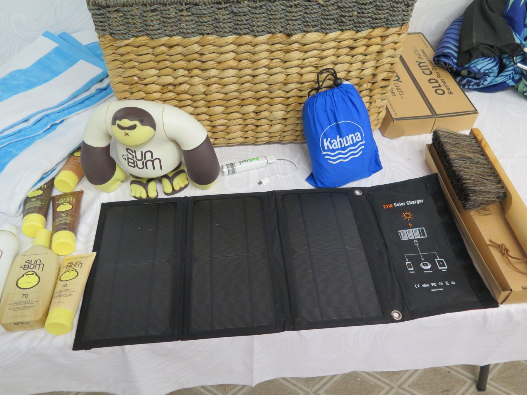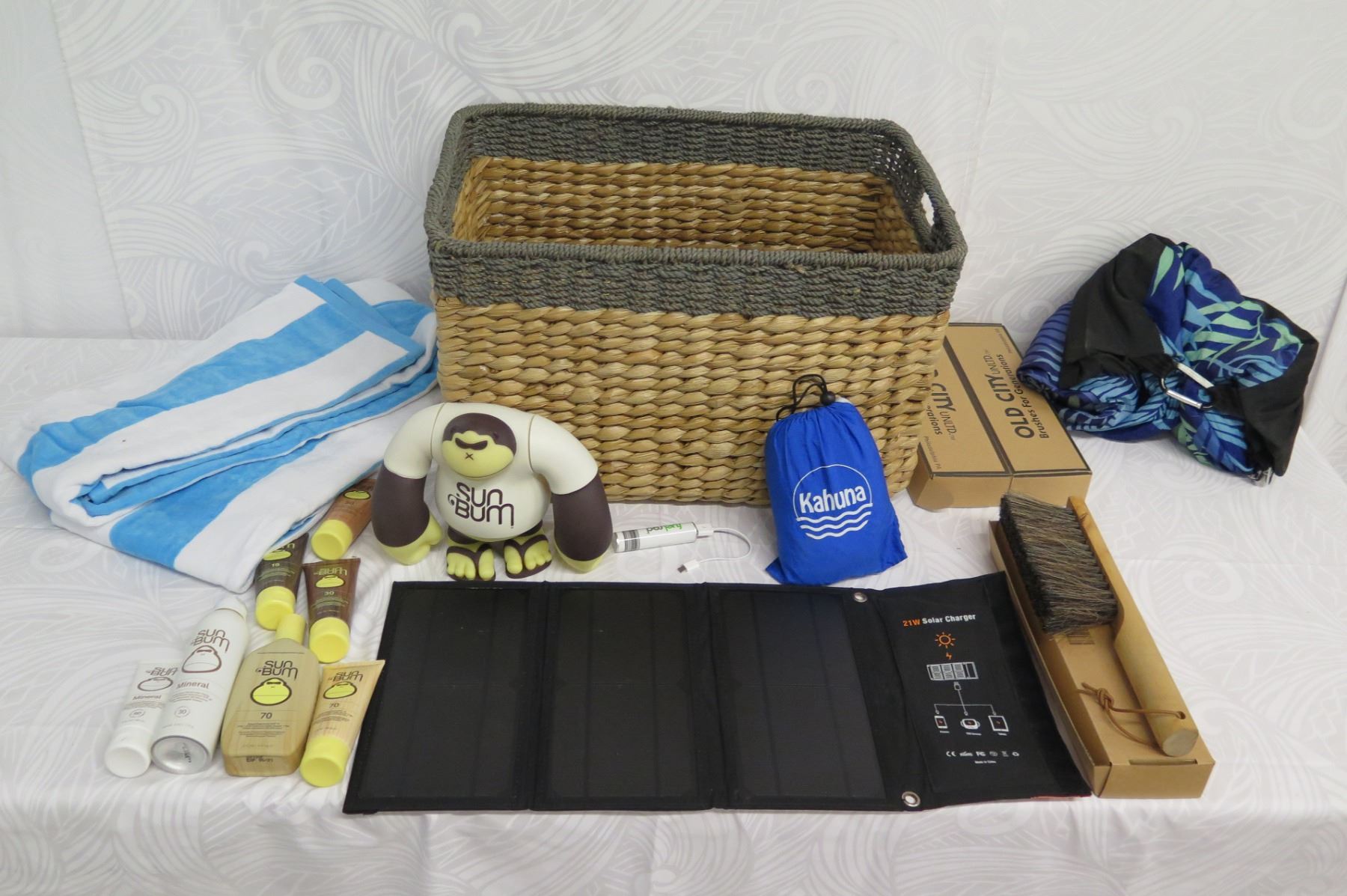 Beach Lot: Wicker Basket, Towels, Lotions, "Sun Bum" Toy, Solar 21 Charger, etc