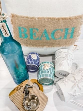 Beachy Vibe Morning Ritual Set: Pillow, Message in Bottle, Votives, Starfish Mugs, Seahorse Scooper