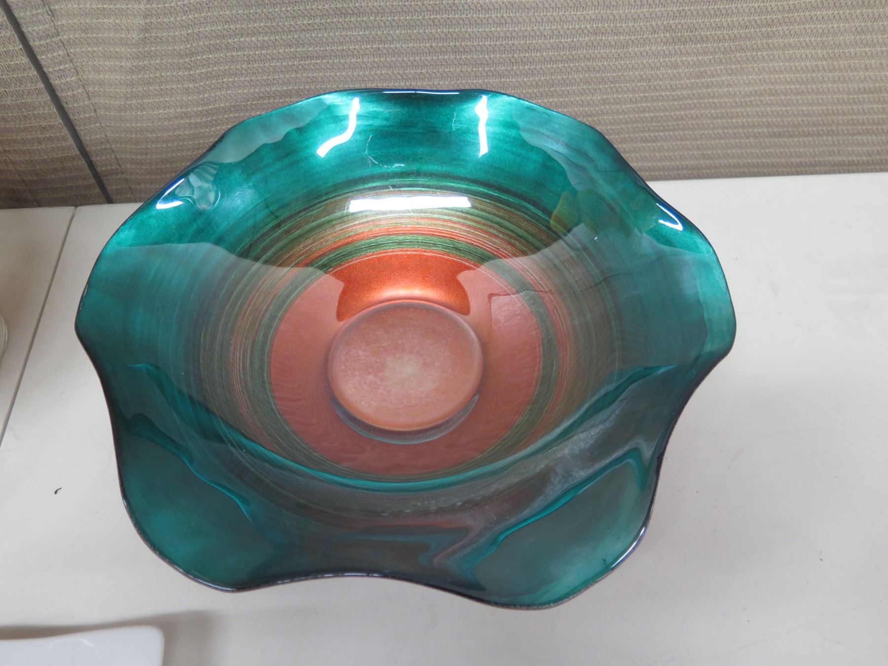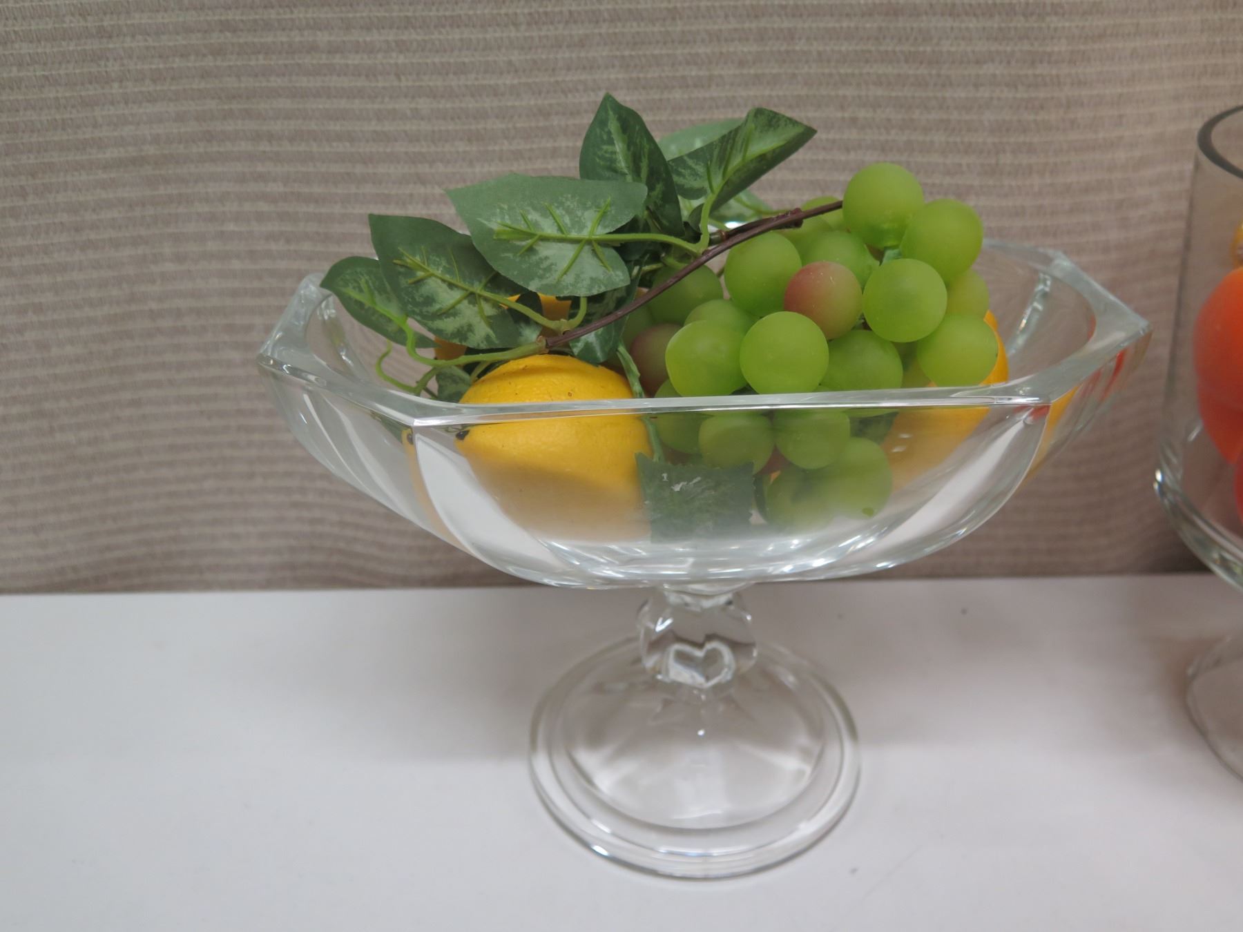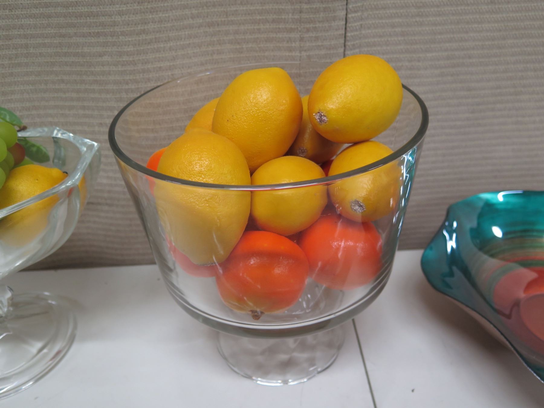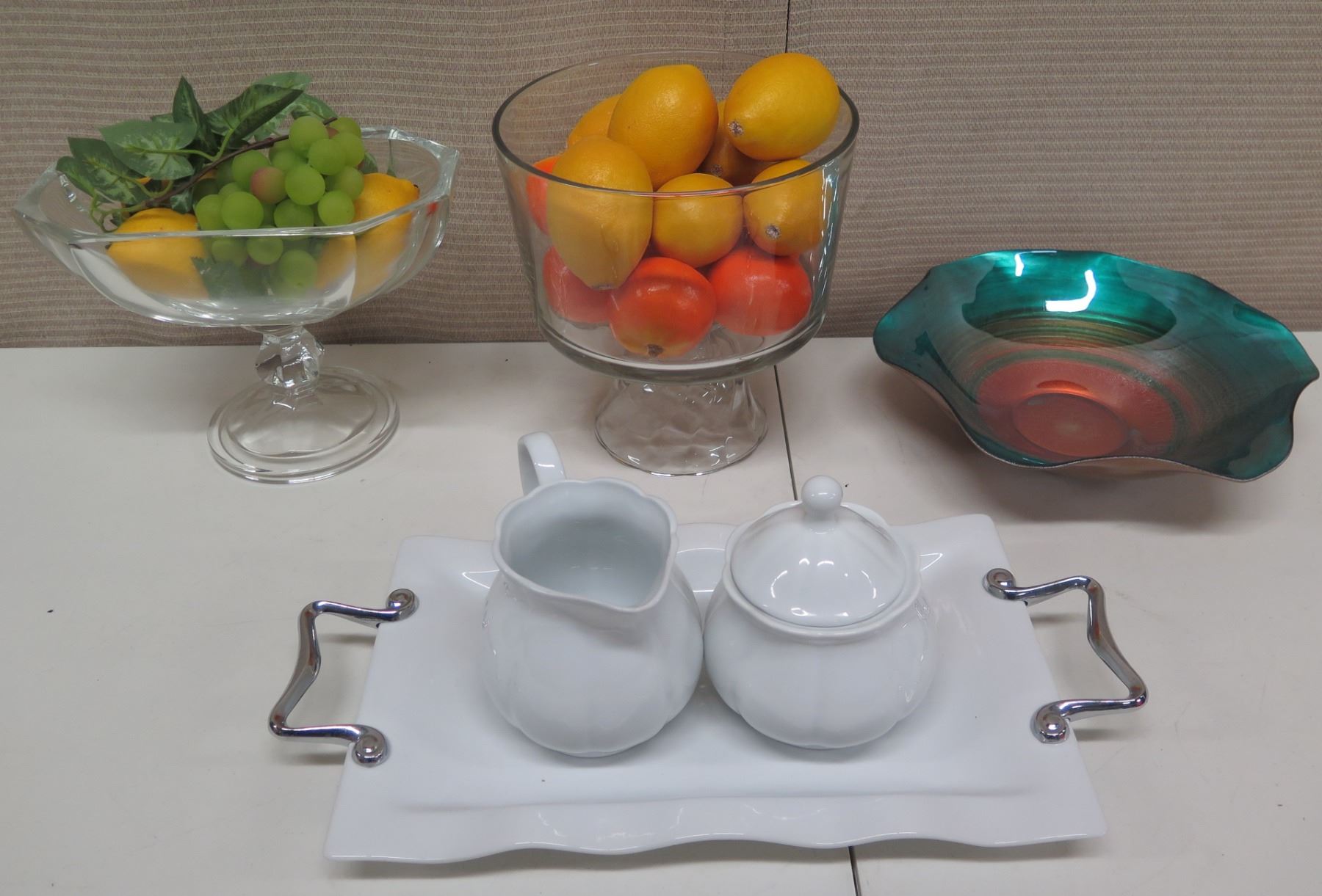 Beekman Sugar Bowl & Creamer on Tray, 2 Footed Bowls w/ Artificial Fruit & Aqua Bowl