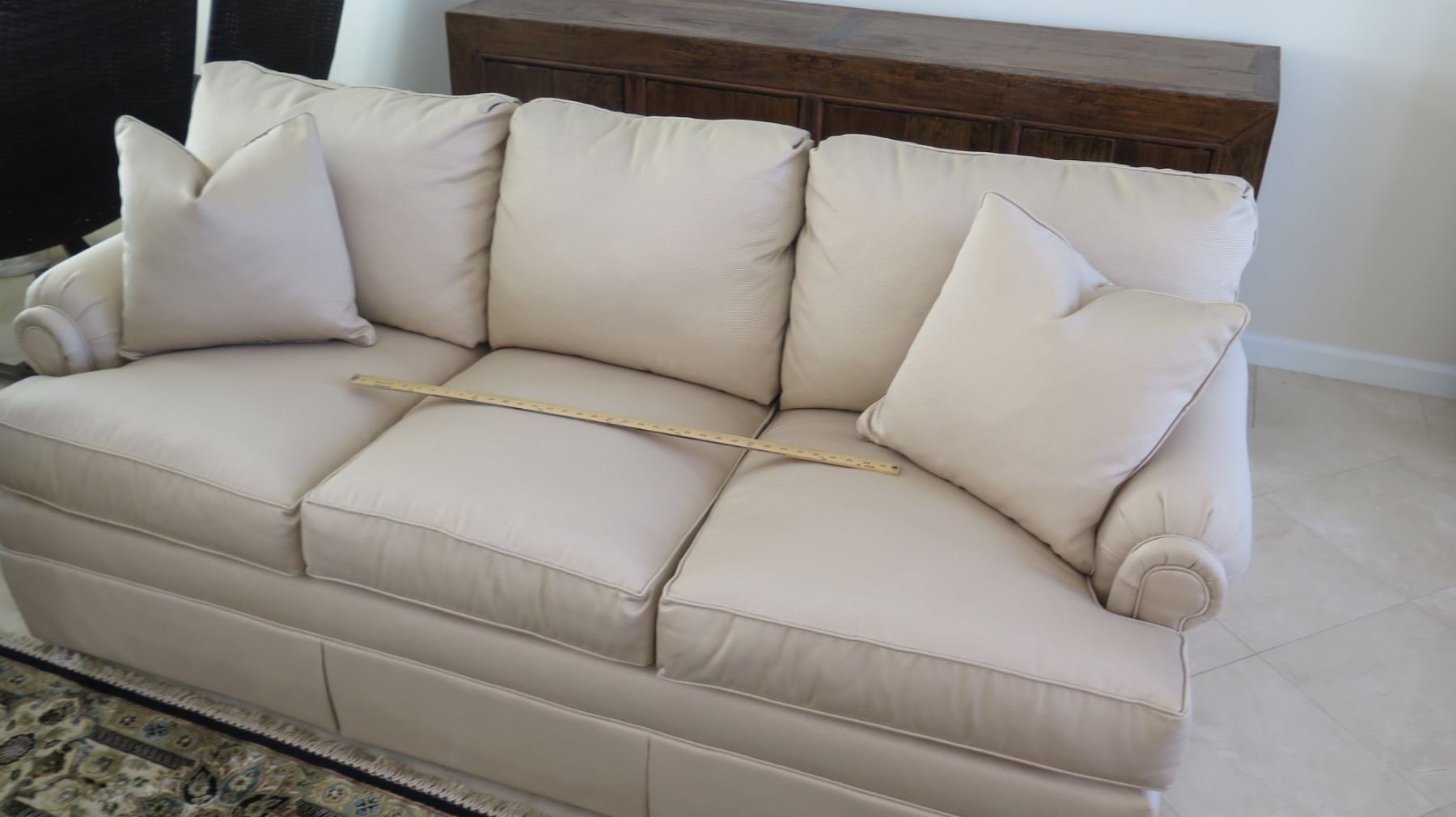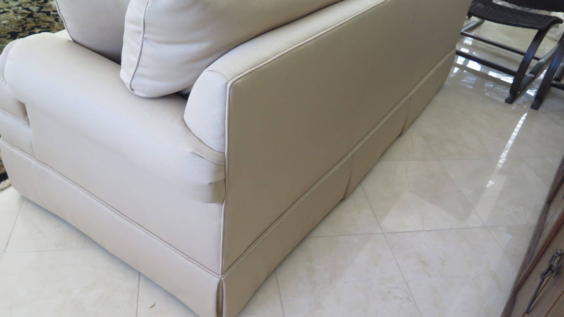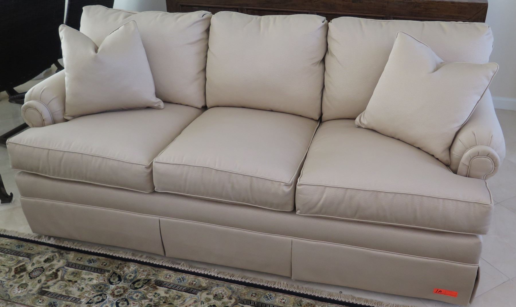 Beige Sofa by Drexel Heritage (from C.S. Wo), Tightly Woven Fabric 6'4" L x 2'11" D, Arm Ht 2'6"