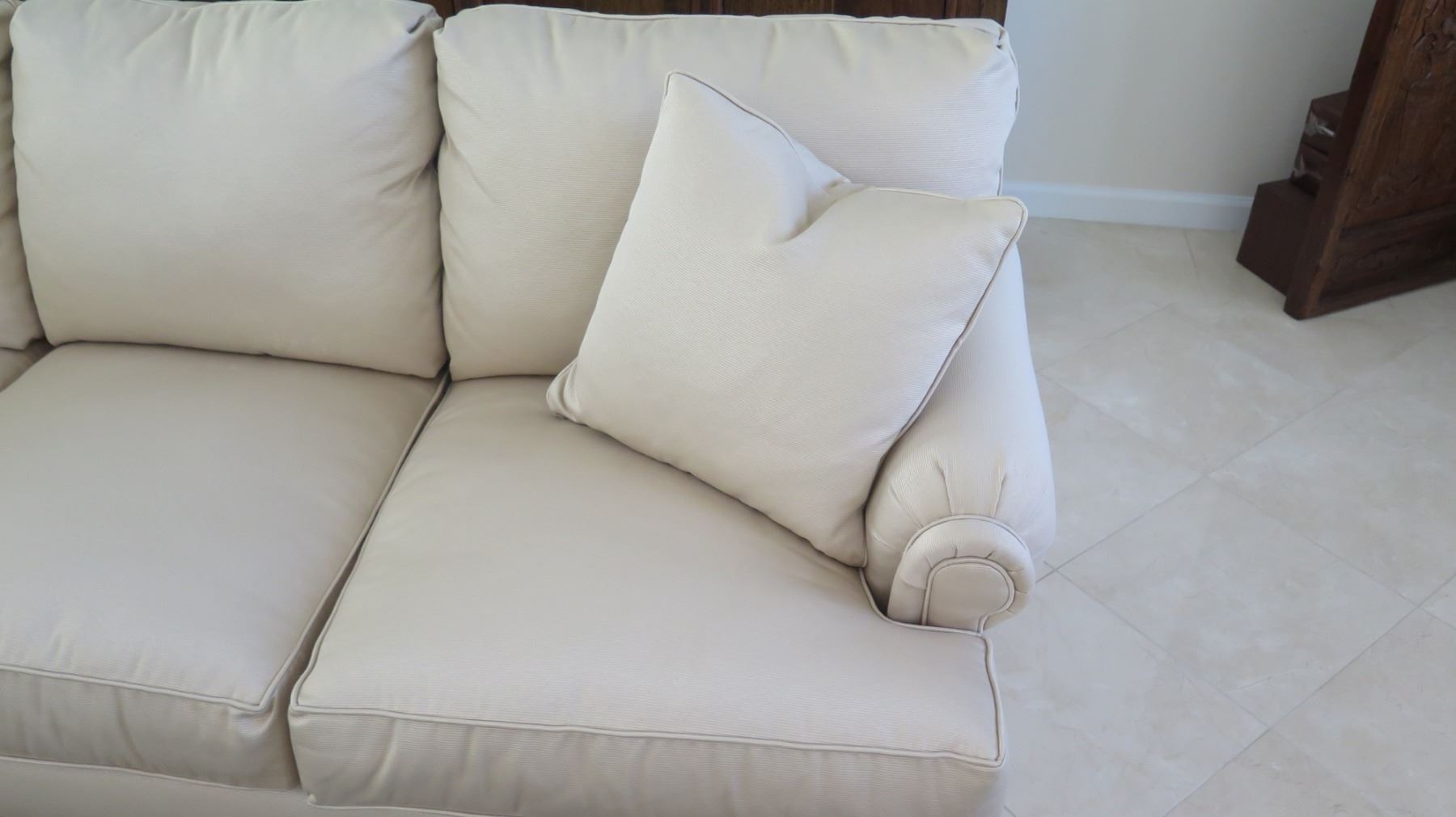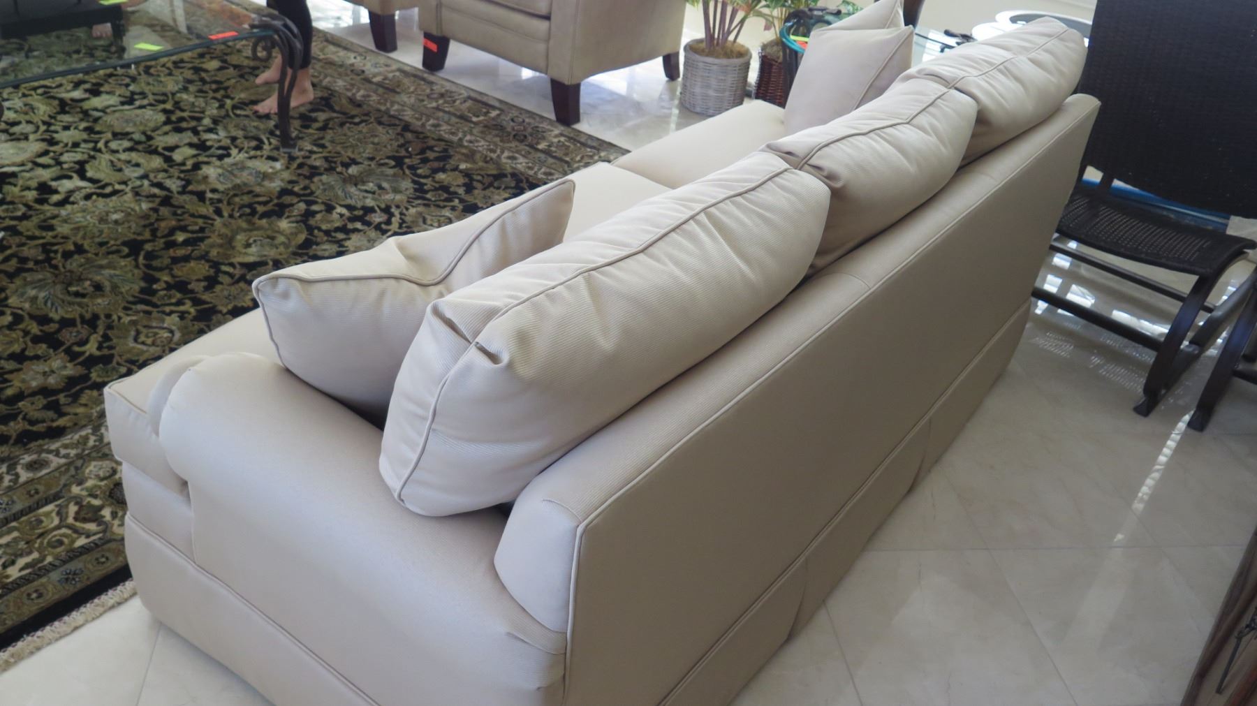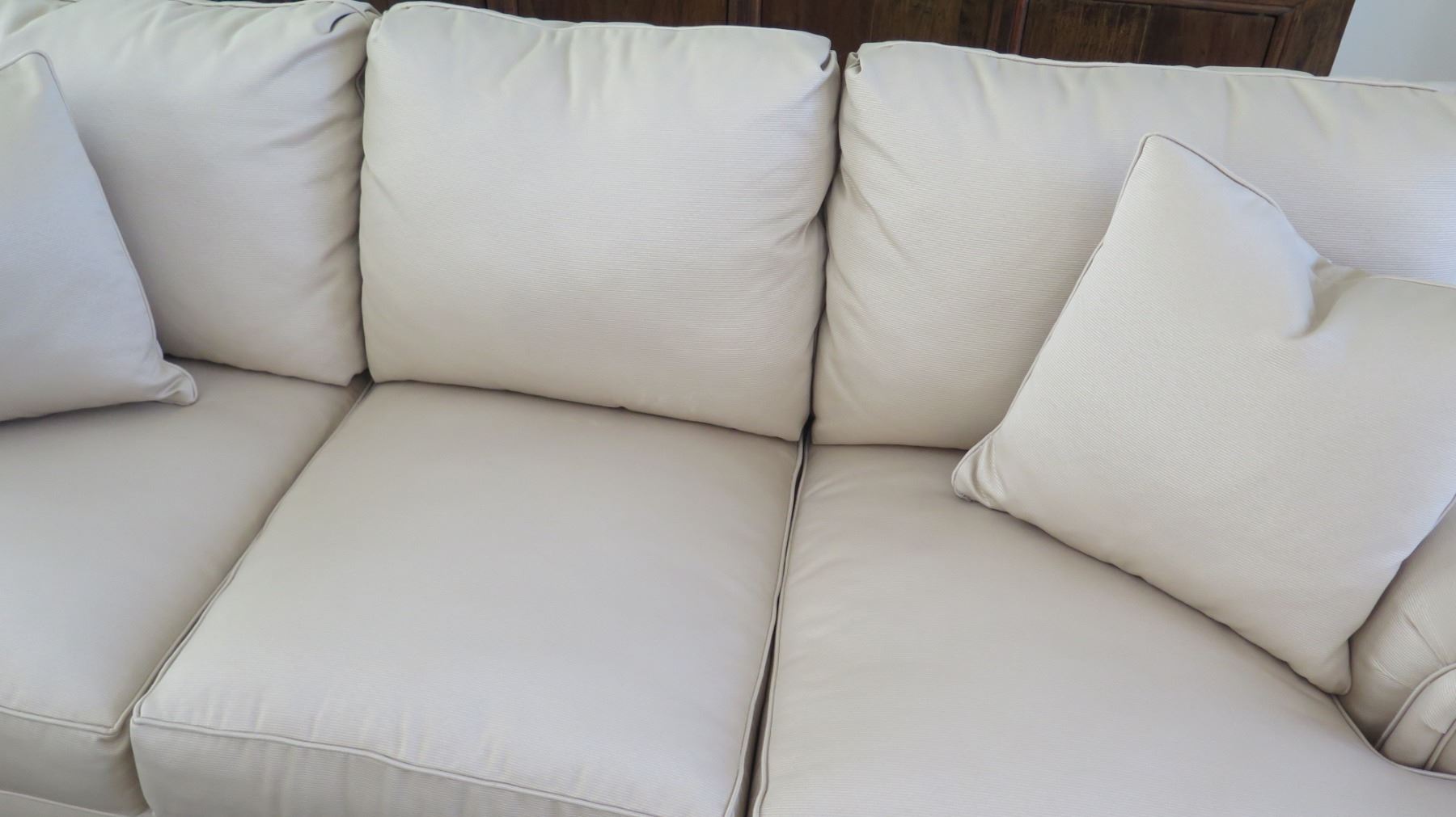 Beige Sofa by Drexel Heritage (from C.S. Wo), Tightly Woven Fabric 6'4" L x 2'11" D, Arm Ht 2'6"