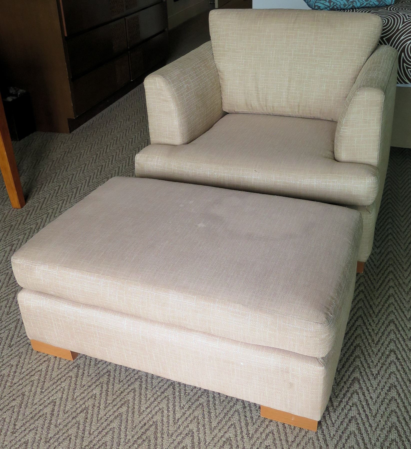 Beige Upholstered Armchair 35"x23"x28"H w/ Matching Ottoman 35"x22"x14"H