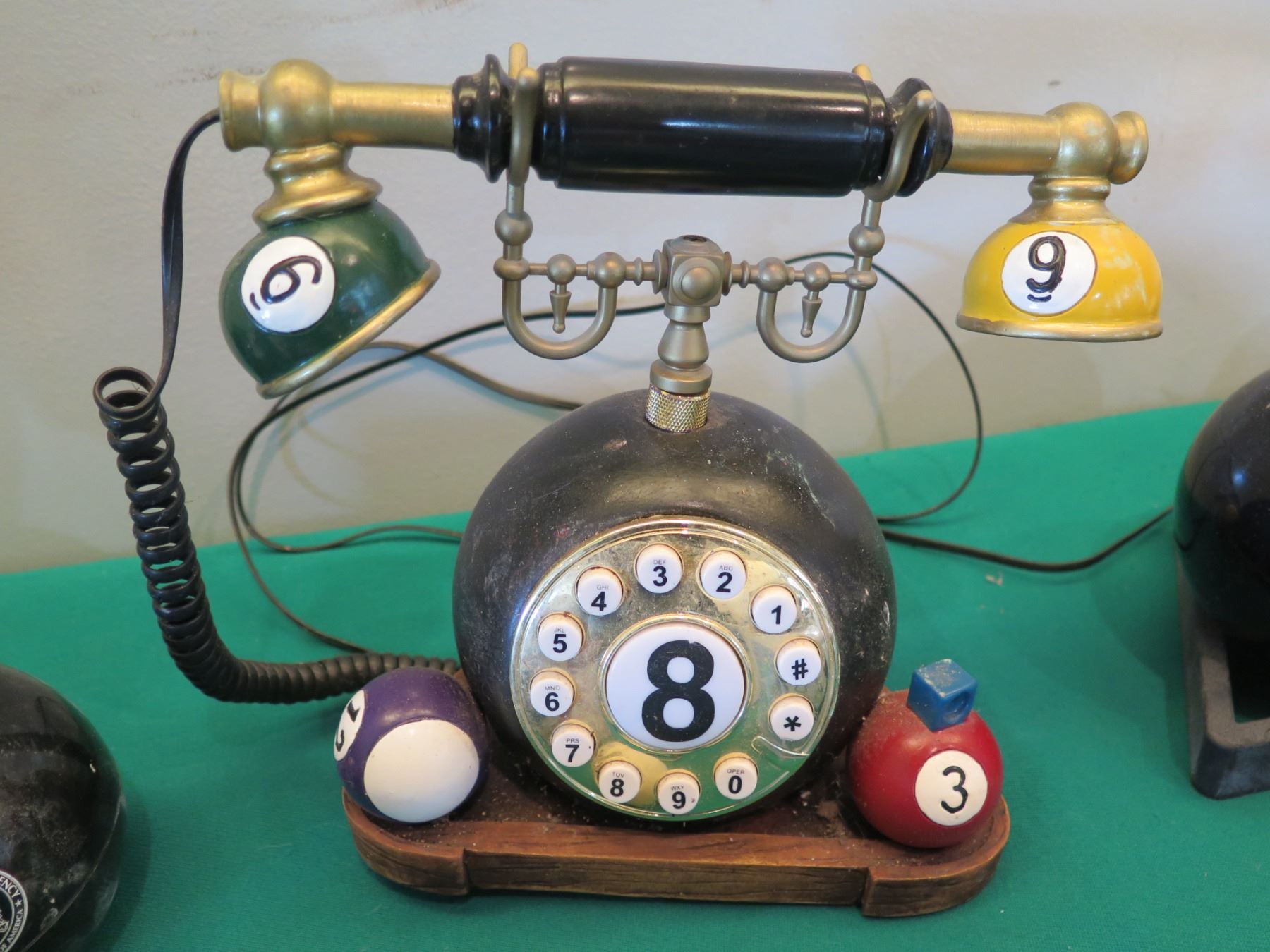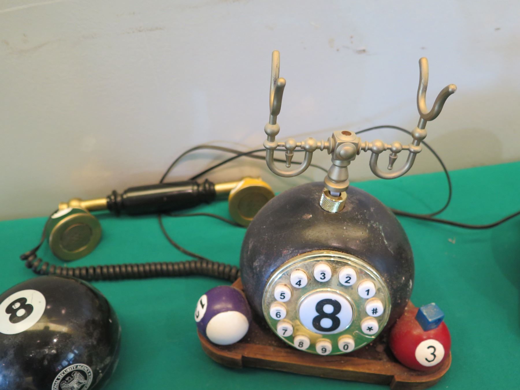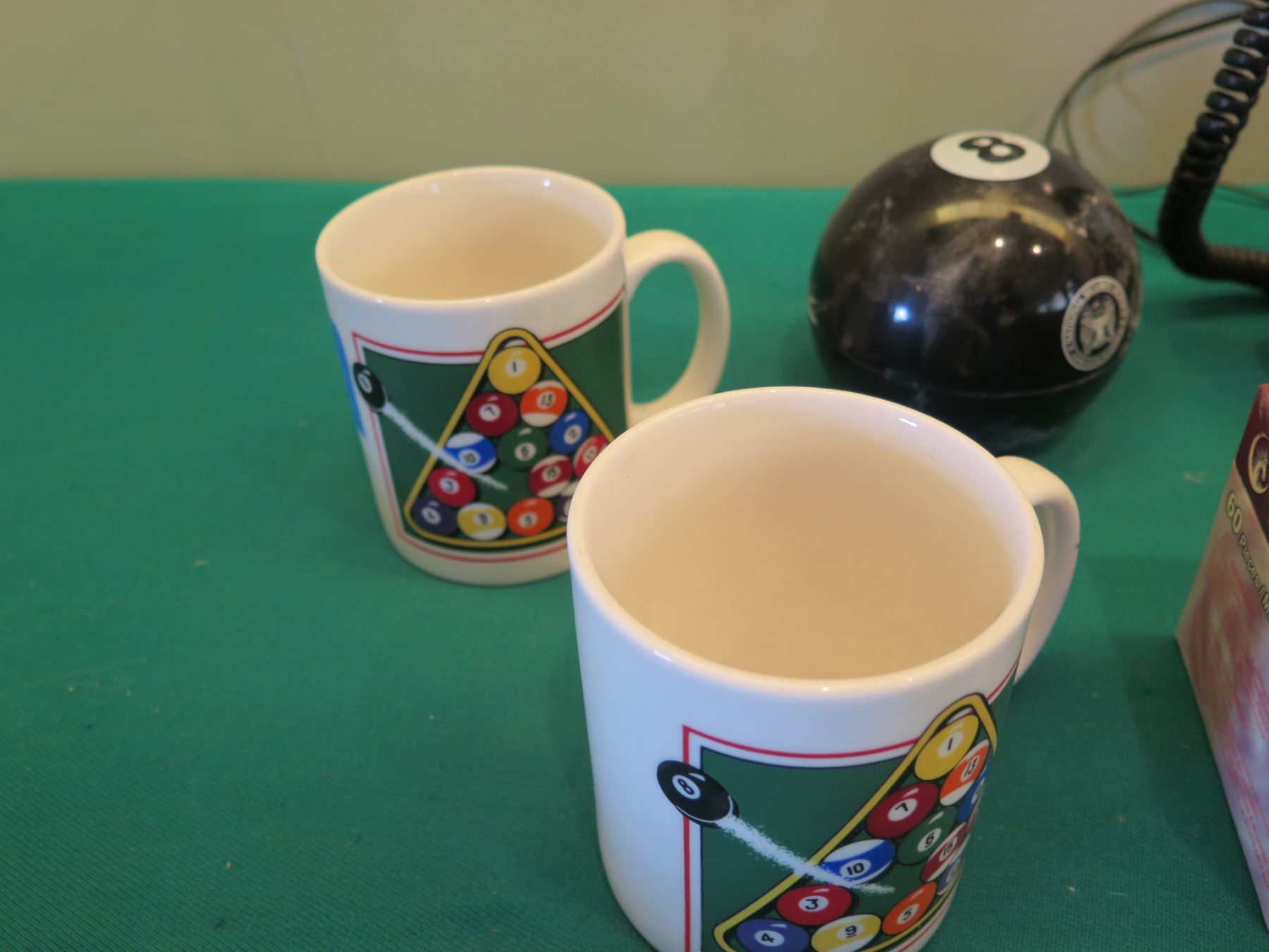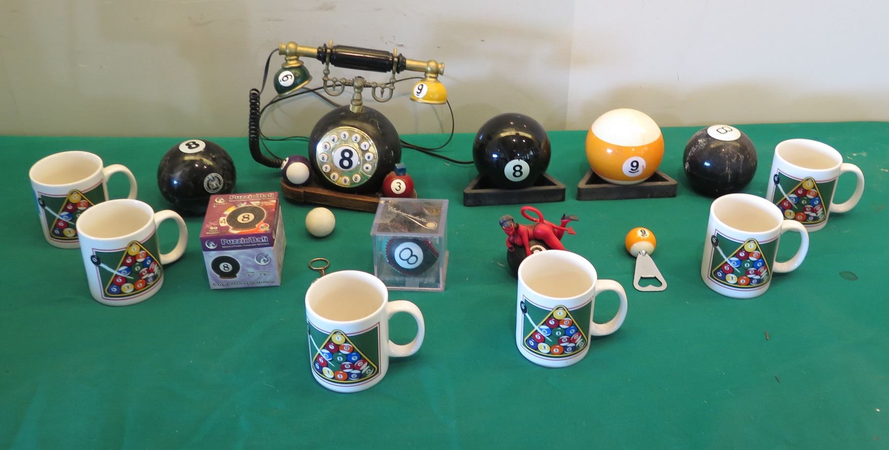 Billiards Decor: 8 Ball Telephone, Cue Ball Mugs, Puzzle Ball, Key Ring, etc