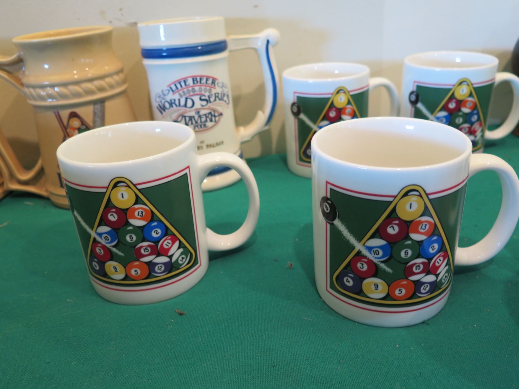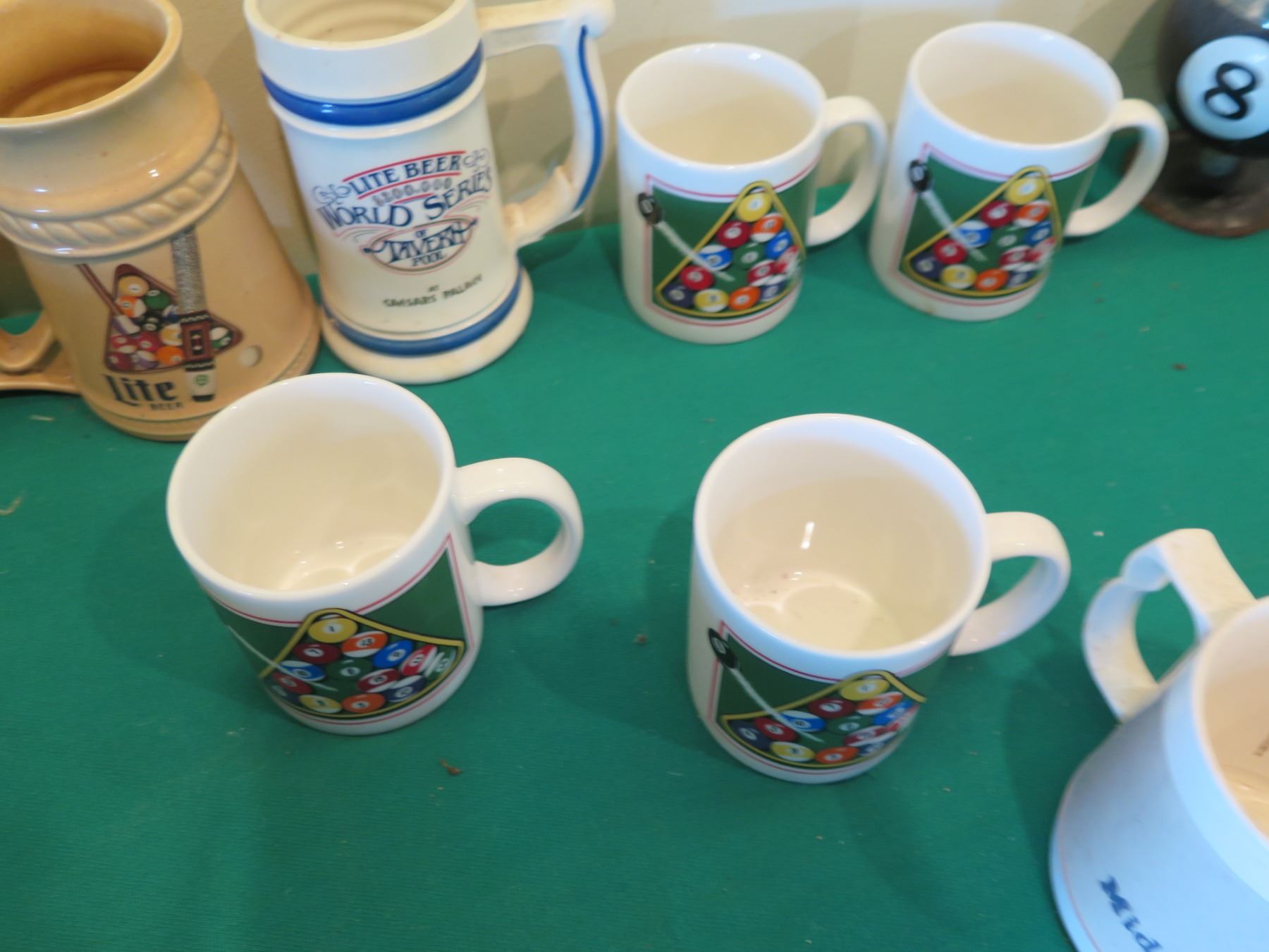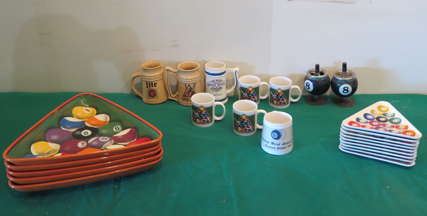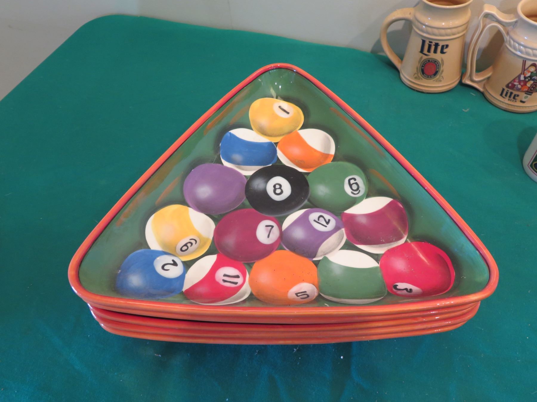 Billiards Decor: Rack Shaped Cue Ball Plates, Mugs, Steins, Ashtrays, etc