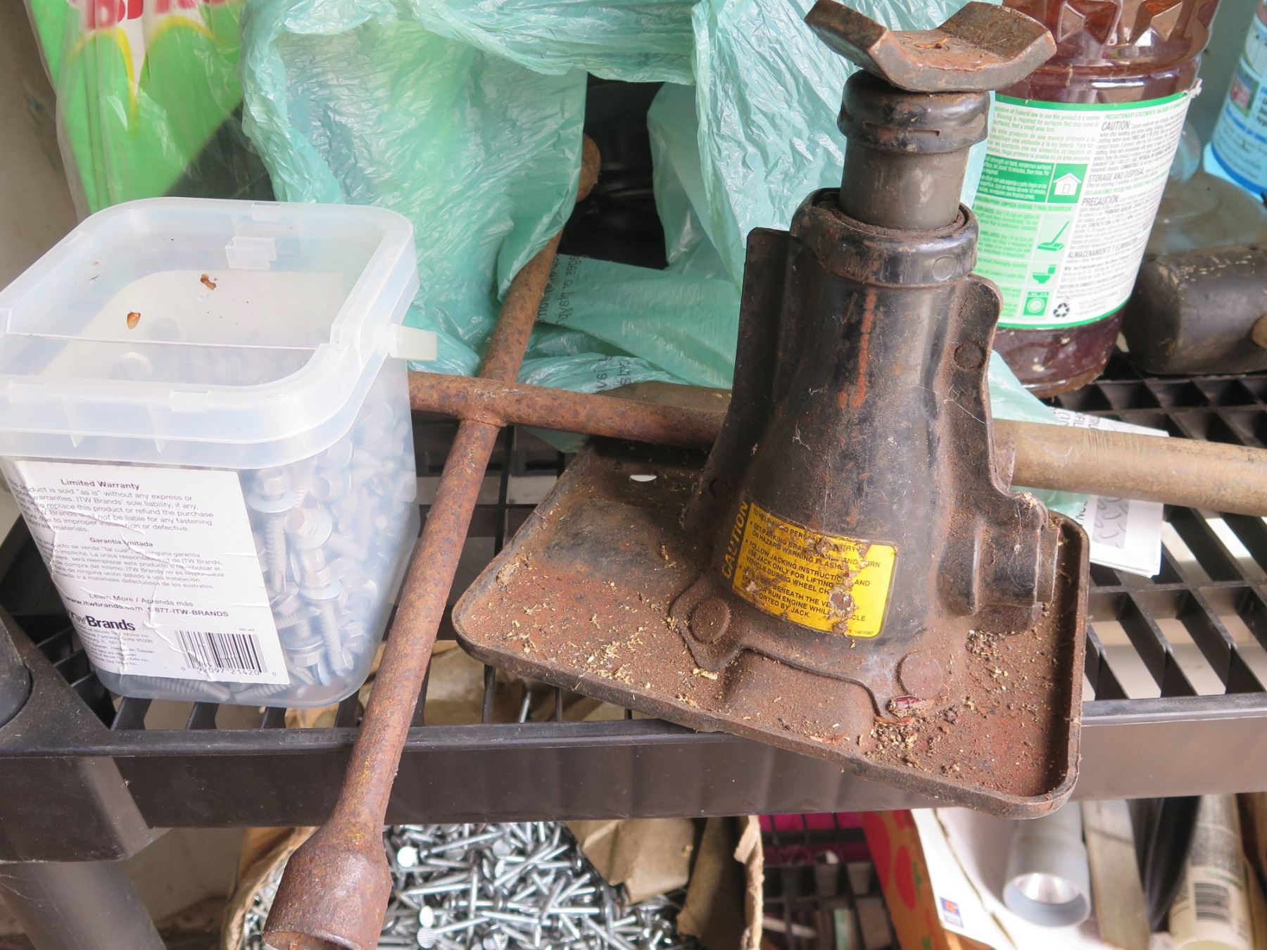 Black 4-Tier Shelf & Contents: Hardware, Cleaning Supplies, Jack, Flashlight, etc