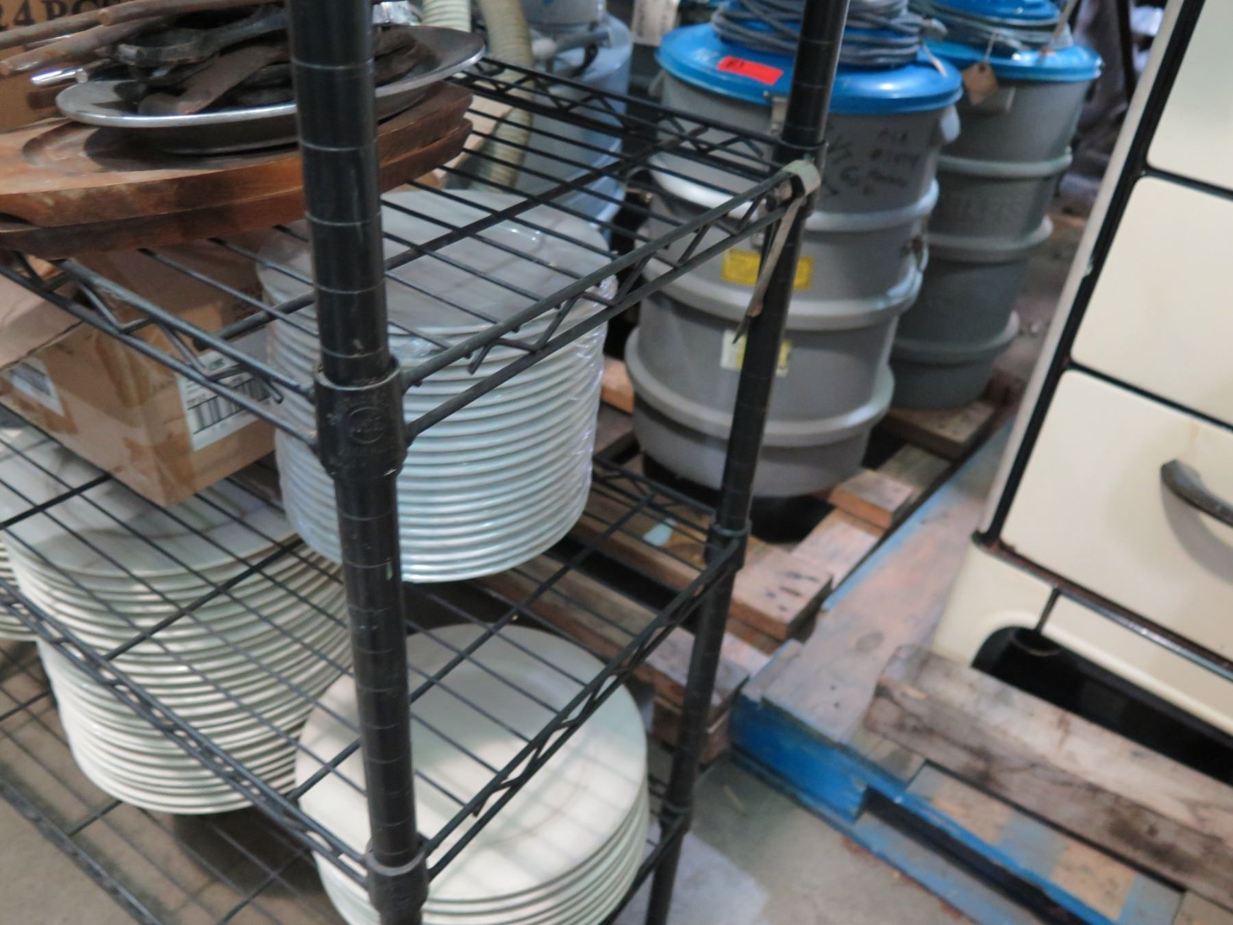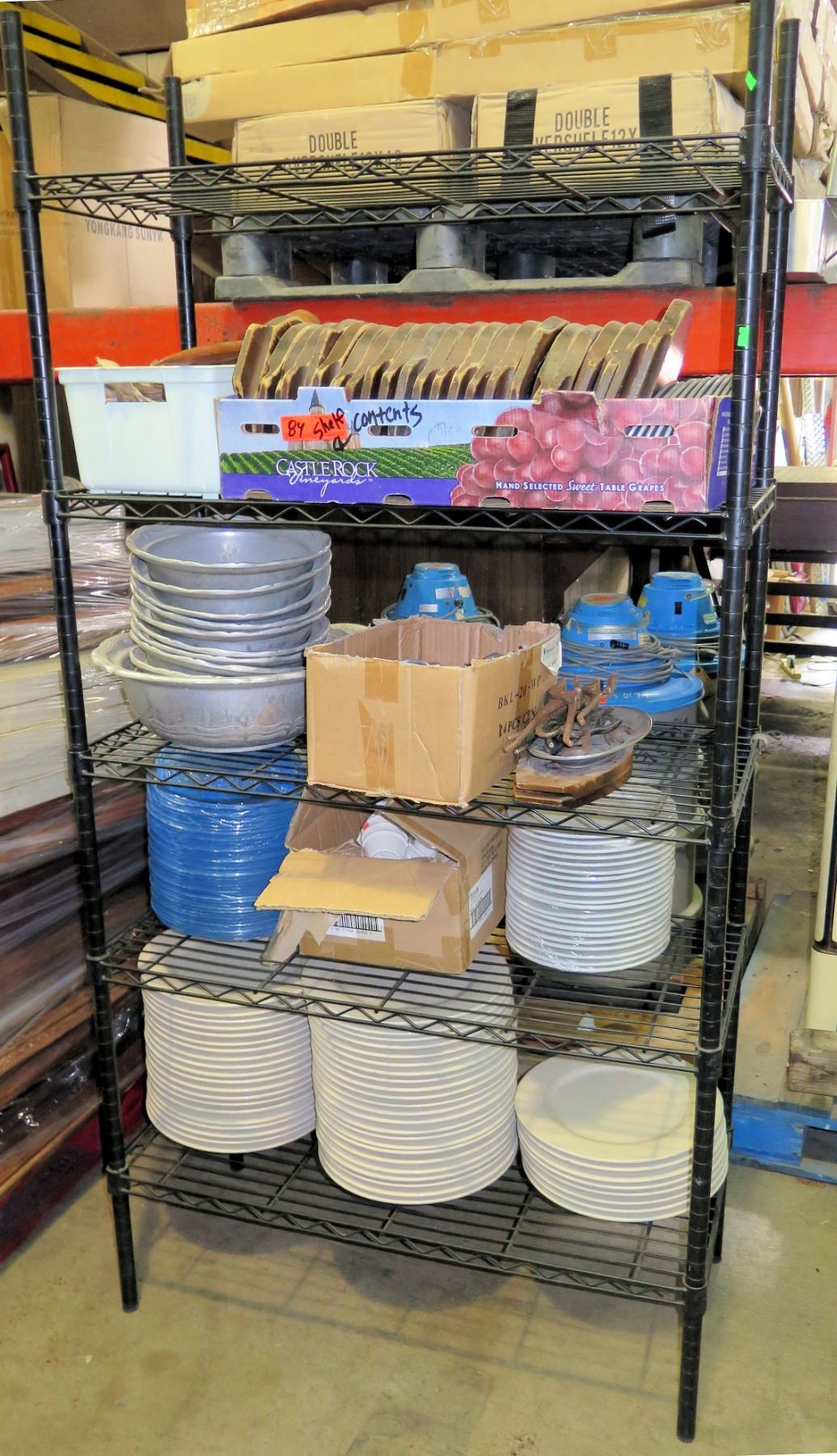 Black 5-Tier Metal Wire Shelf w/ Contents - Plates, Metal Bowls, Wood Utensils, etc