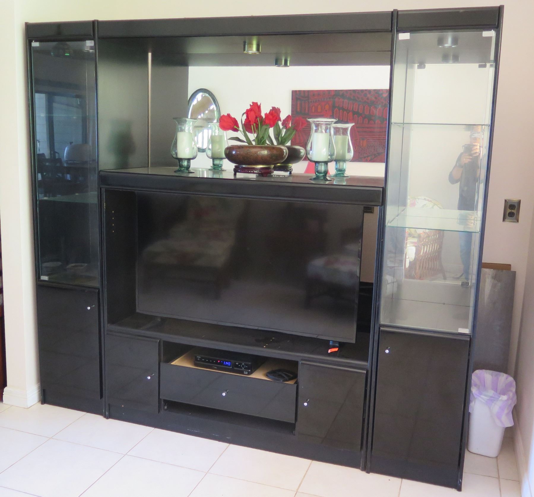 Black & Glass Entertainment Center Cabinet 85"x18"x76"H (Contents Not Included)