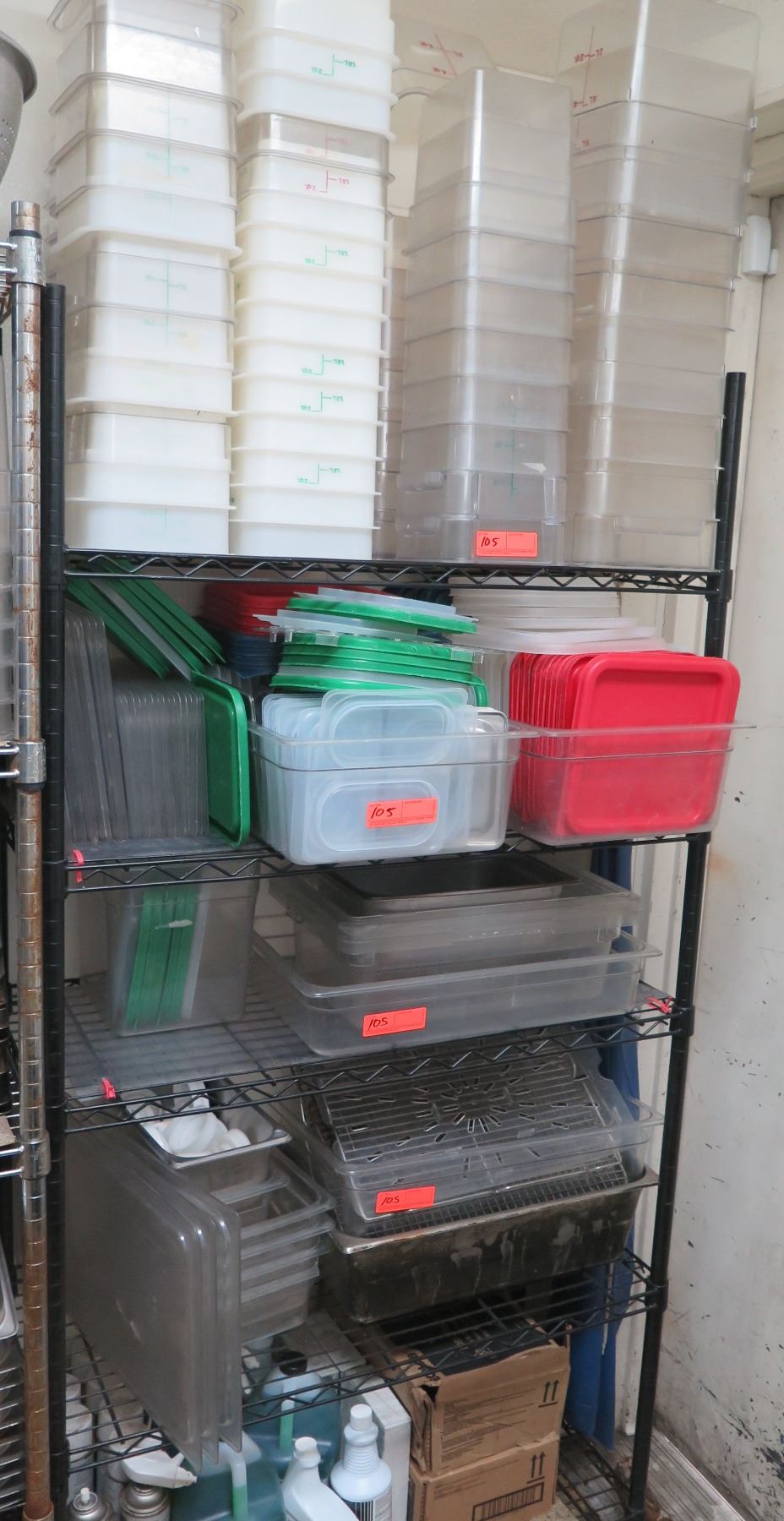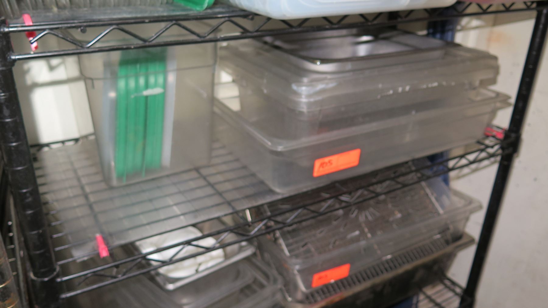 Black NSF Shelving Unit with Contents: Plastic Storage Containers w/Lids, etc. Includes shelf (35.5"