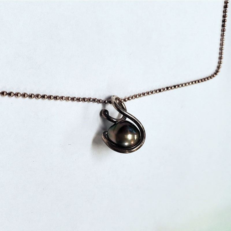 - "Baby Wave" Pendant made in silver with a black Tahitian pearl on a silver chain. This comes with certificate of authenticity.