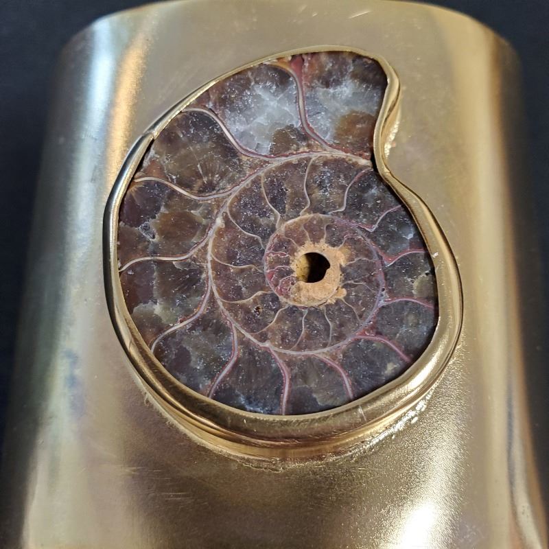 - 2 3/4" by 2 1/4" Gold-plated cuff bracelet with a snail shell emblem. This is a custom bracelet and also very rare.