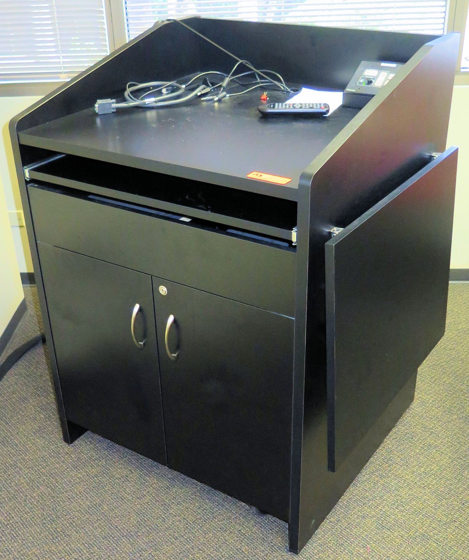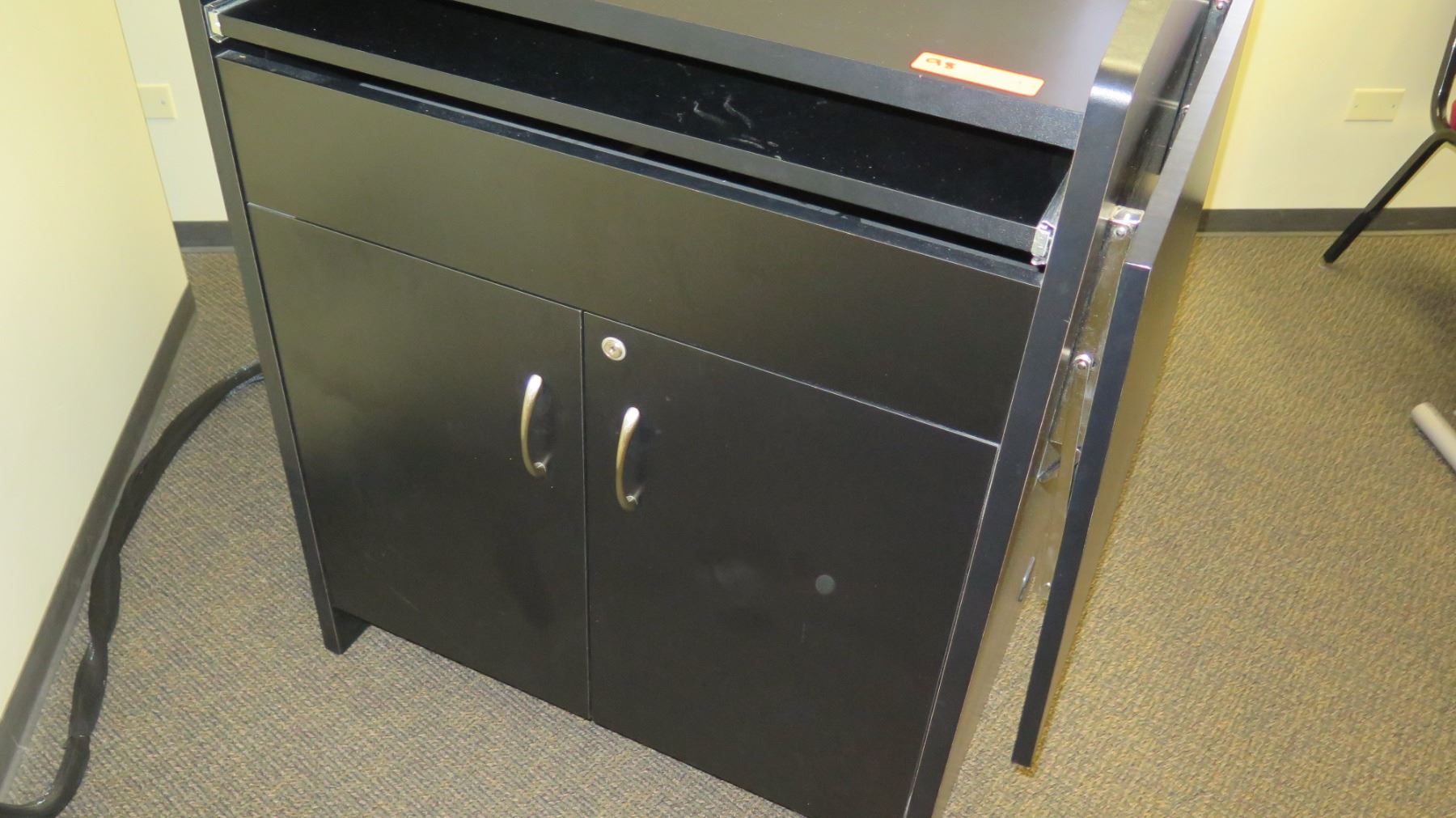 Black Podium w/ Cabinet 33" x 25"D x 43.5"H (electronics shown in photos not included). Buyer will be responsible for disassembling and removing all purchased items in this auction. Buyer must bring own tools, carts, etc. Loadout Thursday, May 9 to Saturday May 11. Detailed directions to building’s loading zone and designated load-out areas will be provided.