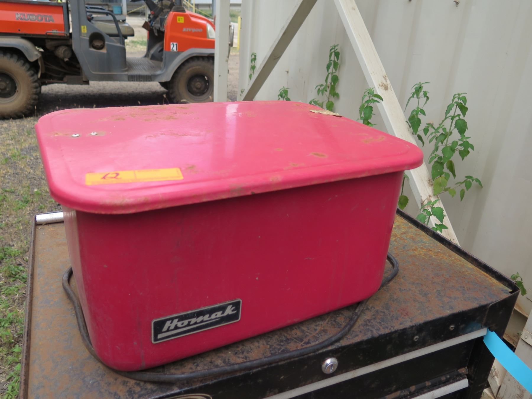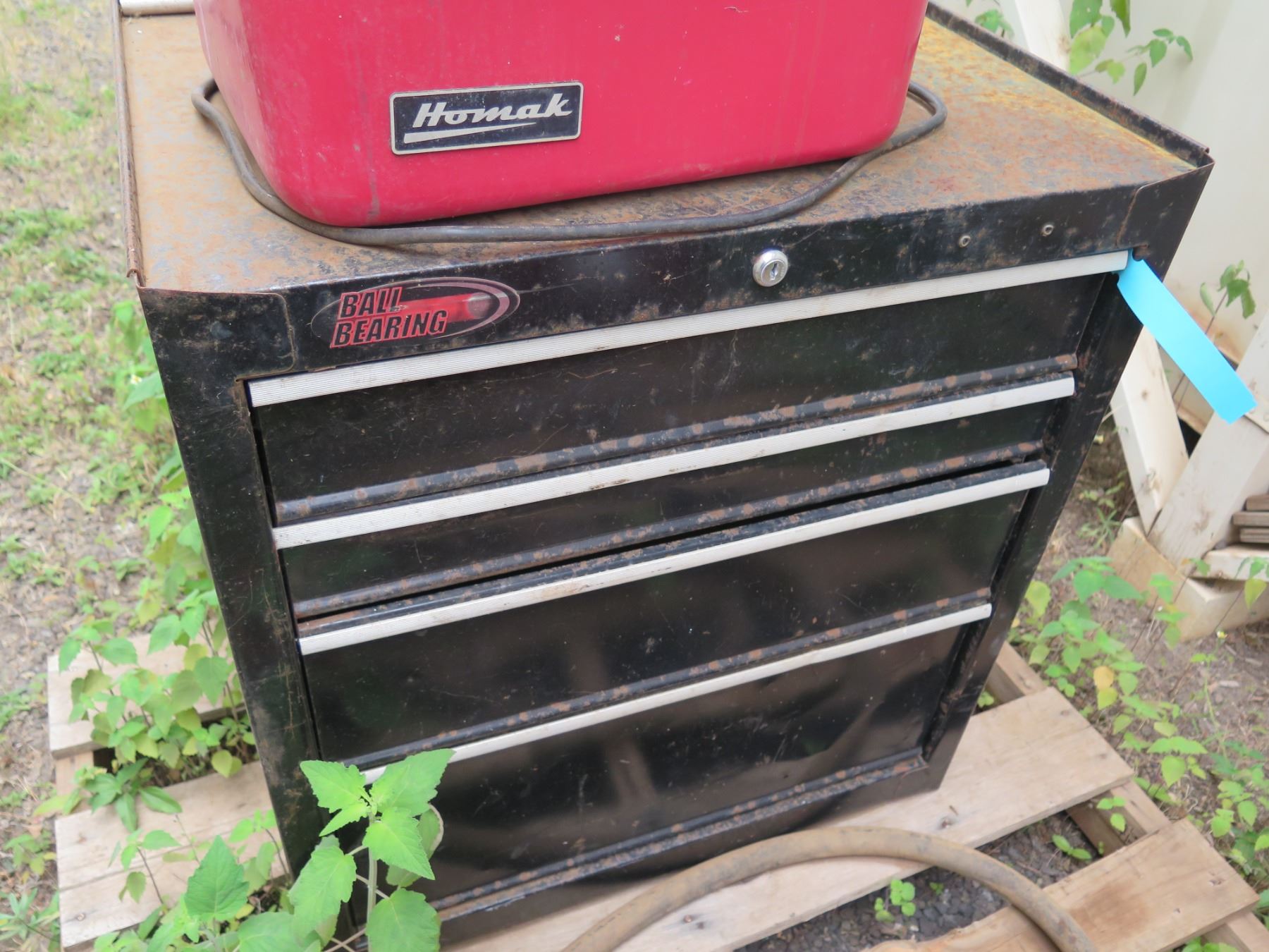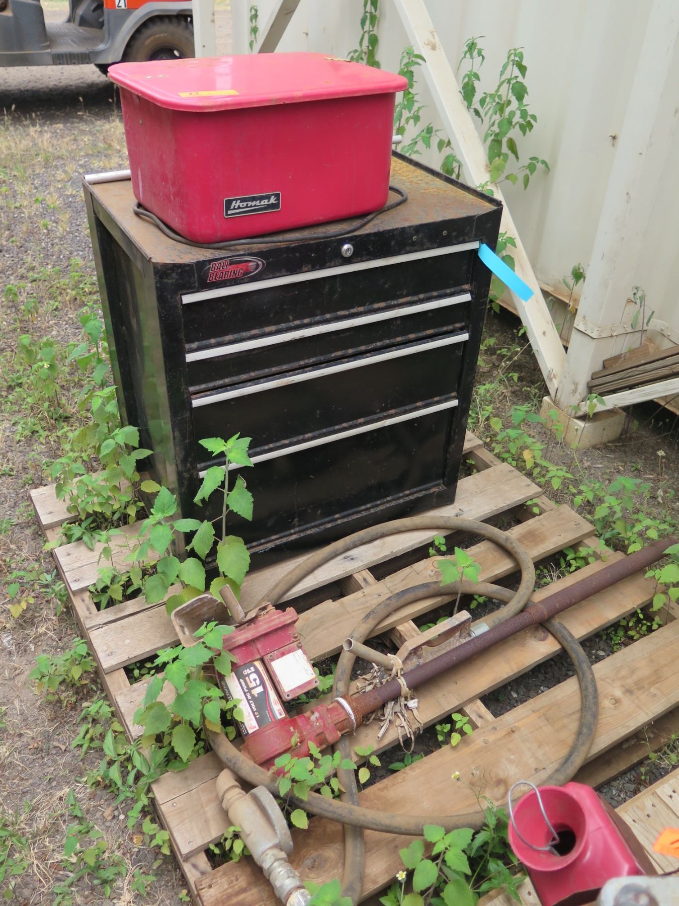 Black Toolbox, Red Parts Washer & Hand-Crank Fuel Pump