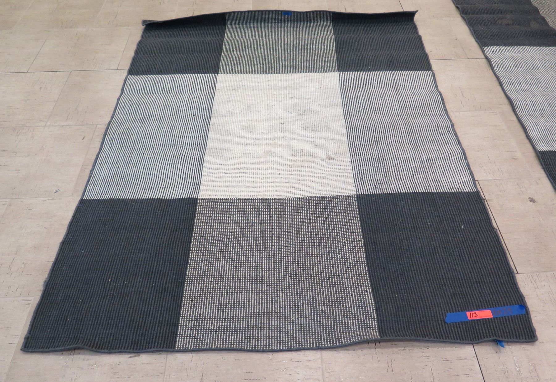 Black and White Geometric Area Rug 7'9" x 6'. Has a few stain in random areas (as shown in pictures)