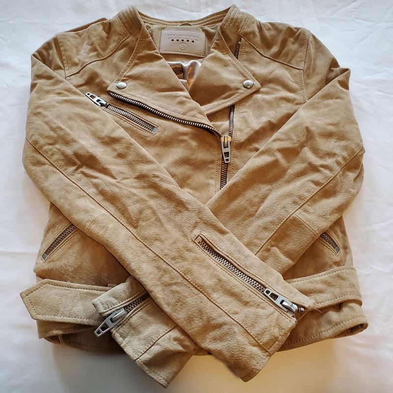 (1) Small Beige Suede Belted Moto Jacket
