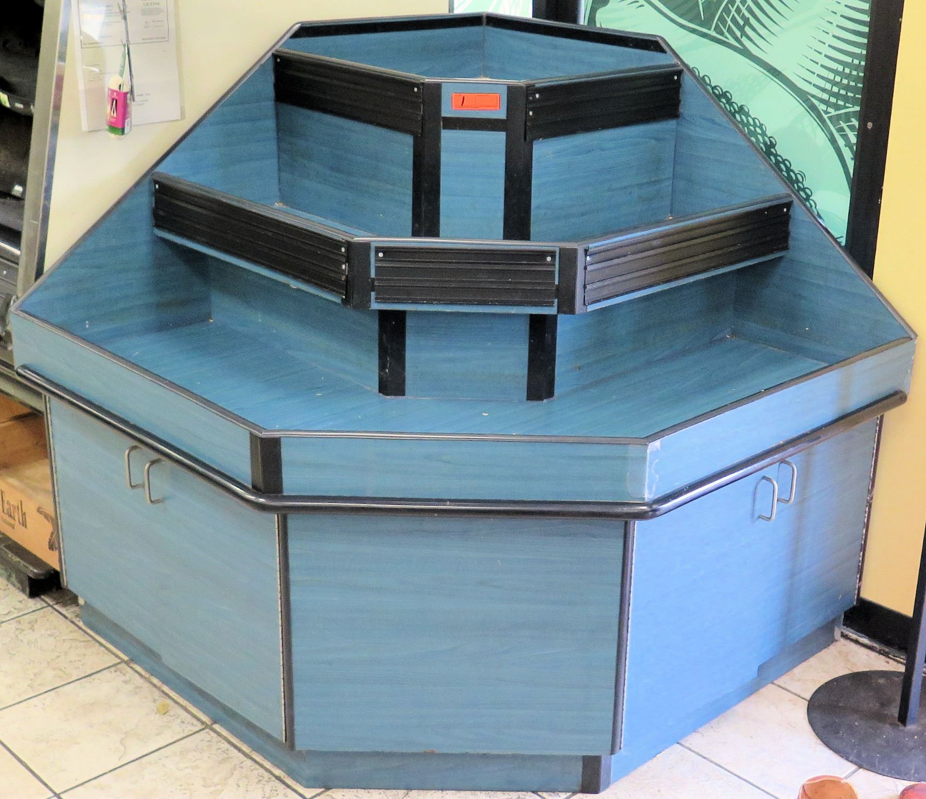 Blue 3 Tier Hexagon Shaped Display Corner Unit. FOOD PRODUCTS AND MERCHANDISE IN THE PICTURES ARE NOT INCLUDED.