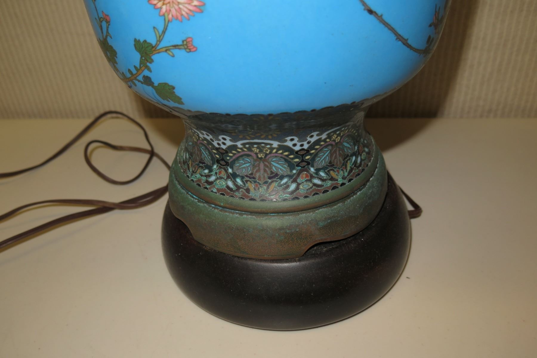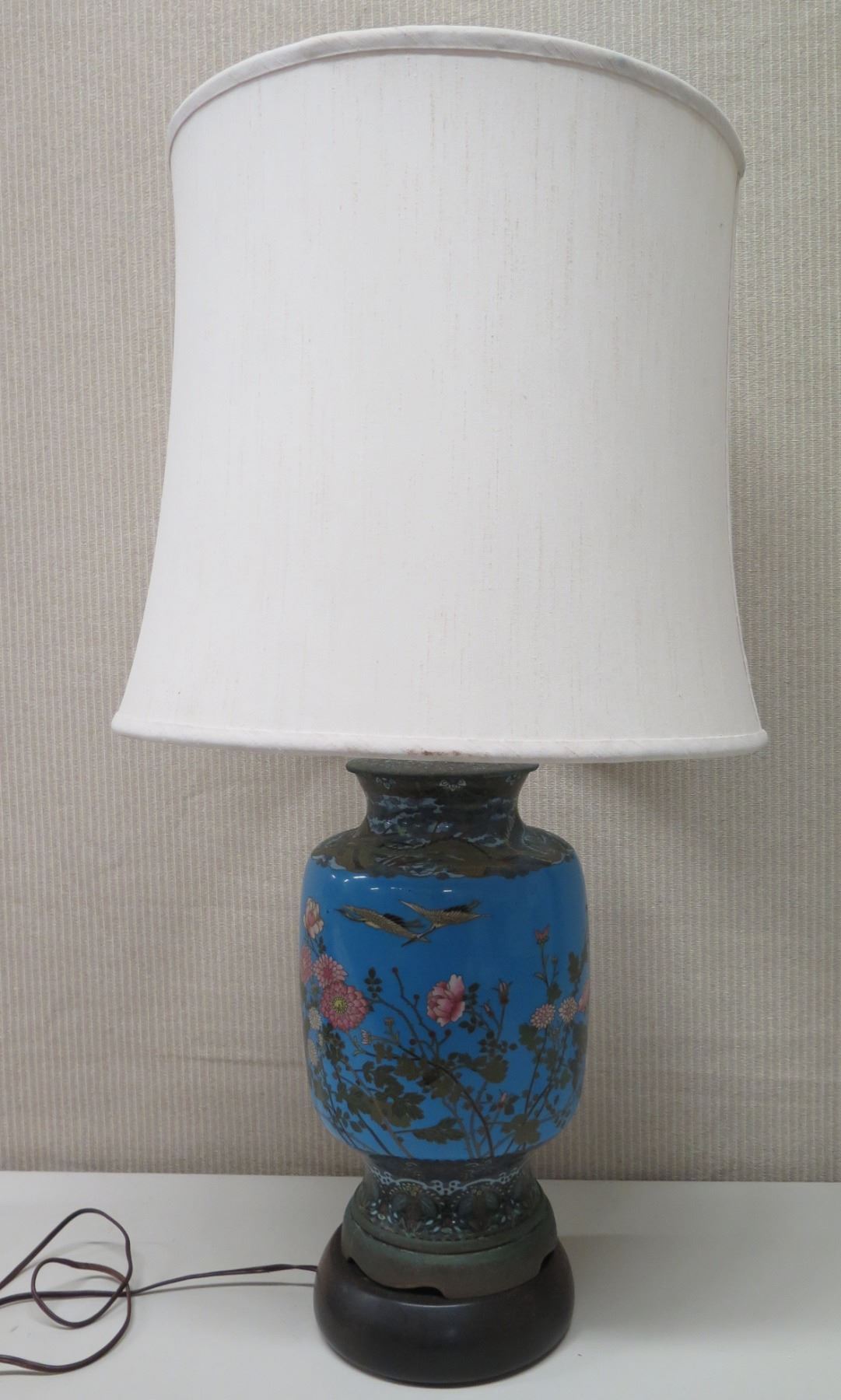 Blue Oriental Porcelain Lamp w/ Round Base & White Shade