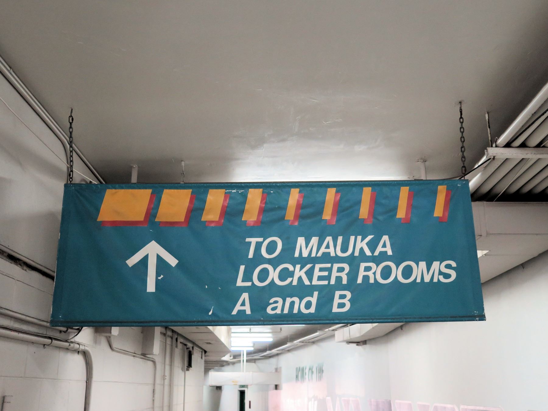 Blue 'To Mauka Locker Rooms A and B' w/ Arrow Sign 74"x25". Note: Signs will be removed if hanging prior to pick up