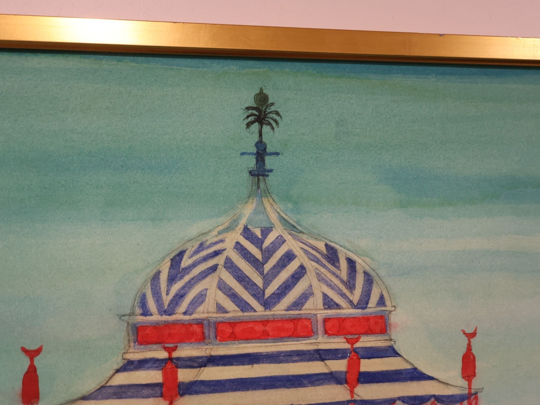 Blue and White Herringbone Garden Folly Artwork by Mary Maguire, Framed 25" x 19"