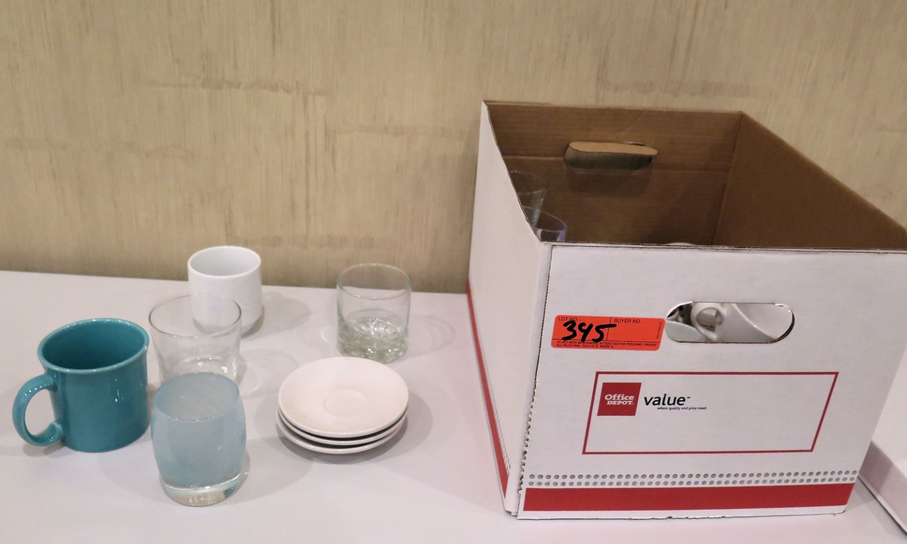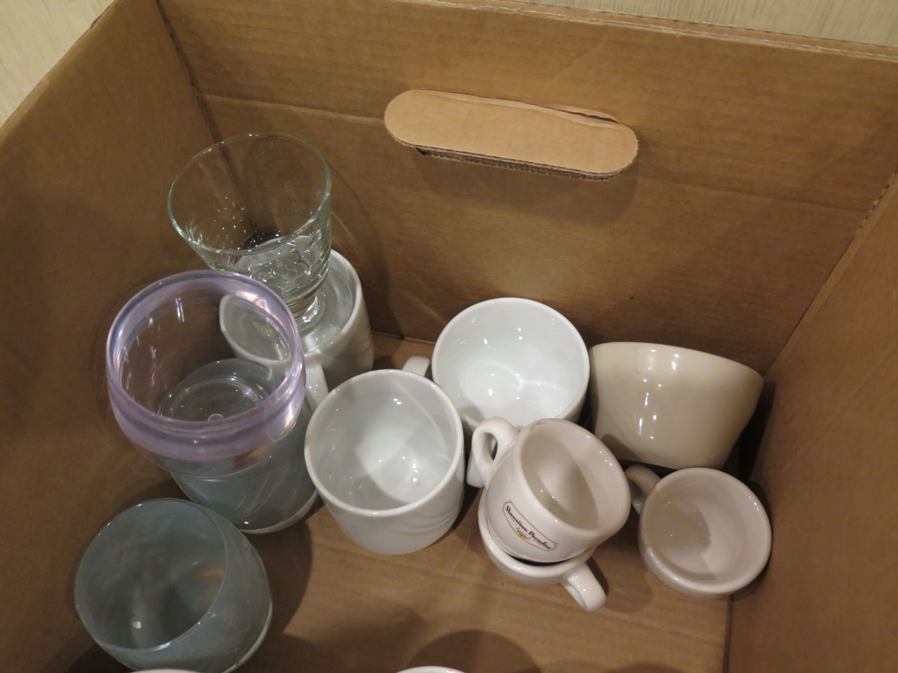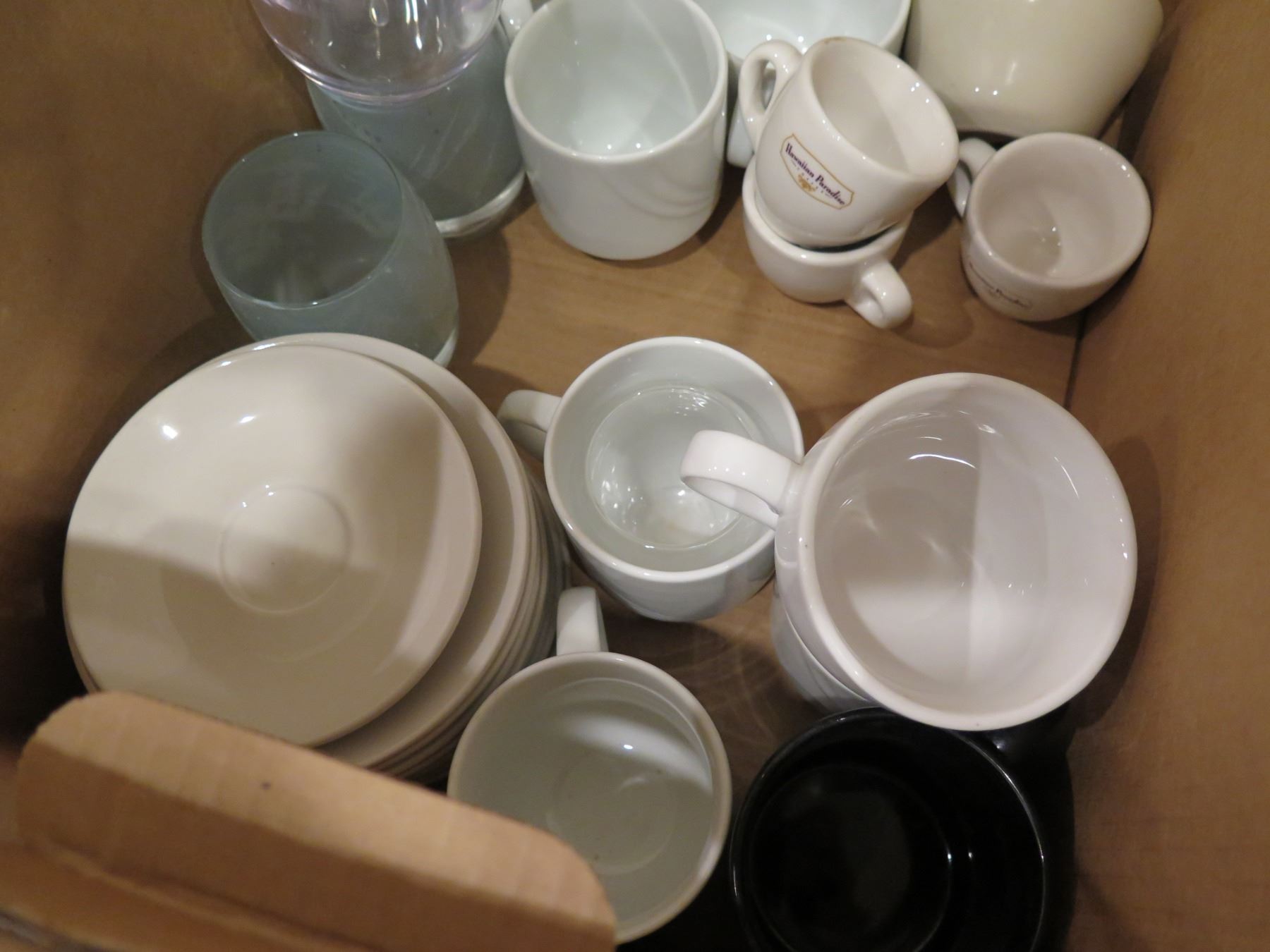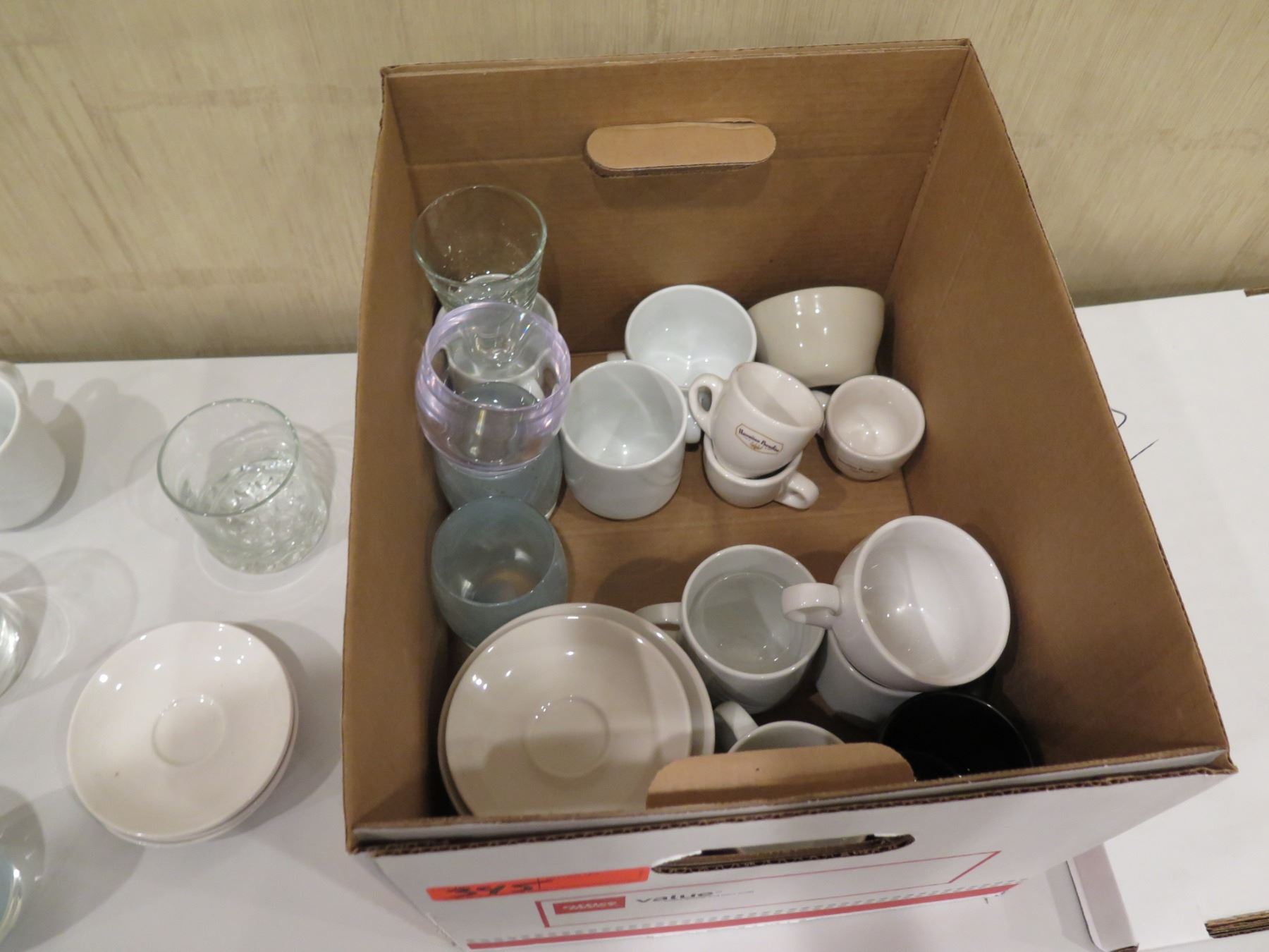 Box Misc Dishes & Glassware: Saucers, Mugs, Glasses, etc