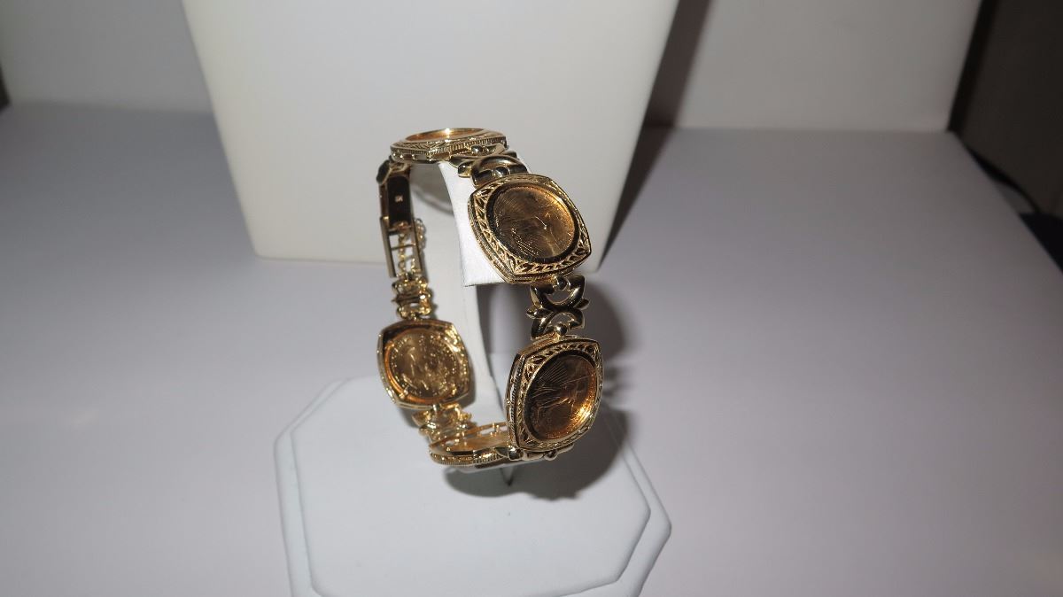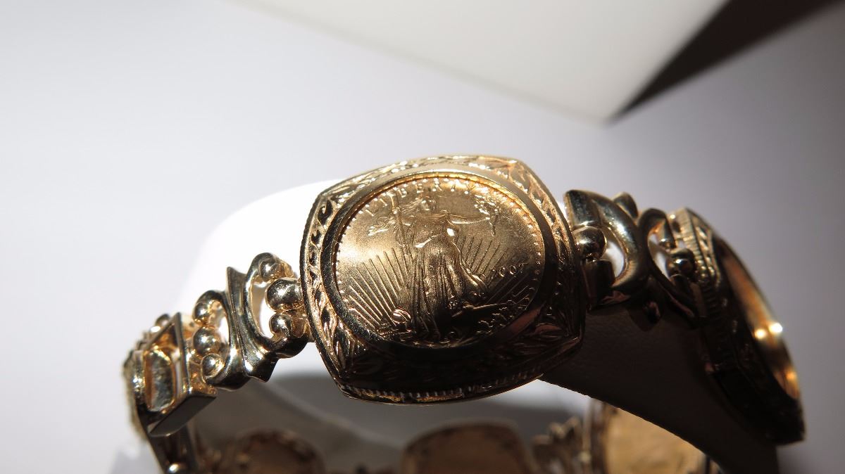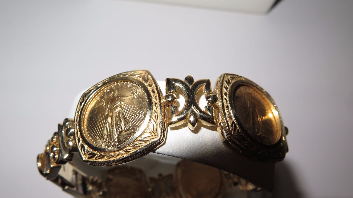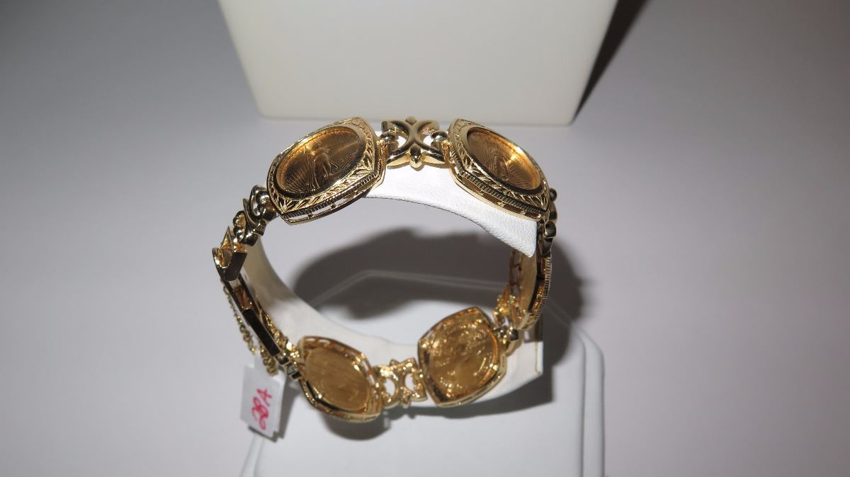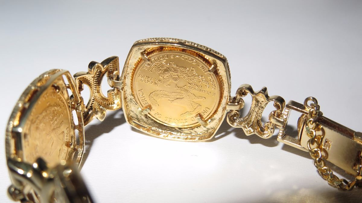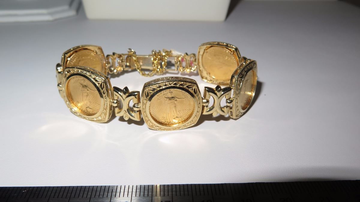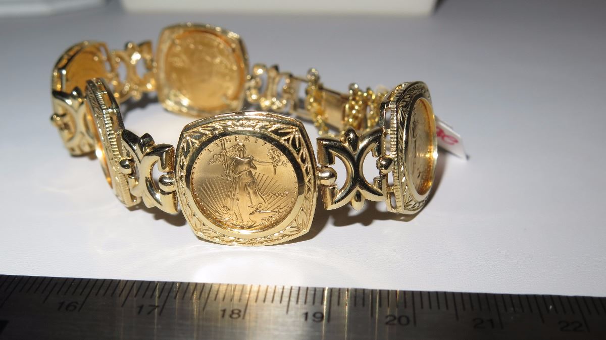 Bracelet with Five 1/10 oz American Eagle 22K Gold Coins in 14K Gold Link Setting. Each of the 5 coins are 1/10 oz.