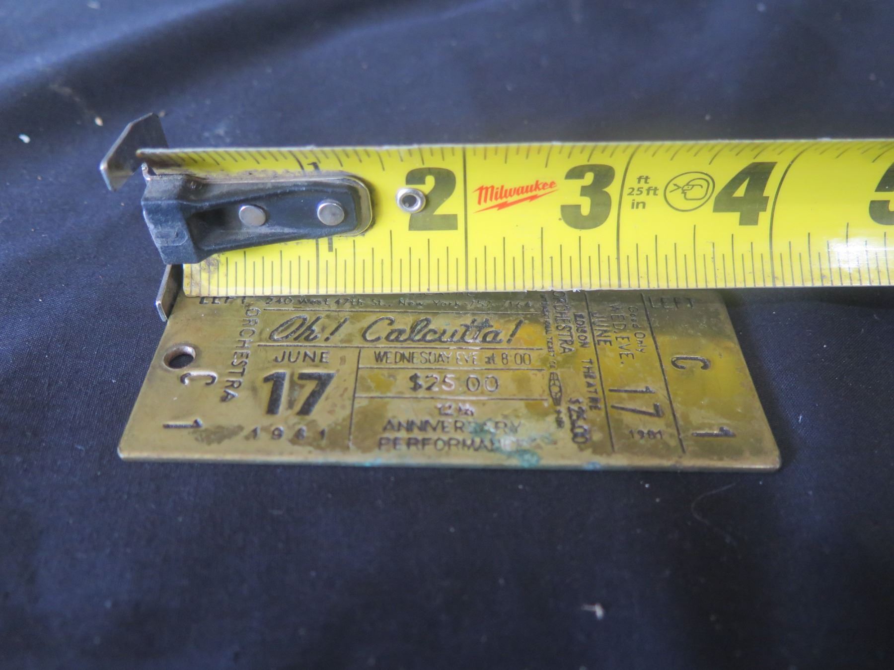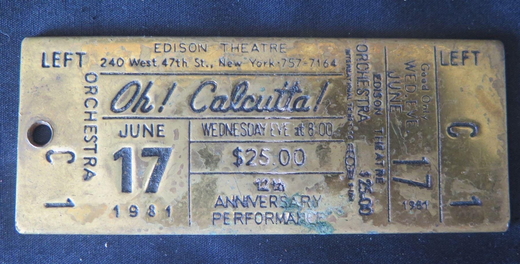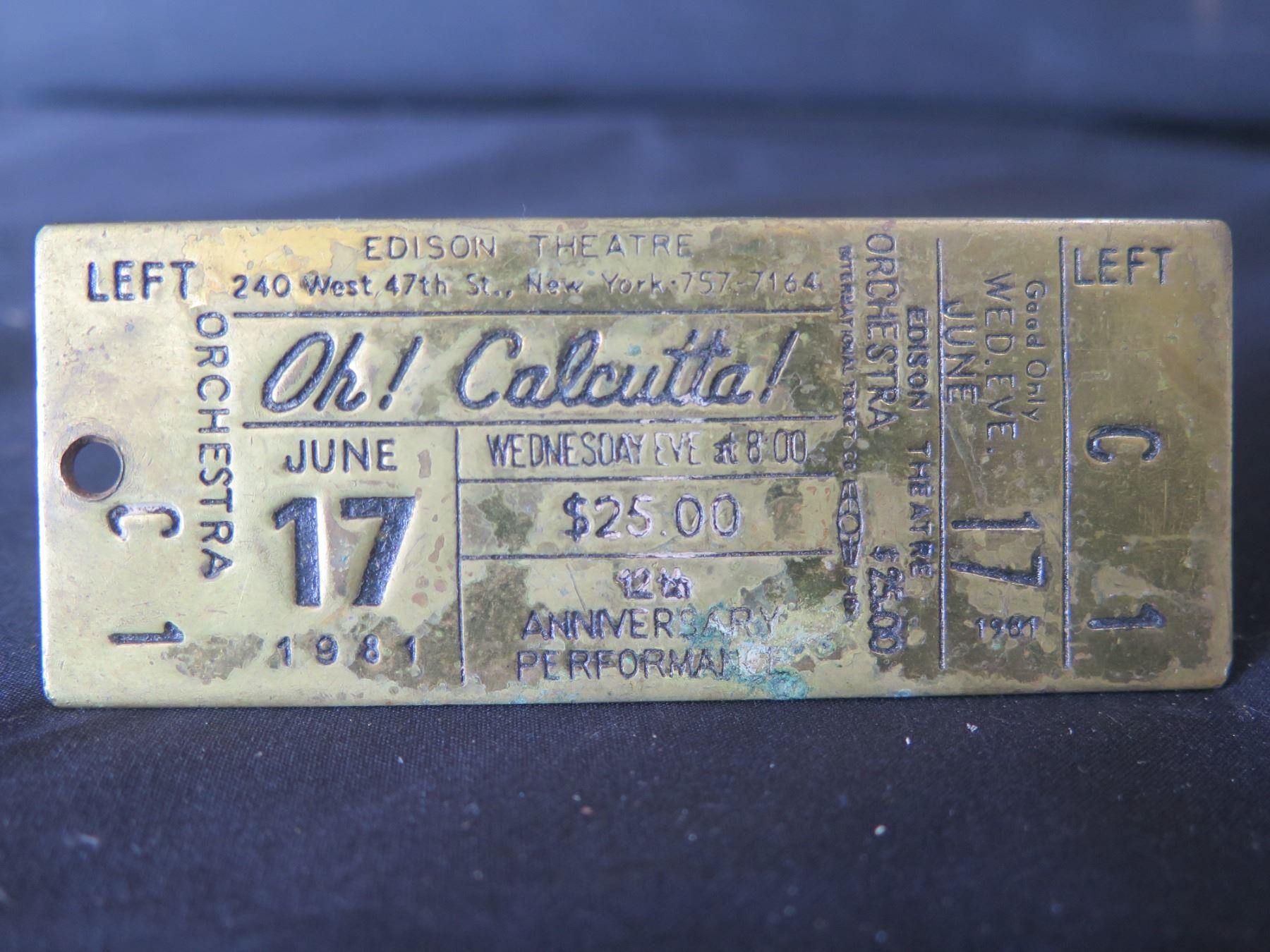 Brass "Oh! Calcutta" Ticket, Edison Theater New York June 1984