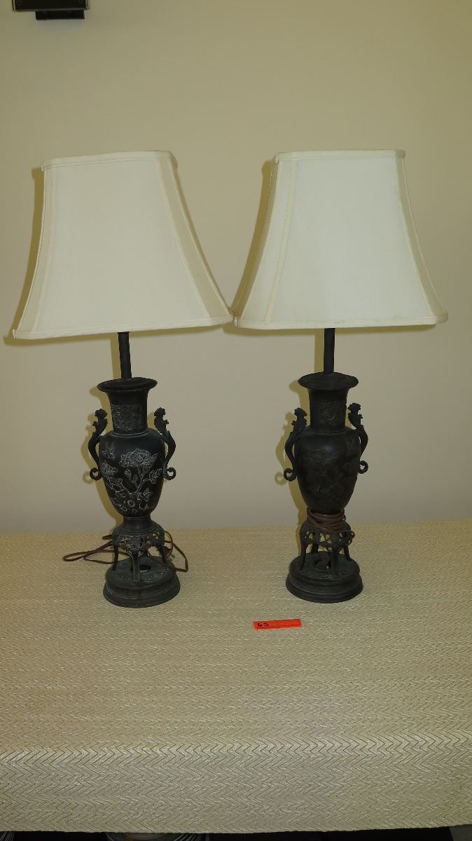 Bronze Cast Lamps w/Natural Patina - Raised Floral & Bird Motif (Approx. 32" H)