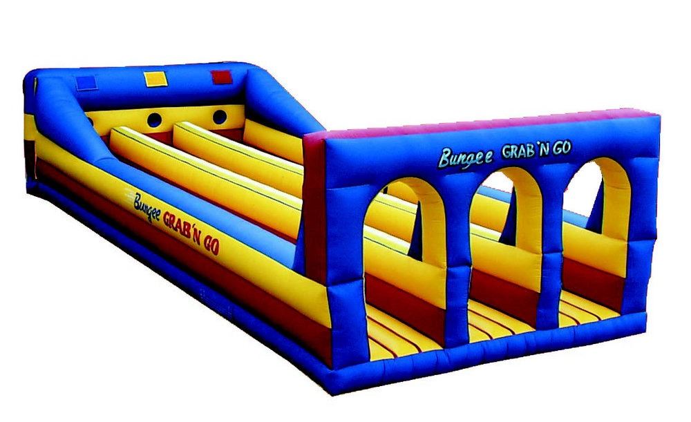 Bungee Run Grab & Go. The bungee run is a very popular ride for teenagers. Up to three players strap on a vest attached to a bungee cord. They run and try to go the furthest. The winner is the one that puts the marker the furthest away. Dimensions: 15'x32'