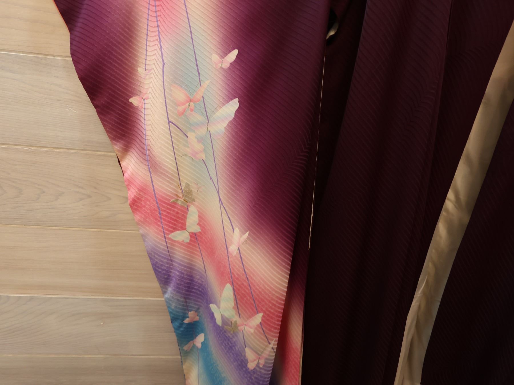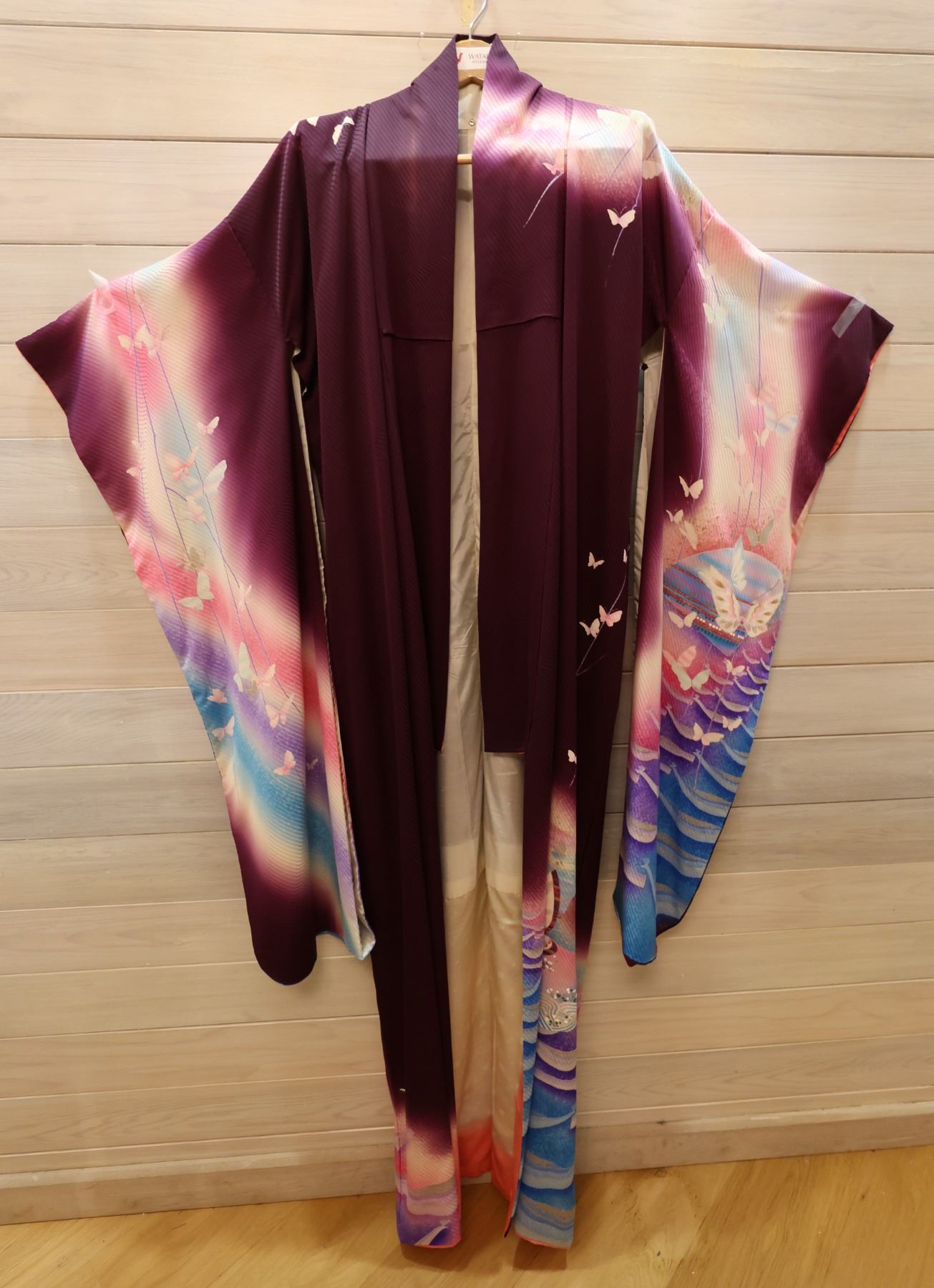 Burgundy & Blue Japanese Kimono w/ Floral Design & Tag Women's One Size