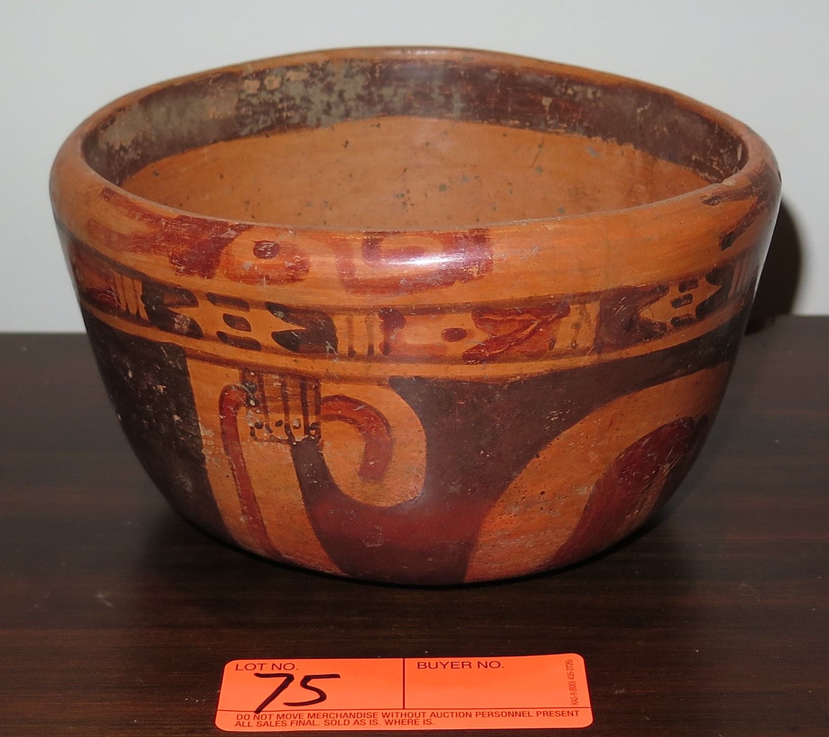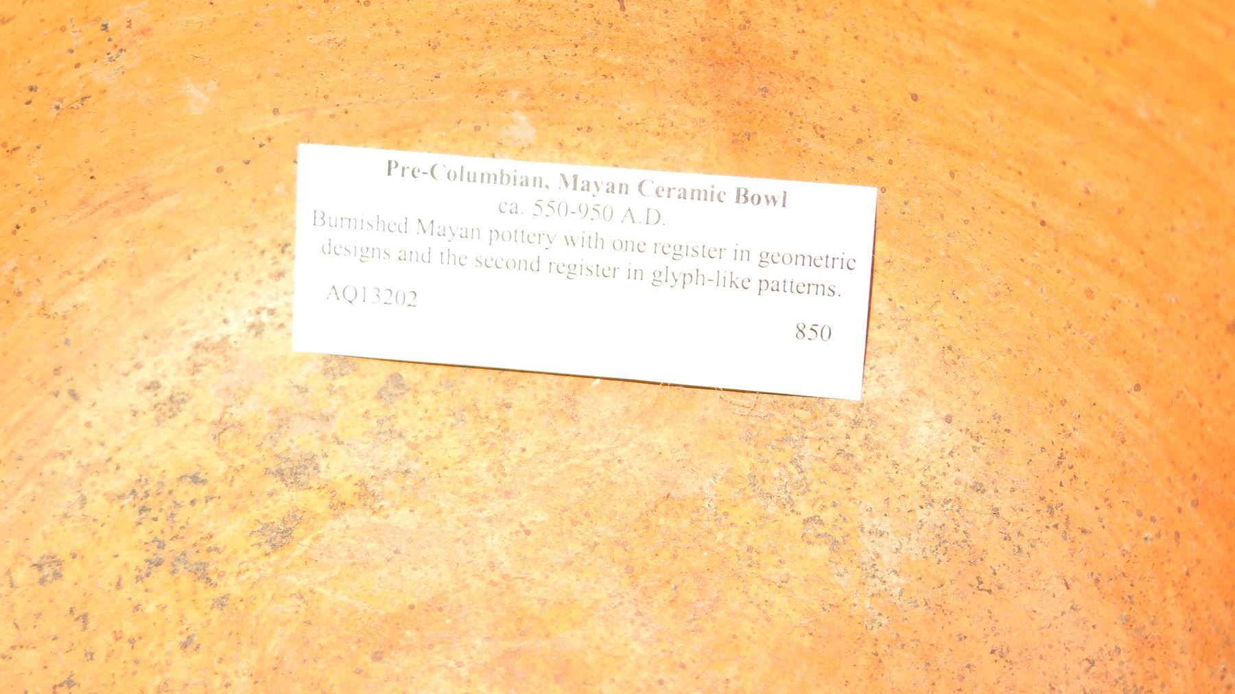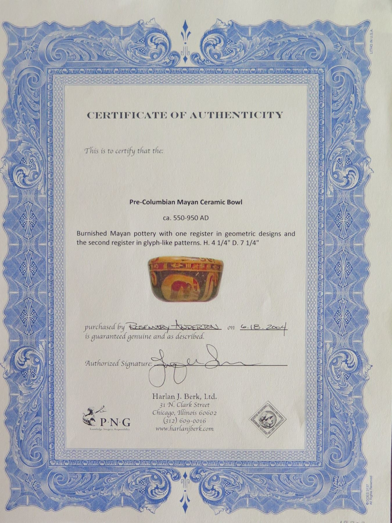 Appraised at $850 by Harlan Berk Ltd Burnished, Painted Mayan Pottery Bowl, Classic Period 550-950 A.D. 4.25" H, 7.25" Dia. Geometric and glyph-like patterns. . Includes Certificate of Authenticity