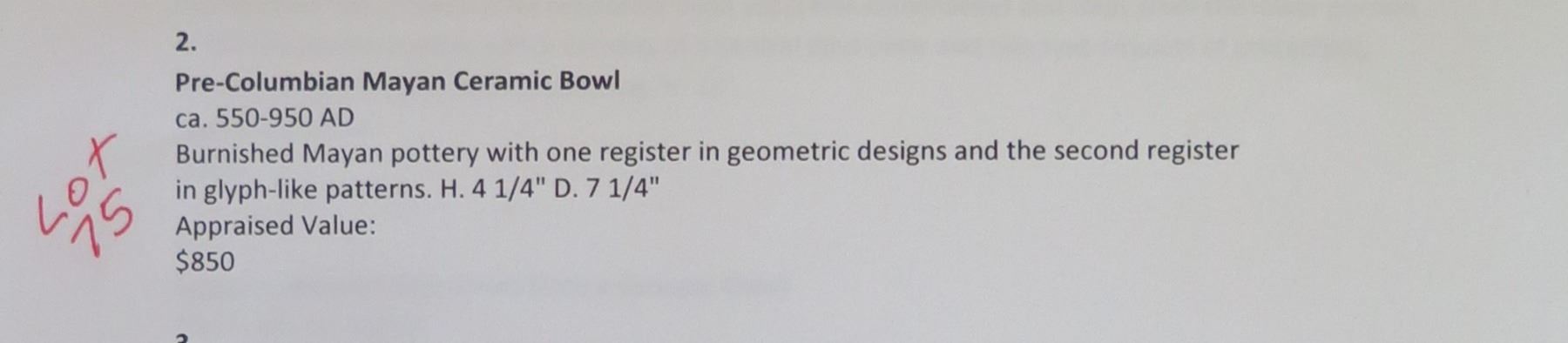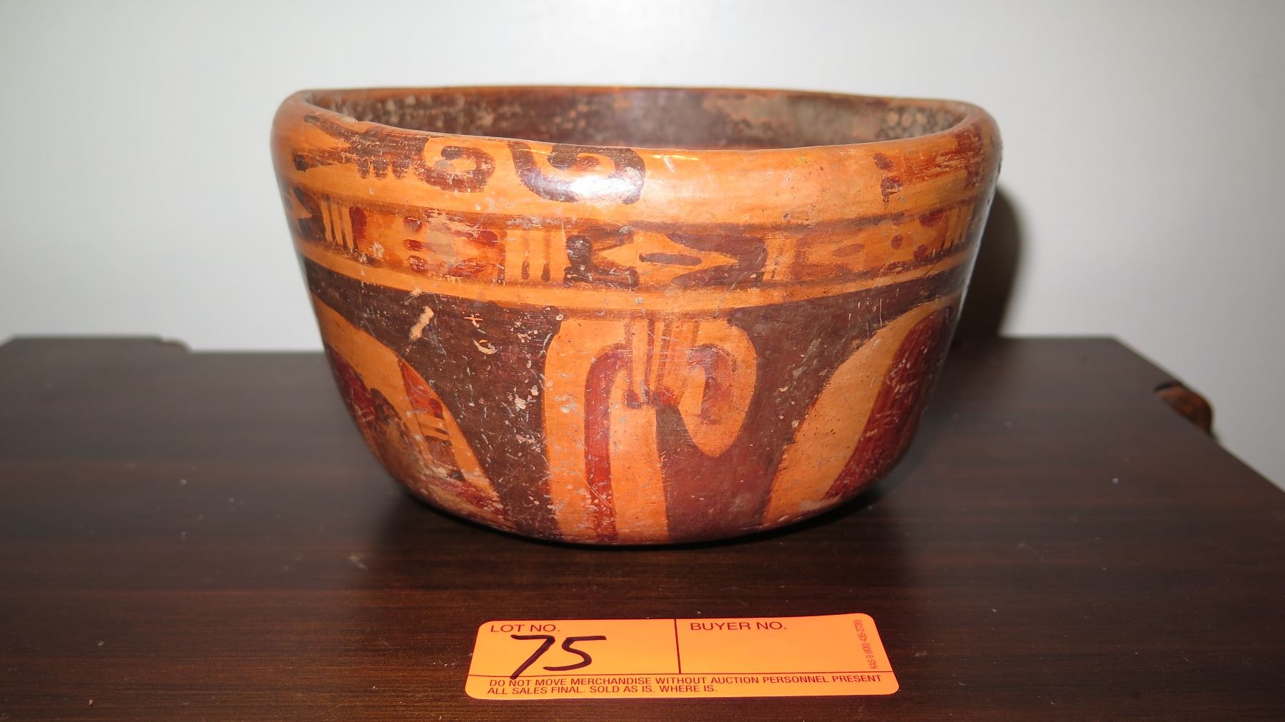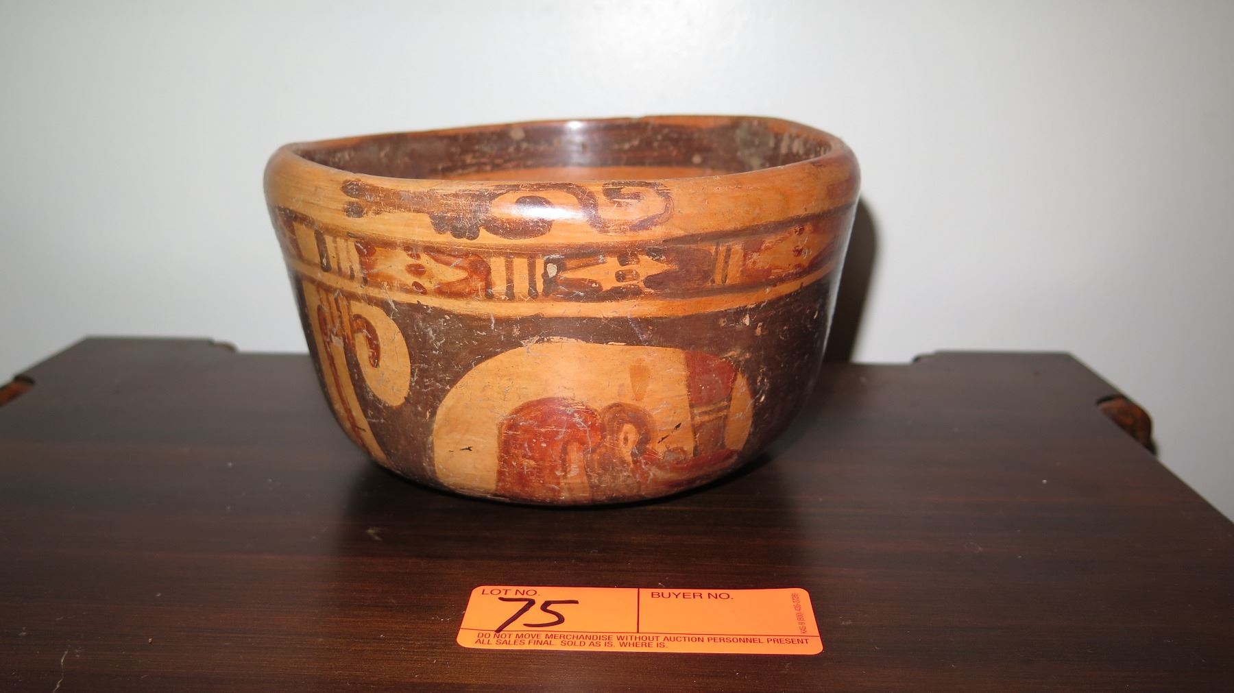 Appraised at $850 by Harlan Berk Ltd Burnished, Painted Mayan Pottery Bowl, Classic Period 550-950 A.D. 4.25" H, 7.25" Dia. Geometric and glyph-like patterns. . Includes Certificate of Authenticity