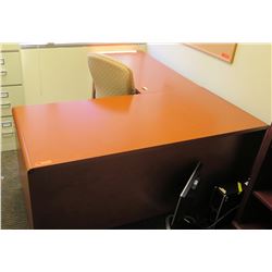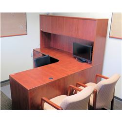 Wooden Desk Ensemble w/ Chair 73"L each side, Overhead Cabinet 65"H. Buyer will be responsible for disassembling and removing all purchase...
