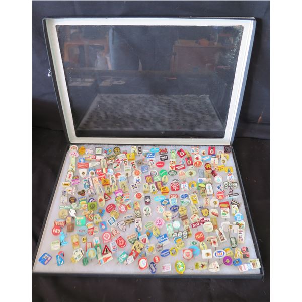 119B - Multiple Pins & Medals: Cities, Cars, Sports, Food, Music, etc in Display Case 16"LOahu Auctions