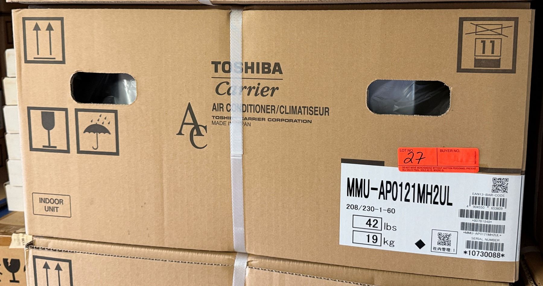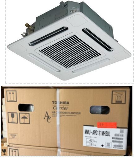 This is a stock photo representative of Unit. Carrier MMU-AP0121MH2UL Toshiba Ductless Variable Flow (VRF) 12000 Btu Indoor Compact 4-Way Heat Pump Cassette Unit w/ RBC-AMS54E-UL Remote & RBC-UM11PG(W)-UL Grill (approx retail $1,500)