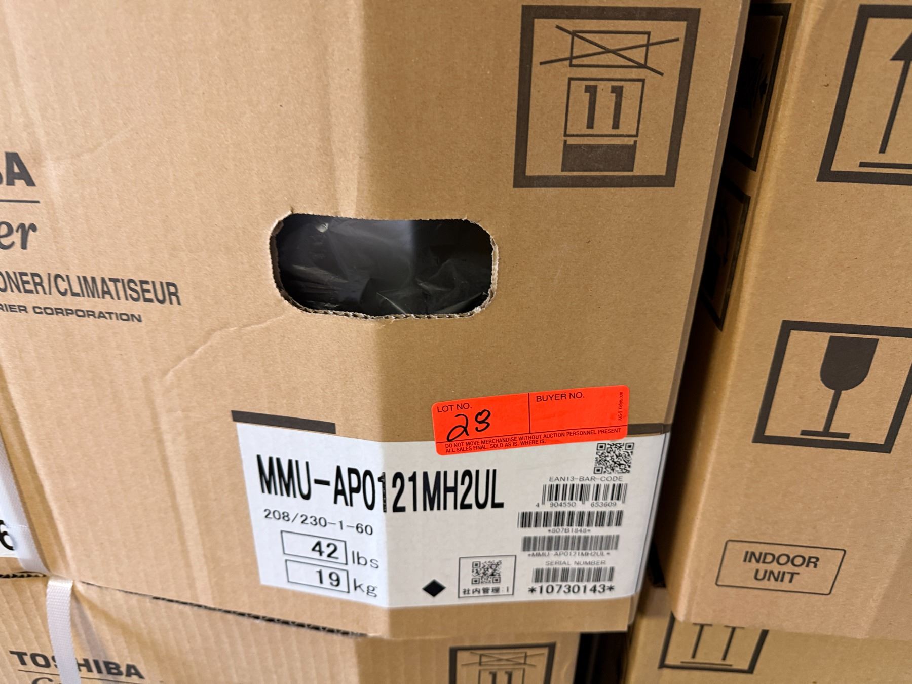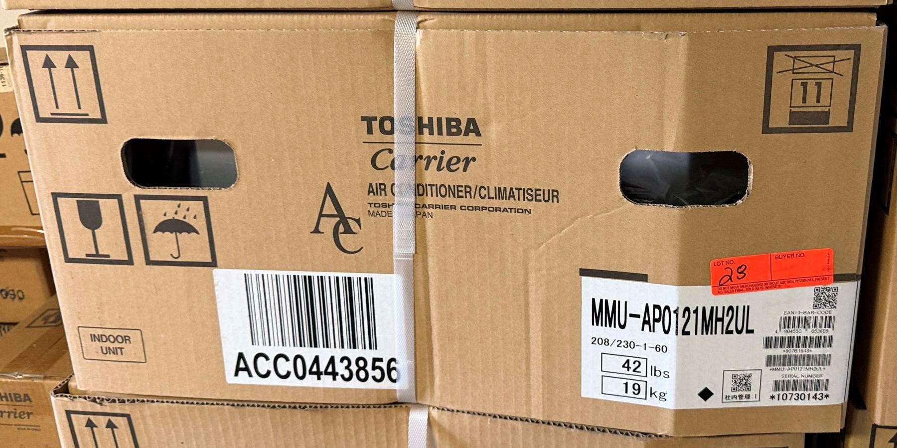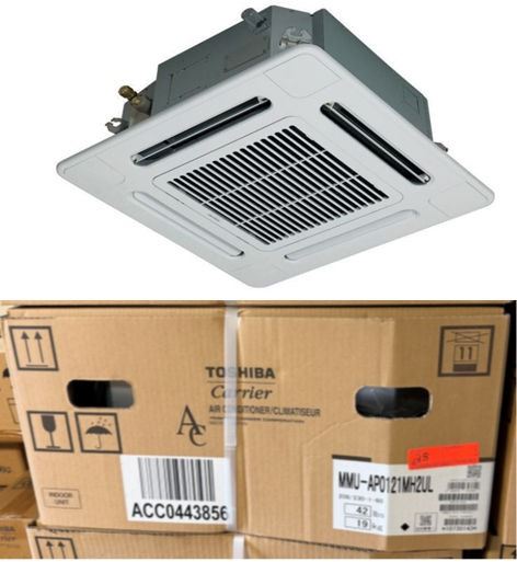 This is a stock photo representative of Unit. Carrier MMU-AP0121MH2UL Toshiba Ductless Variable Flow (VRF) 12000 Btu Indoor Compact 4-Way Heat Pump Cassette Unit w/ RBC-AMS54E-UL Remote & RBC-UM11PG(W)-UL Grill (approx retail $1,500)