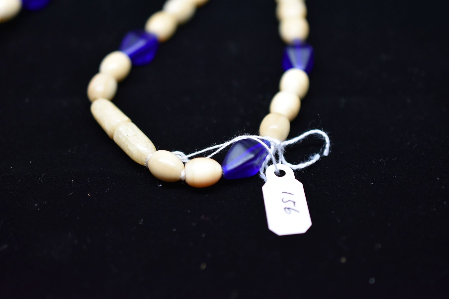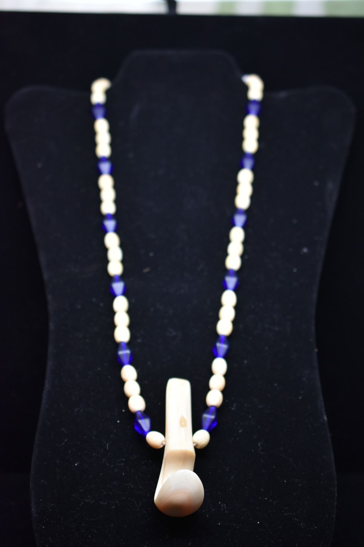 Carved Bead Necklace w/ 3" Palaoa Pendant - Period Reproduction, 7.5-9mm Beads, Cobalt Blue Glass Beads