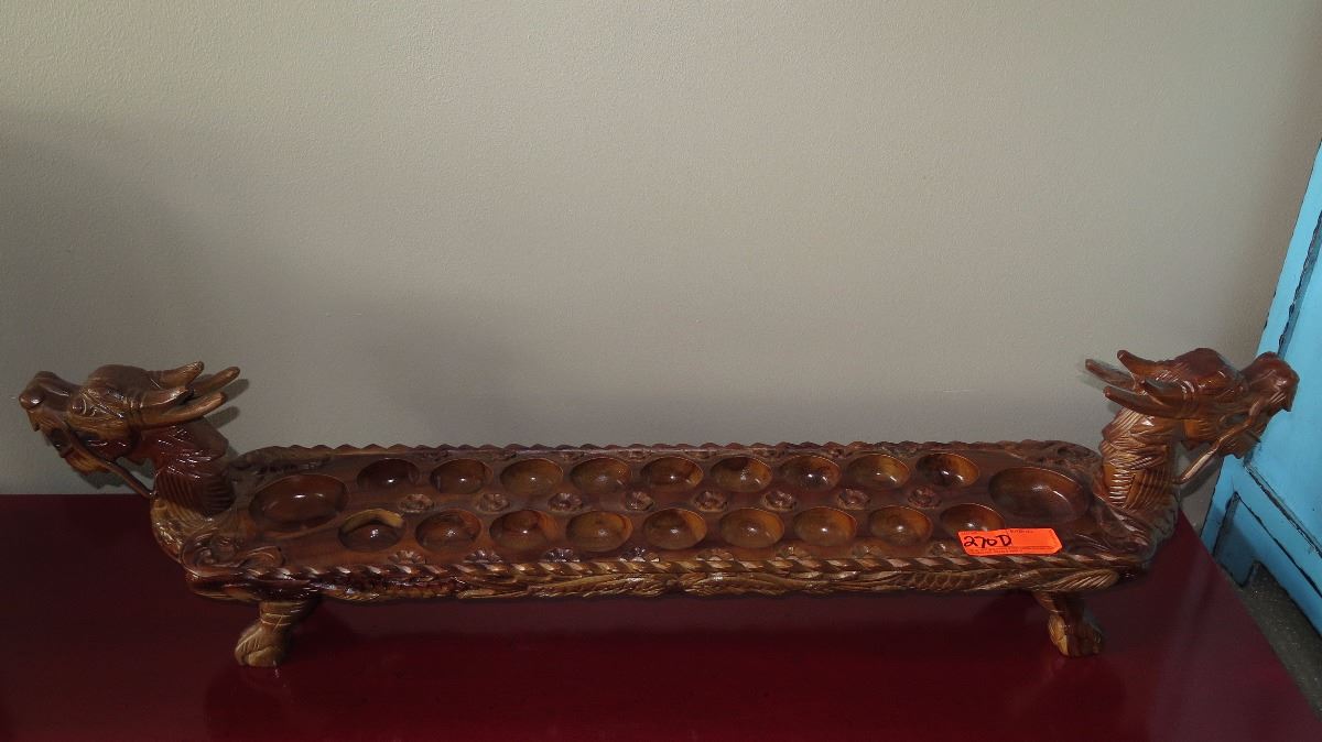 Carved Mancala Board - Dragon Heads, Claw & Ball Feet, (sml horn broken off ) 52", 13"H