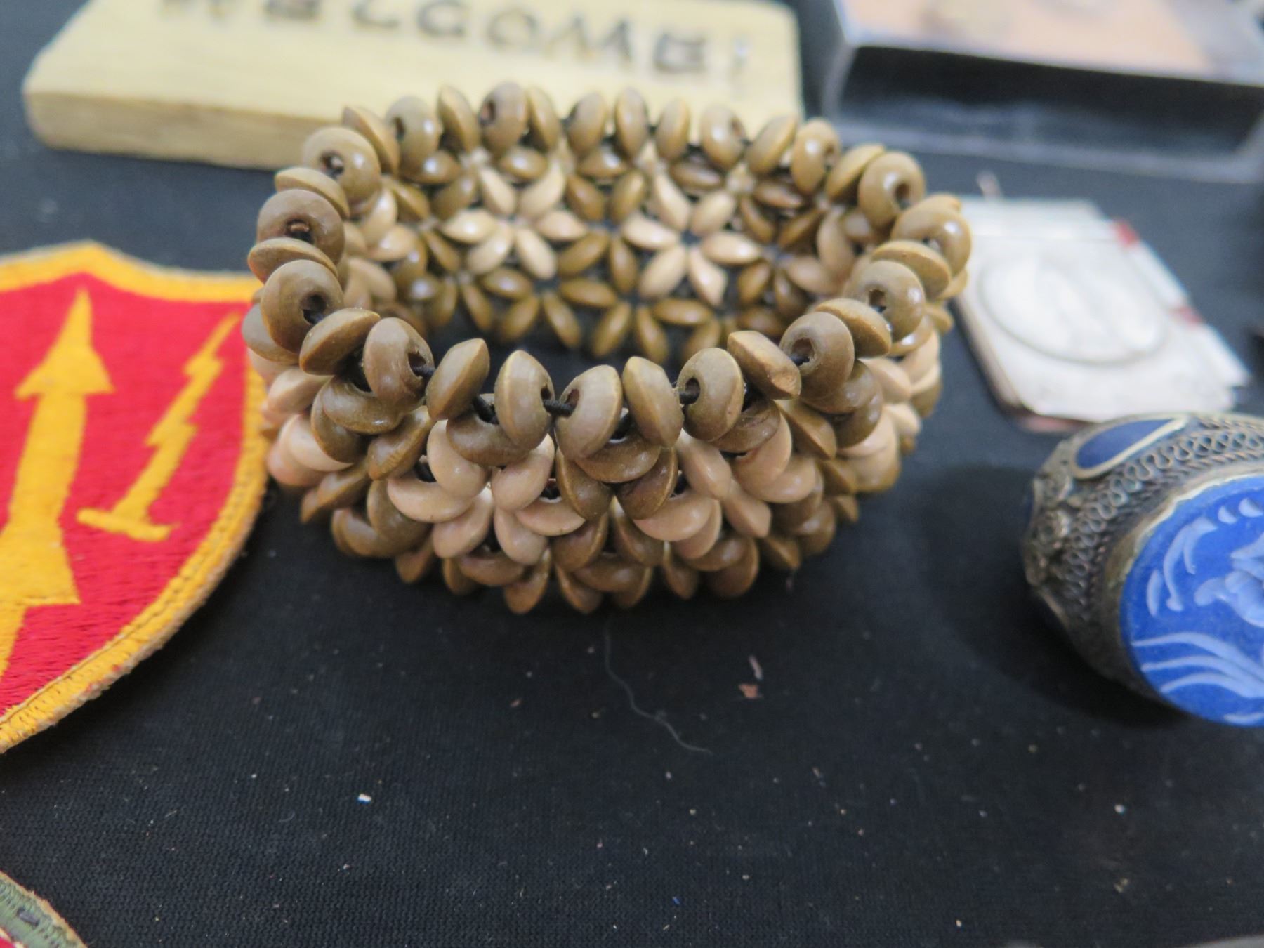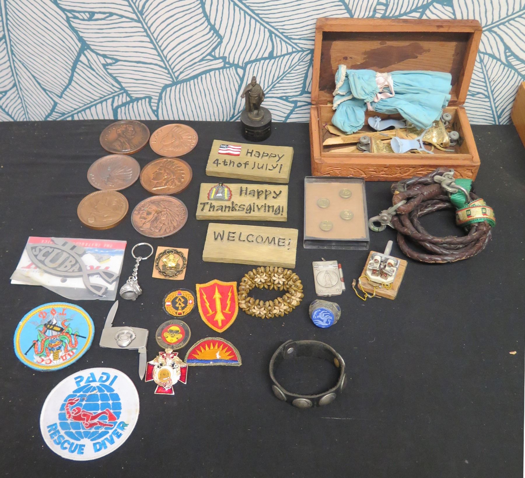 Carved Wooden Box w/ Indian Coins, Plaques, Figure, Jewelry, Key Rings, Patches, etc