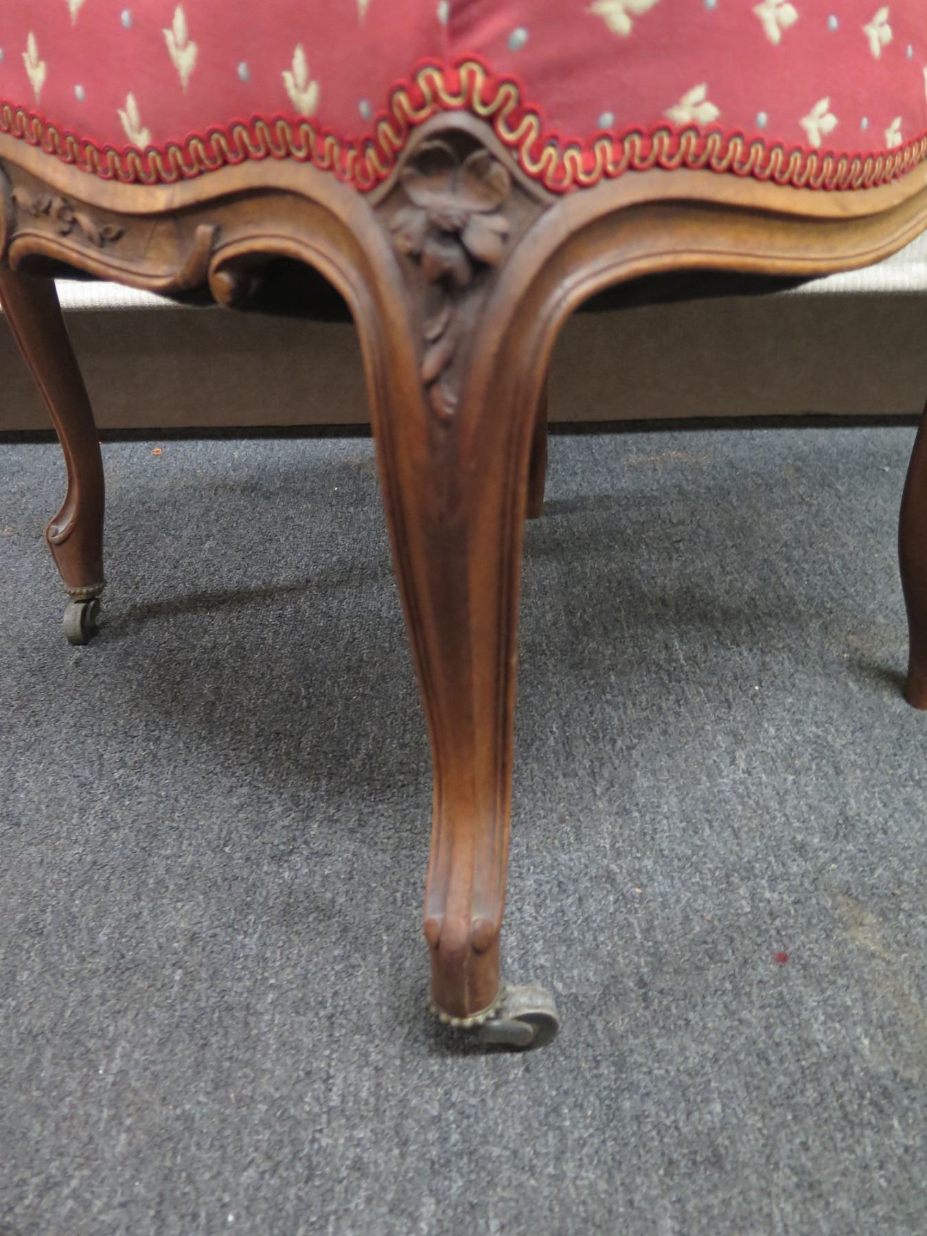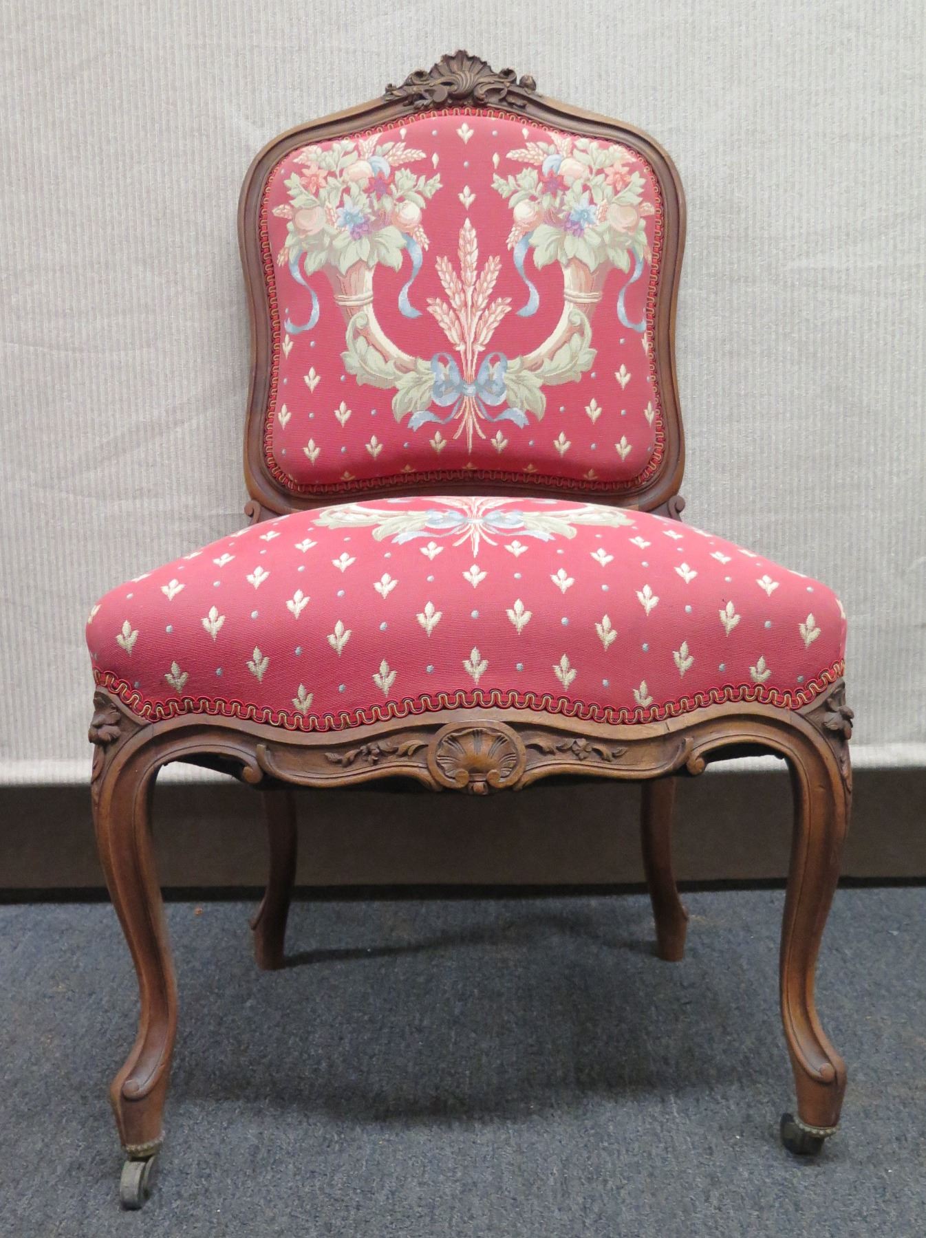 Carved Wooden Chair w/ Pink Floral Upholstered Seat & Back on Wheels 21  x 17  x 37 H