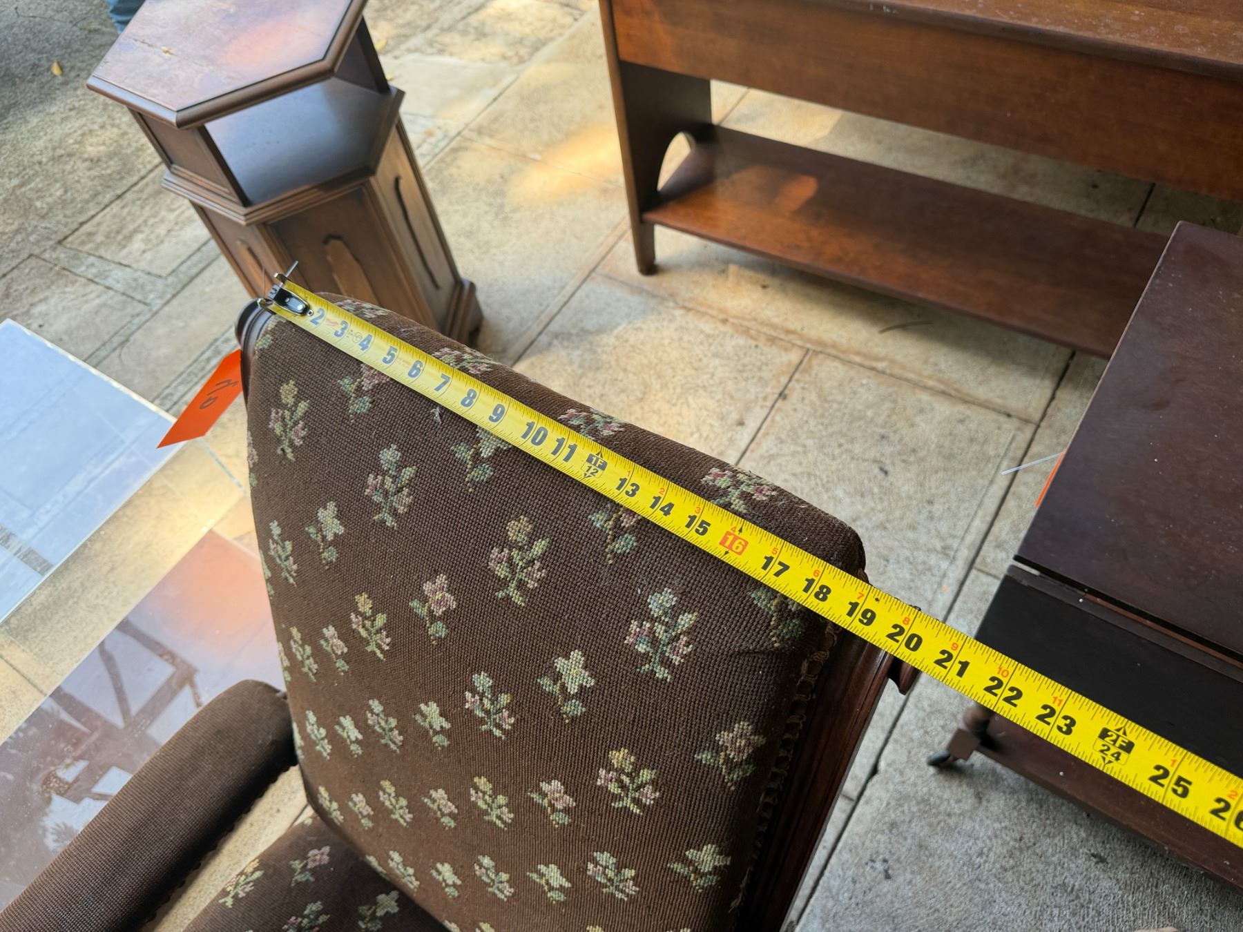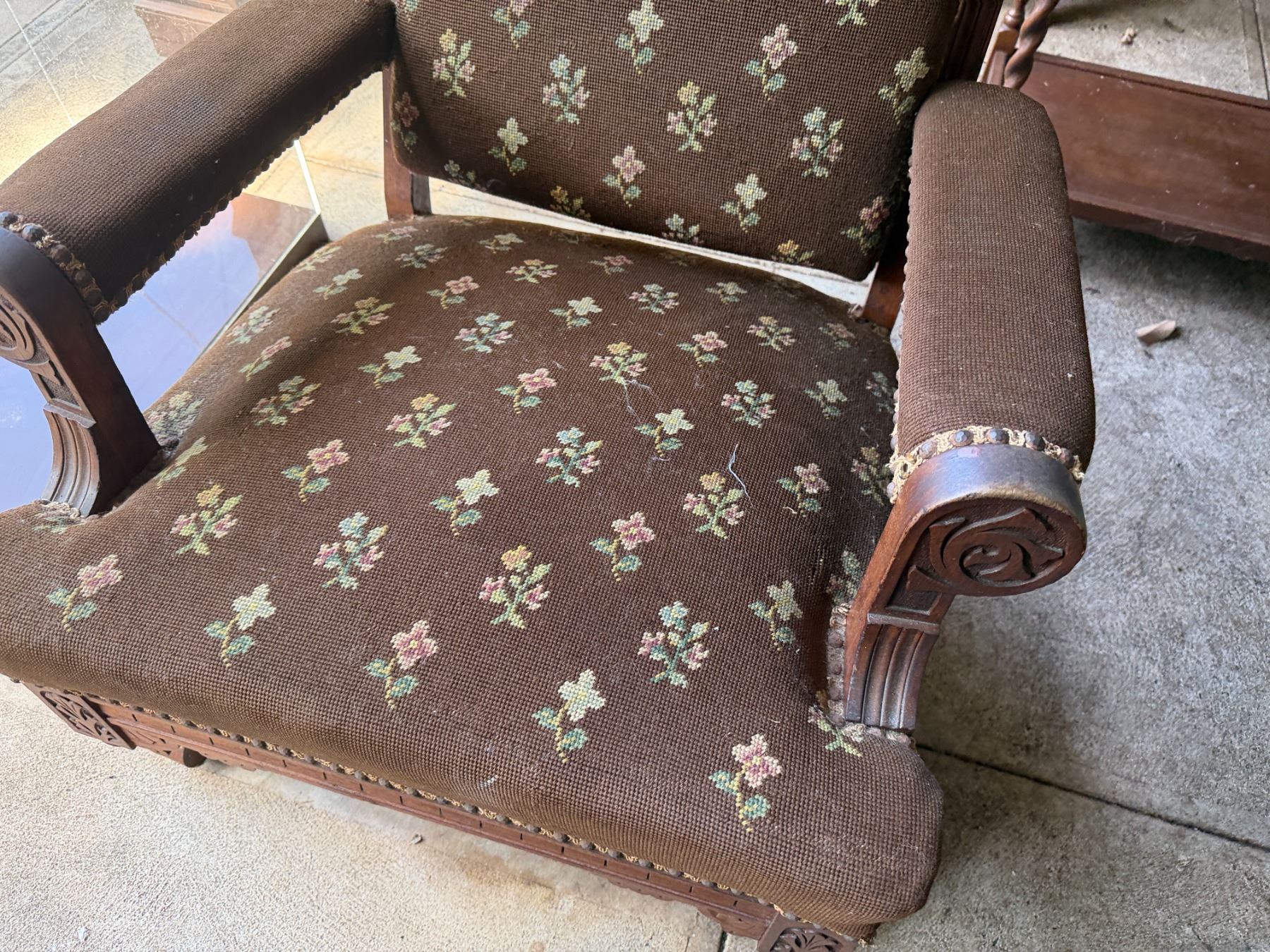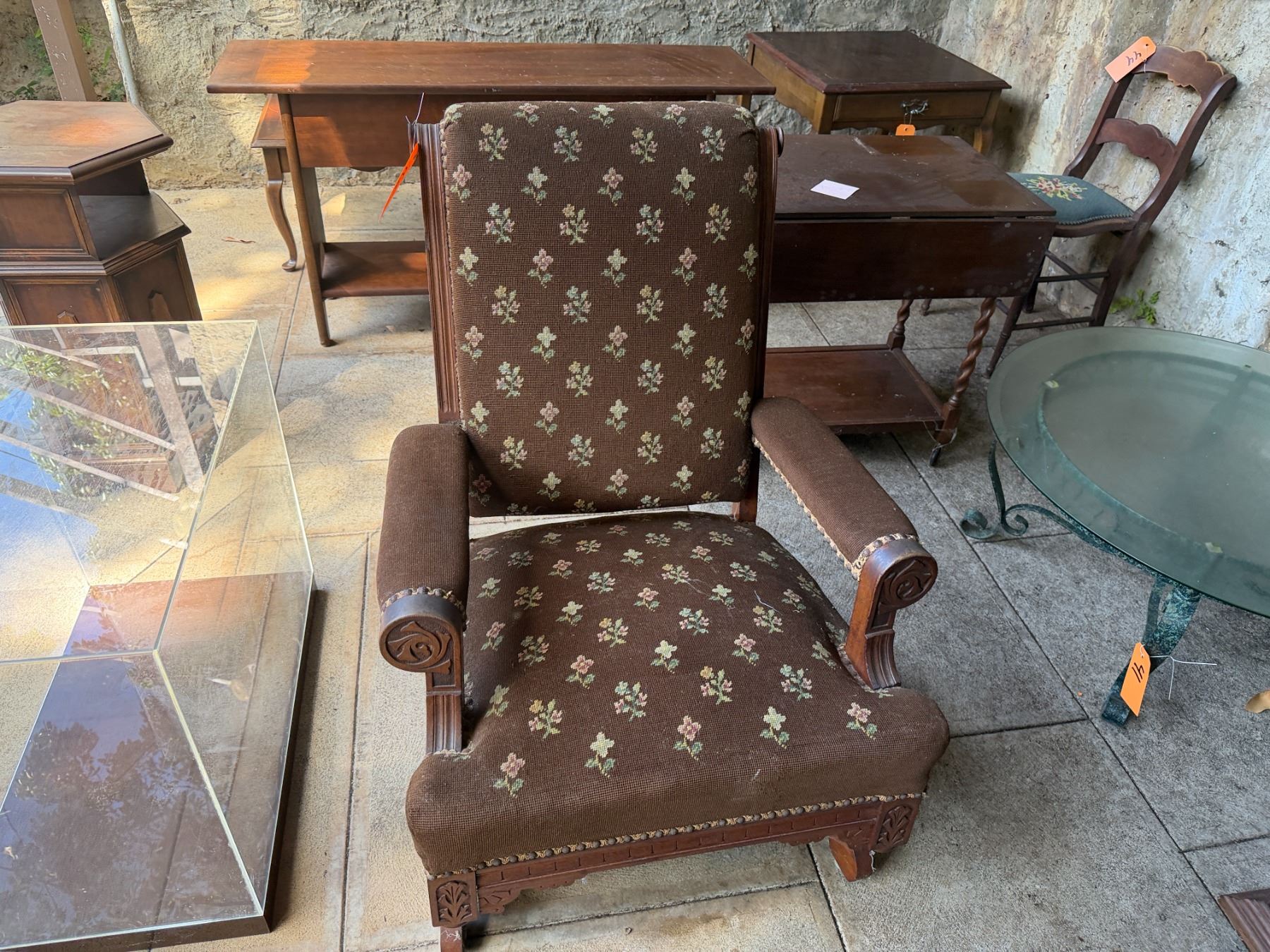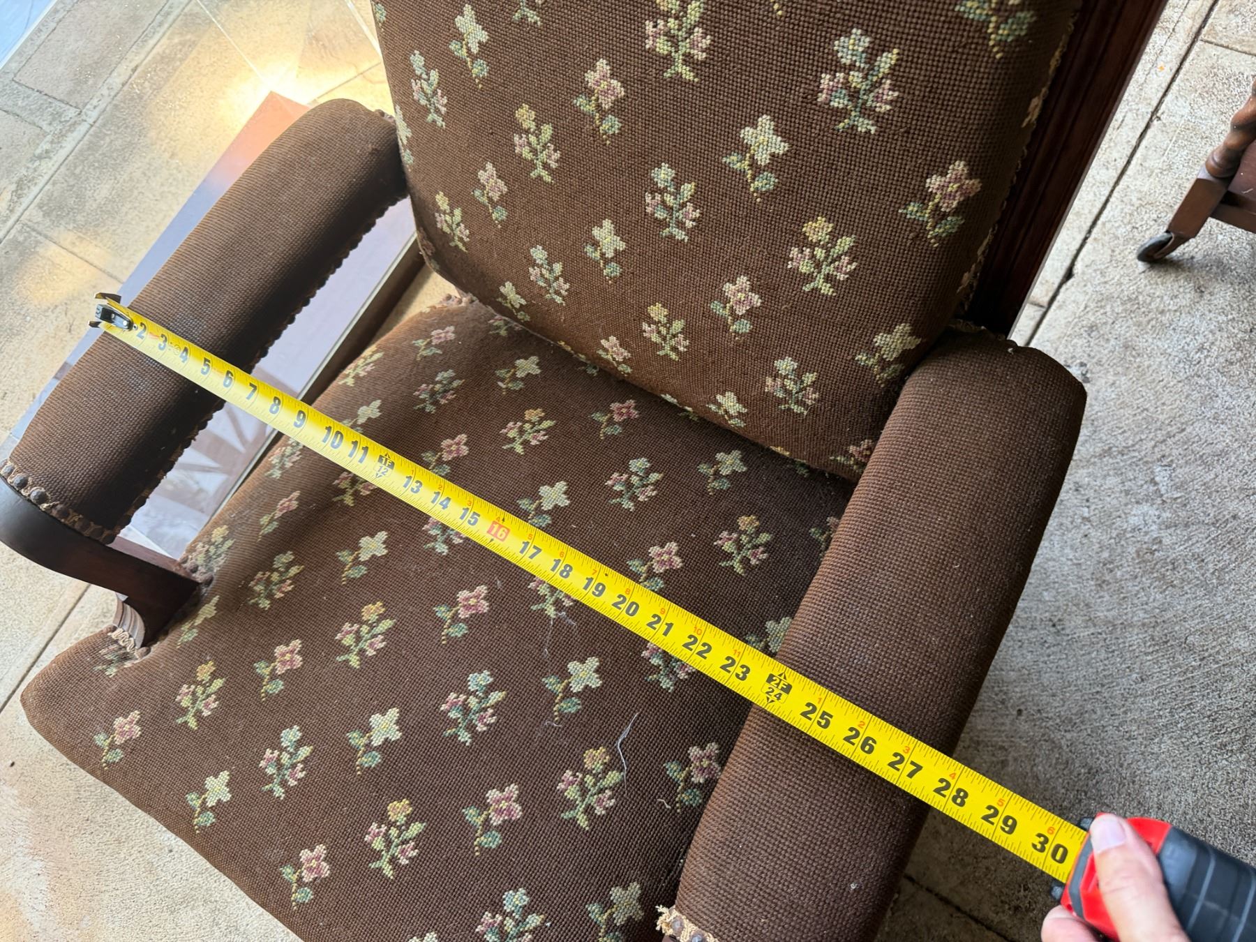 Carved Wooden Chair w/ Upholstered Back, Seat & Arms 28" x 18" x 38"H
