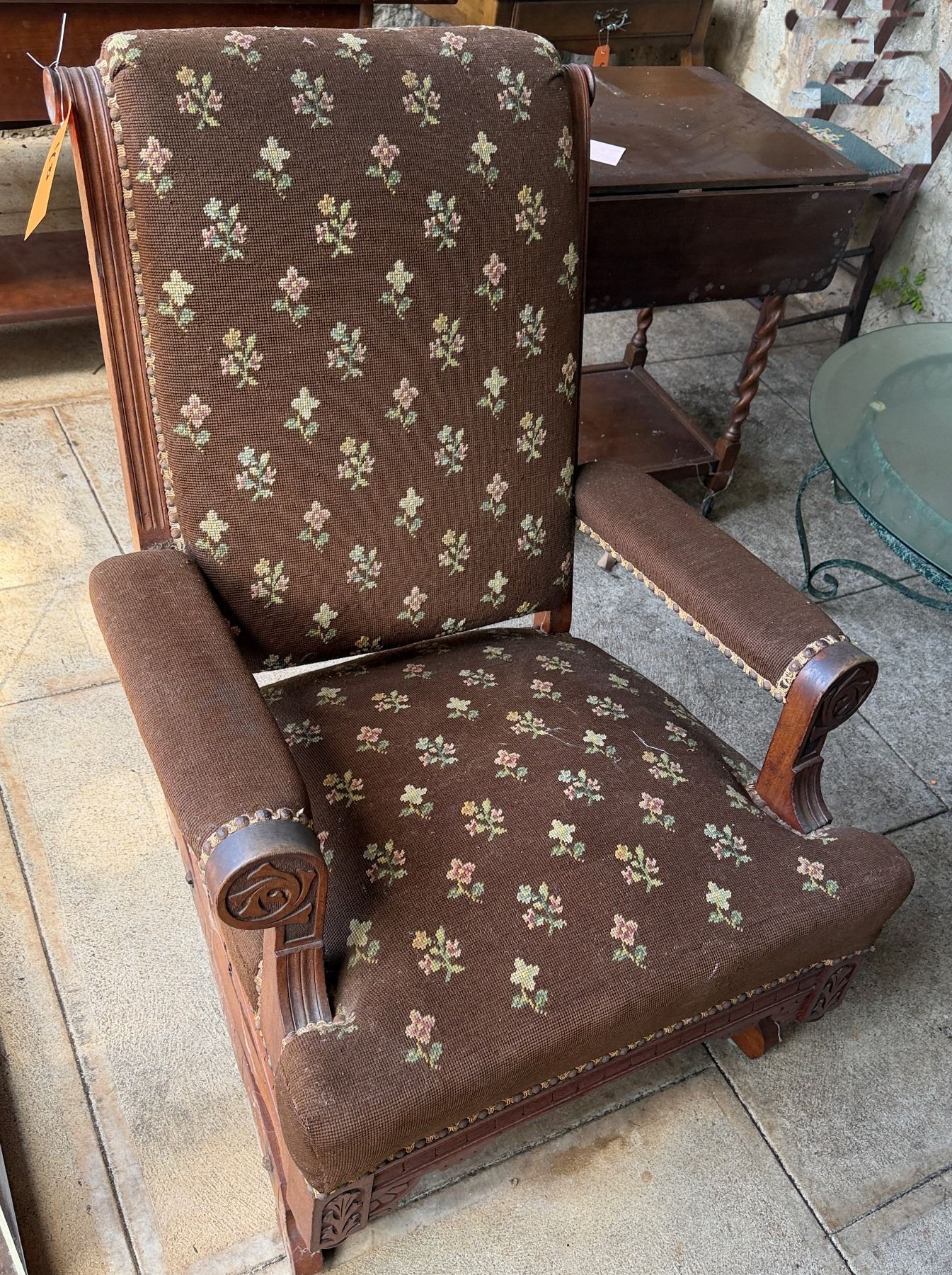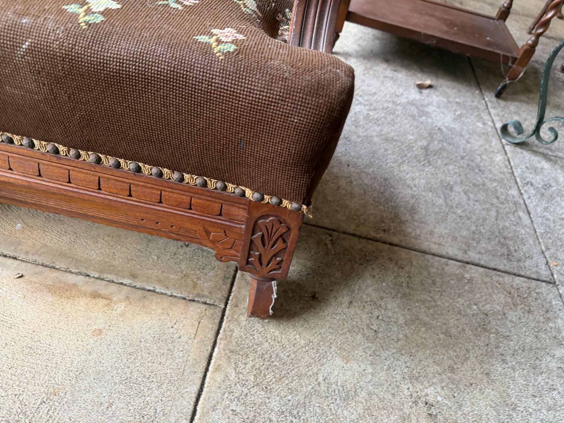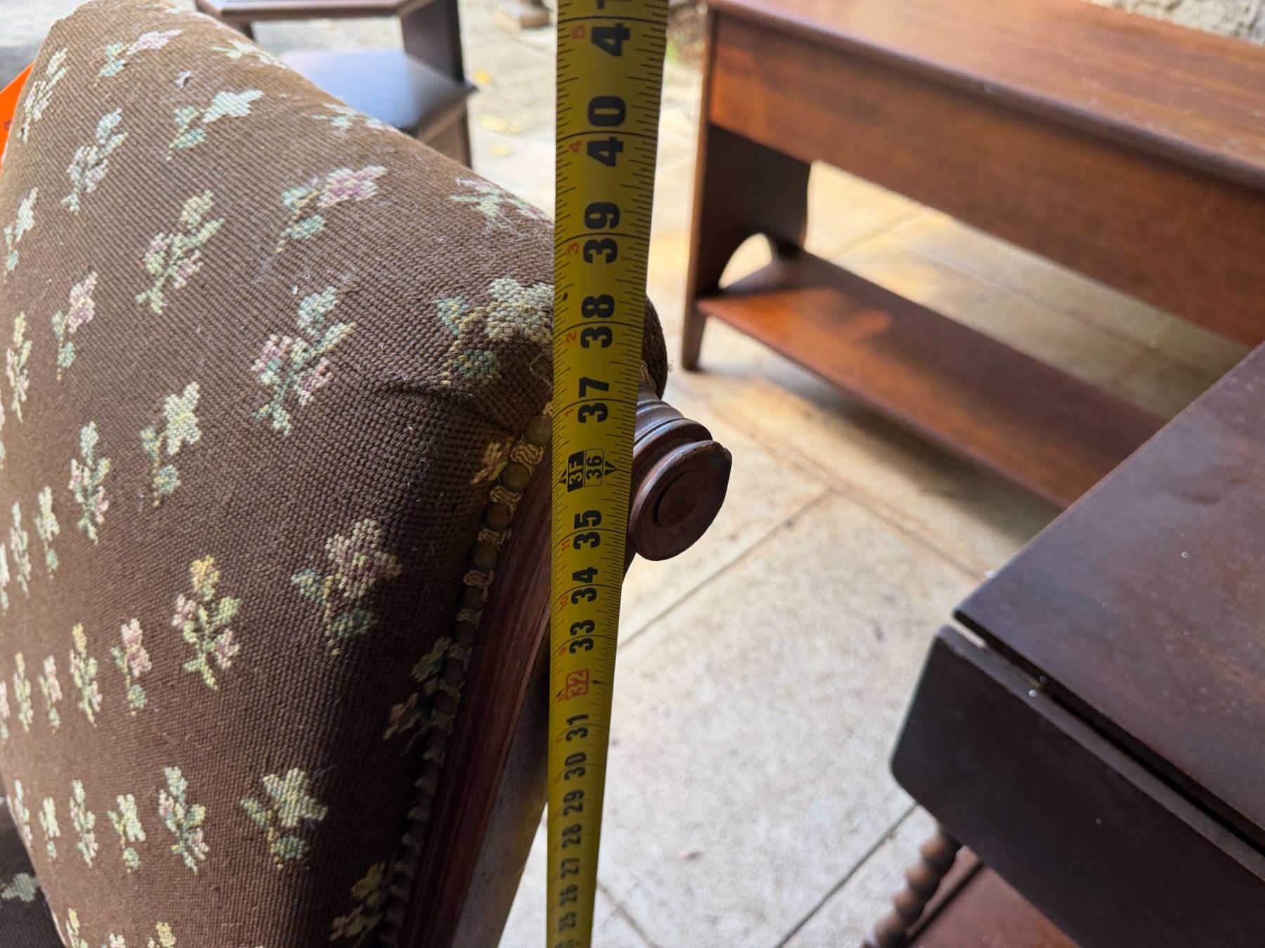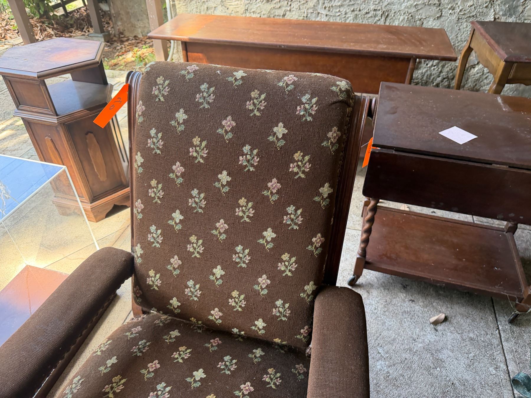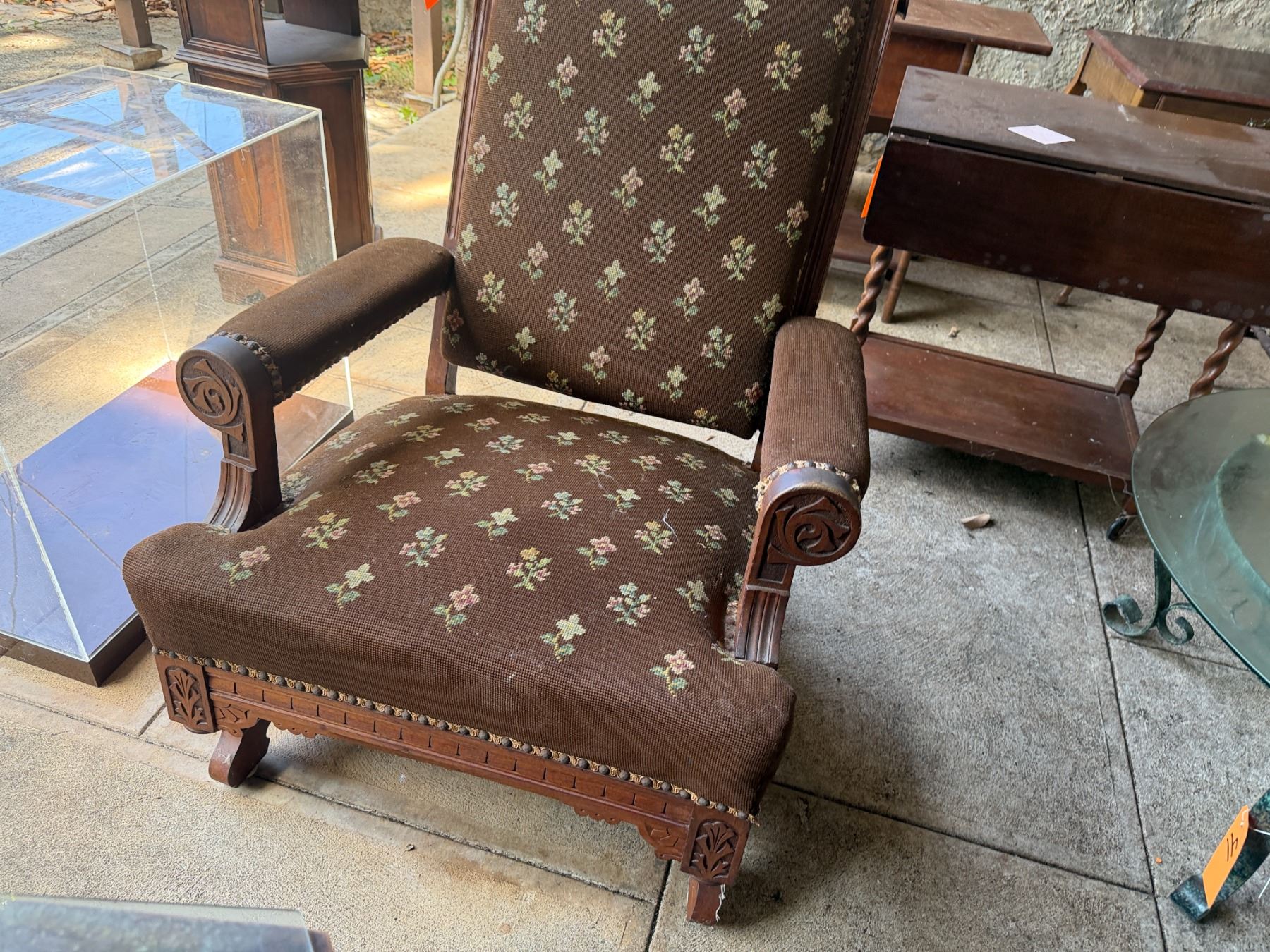 Carved Wooden Chair w/ Upholstered Back, Seat & Arms 28" x 18" x 38"H
