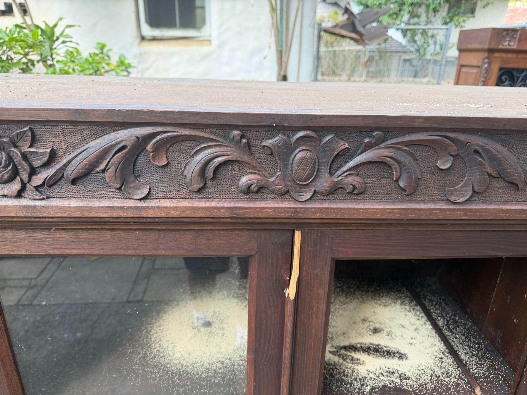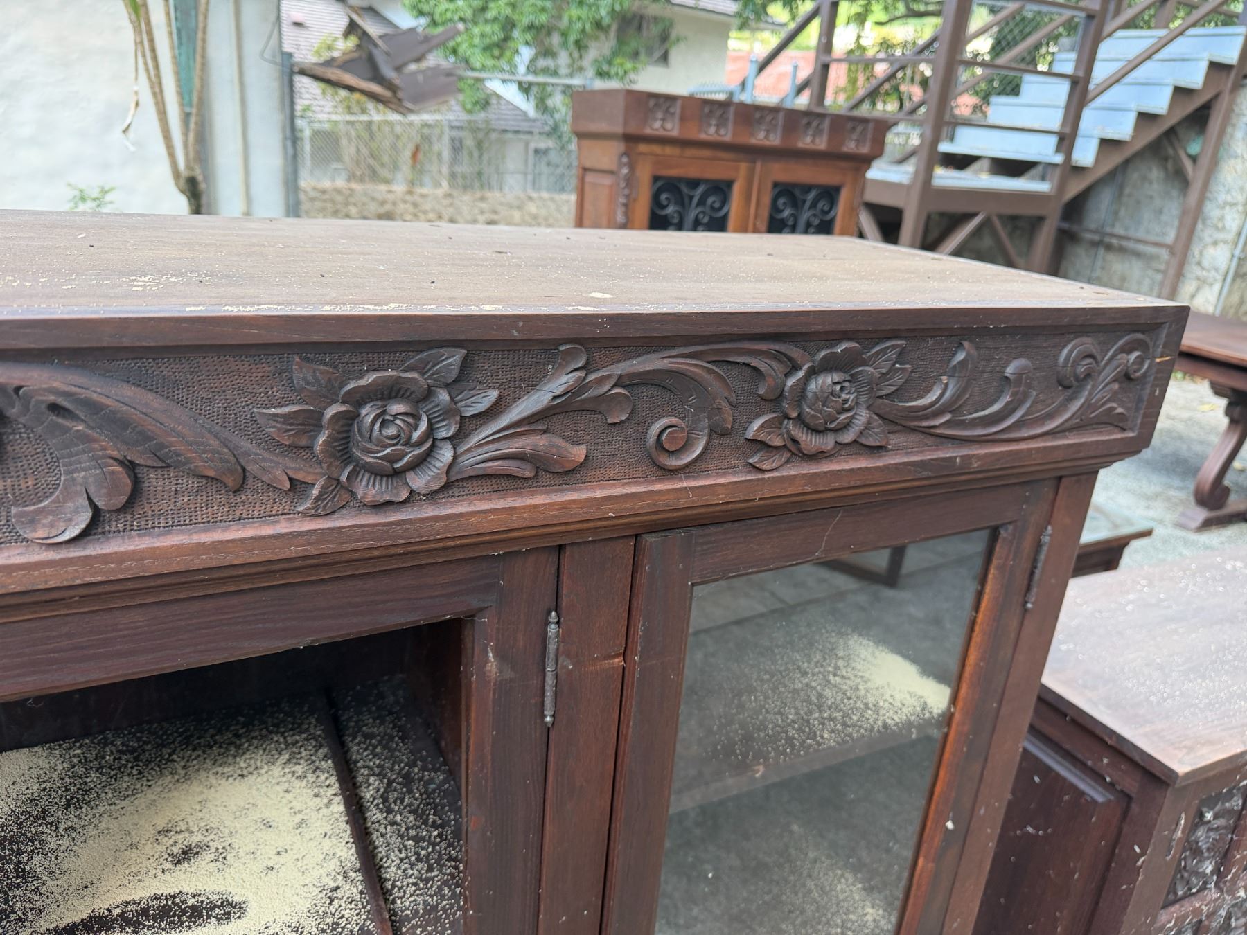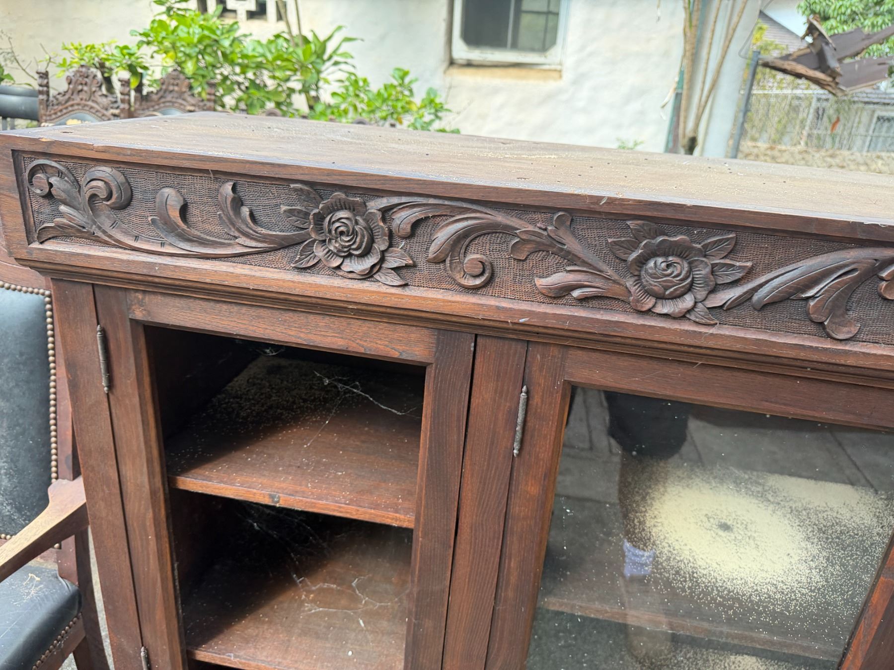 Carved Wooden Hutch Cabinet w/ Glass Doors & Inside Shelving 76" x 17" x 50"H