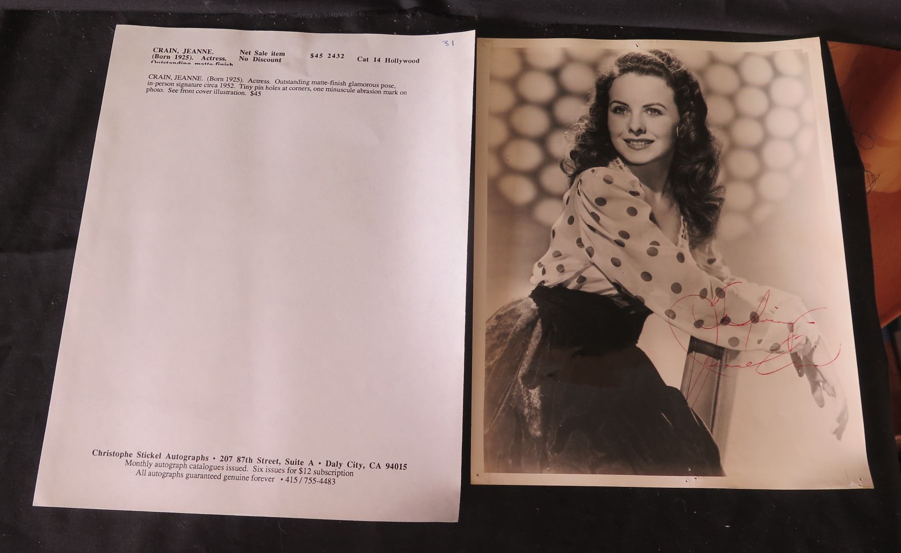 Celebrity Photo of Jeanne Crain w/ Bio, Signed, Unframed 8"x10"