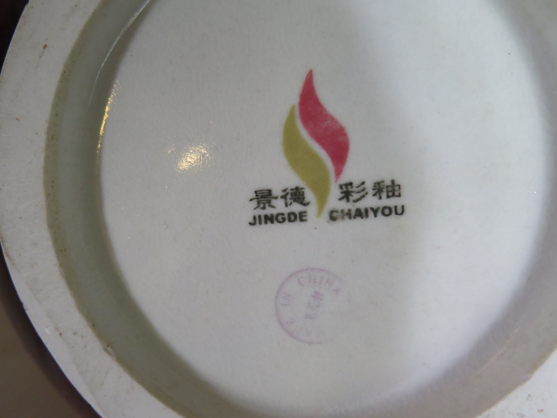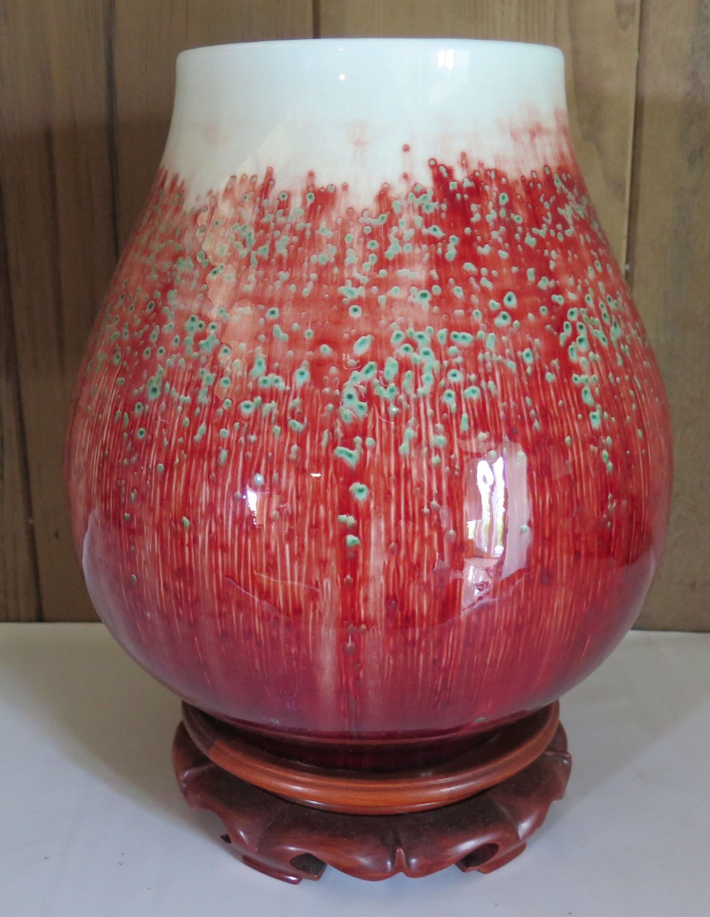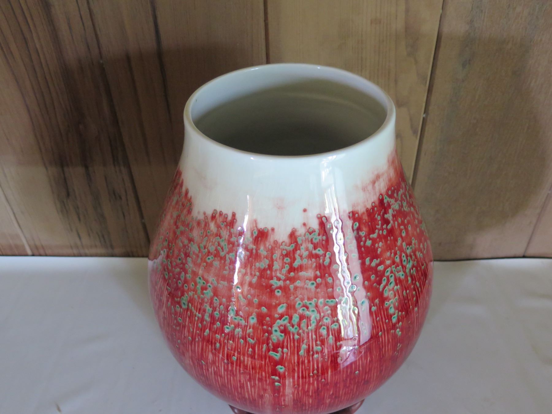 Ceramic Urn on Wood Stand, Jingde Chaiyou Glazed Red/White & Green 11" Tall