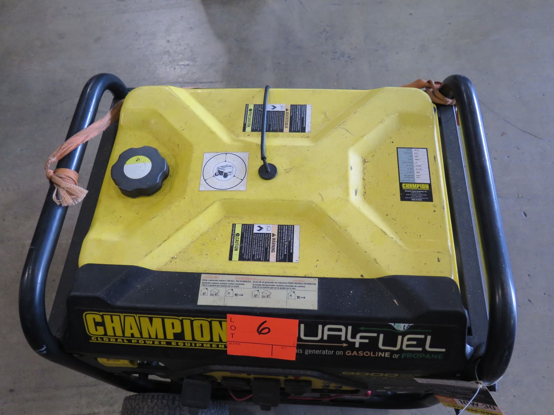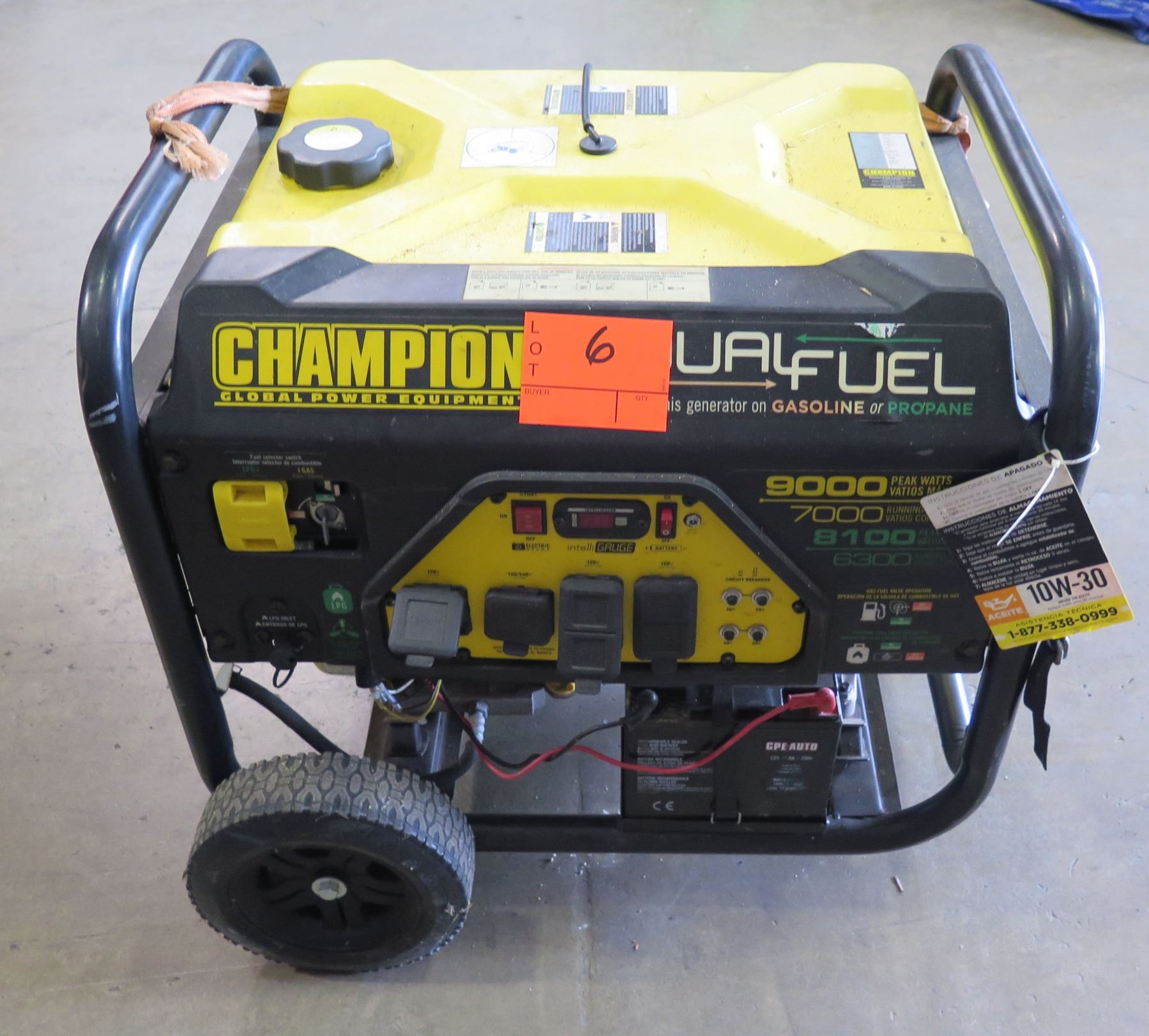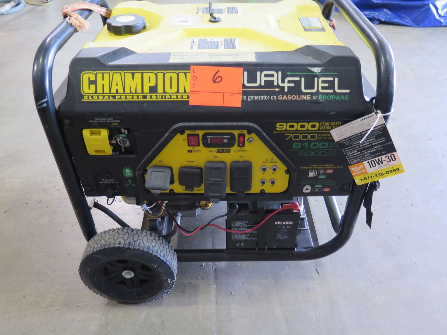 Champion 7000W Generator, Dual Fuel. Generator starts with a jump from a power pack. Sold as is with no warranties or guarantees.