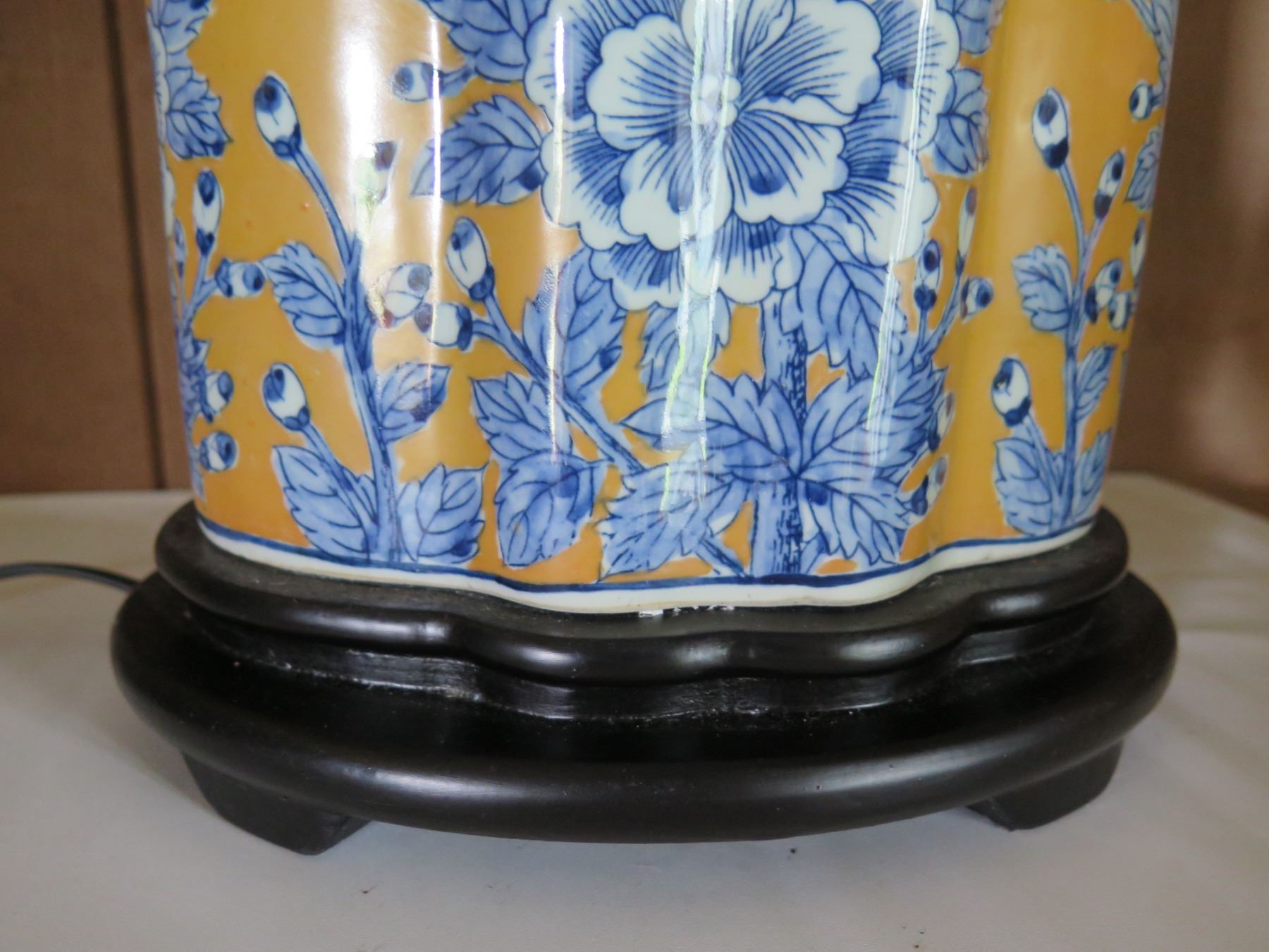 Chinese Ceramic Ginger Jar Lamp, Yellow & Blue, Wood Base, 26" Tall