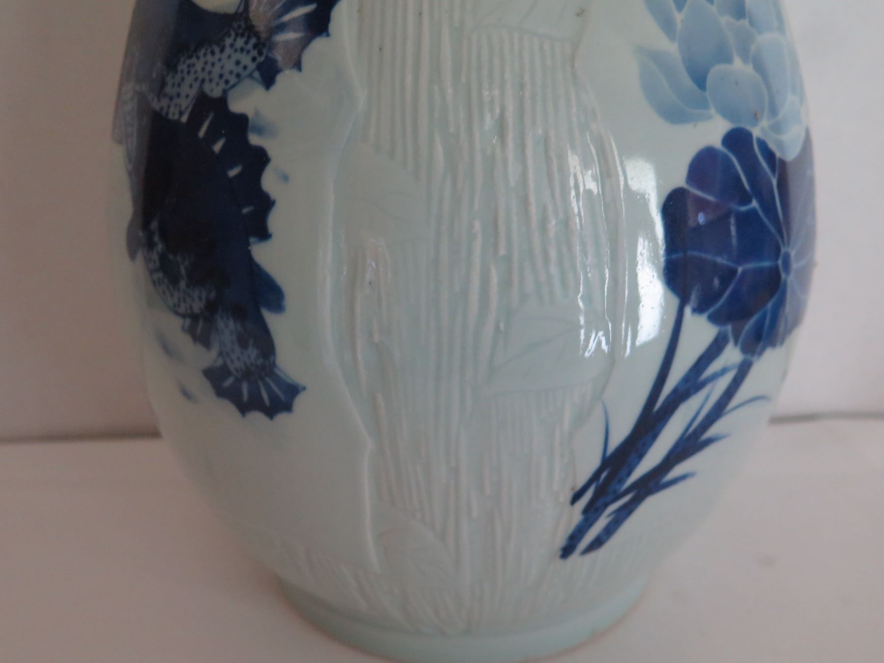 Chinese Ceramic Vase, Fish & Lotis Motif w/Chinese Characters, Blue/White 14" x 9"