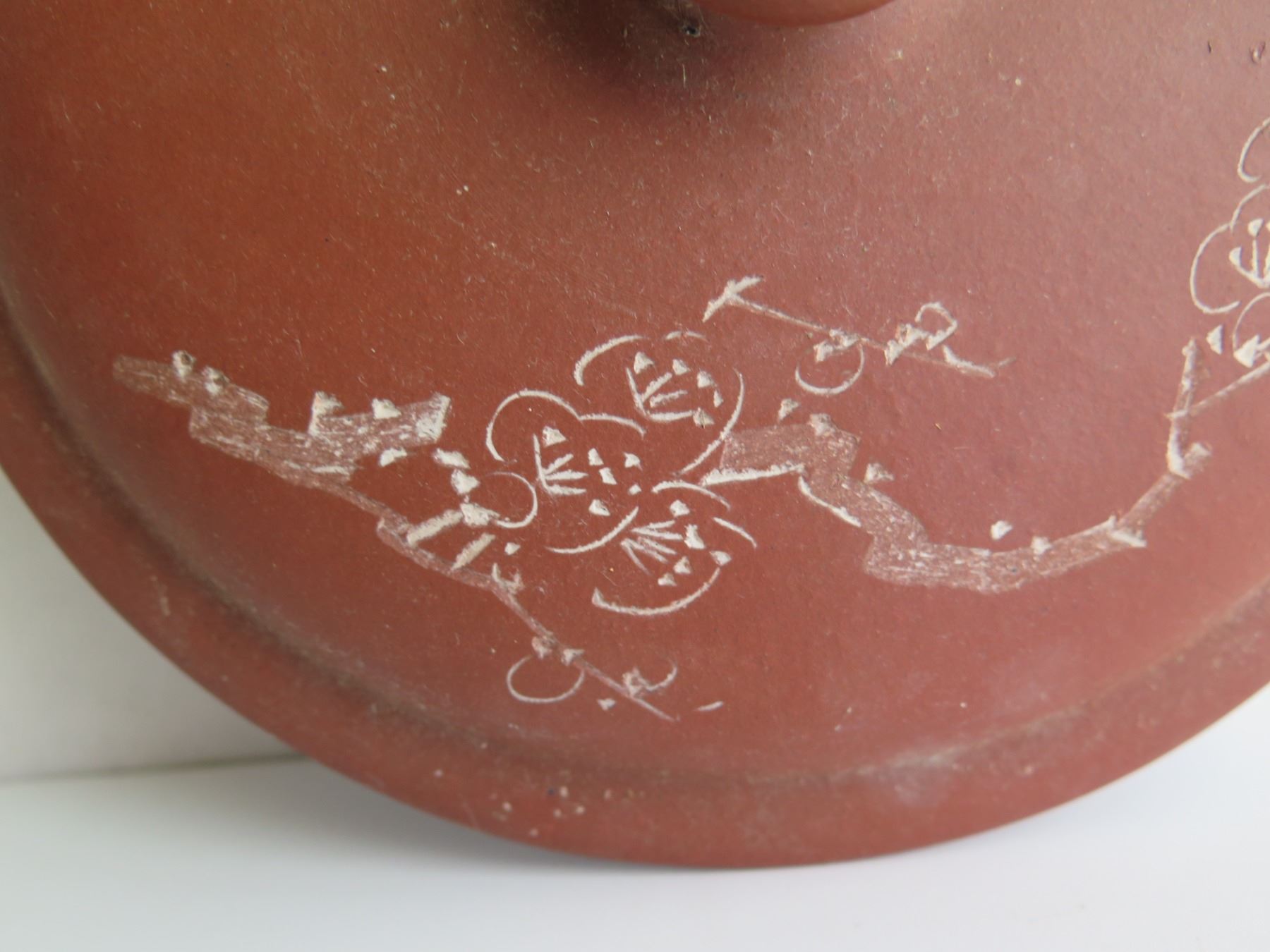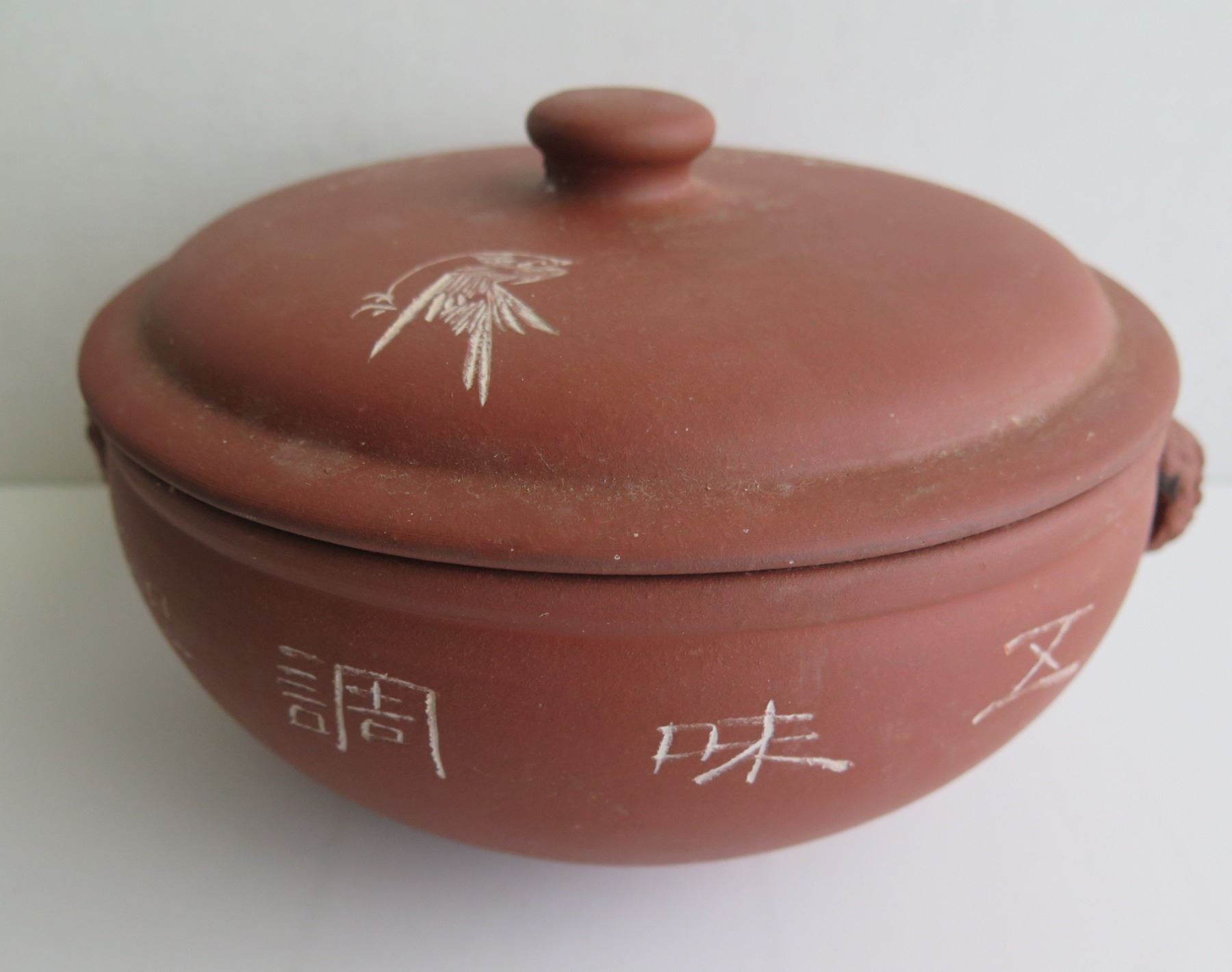 Chinese Clay Lidded Bowl w/ Inscribed Chinese Symbols, Terracotta, 5.5" Tall